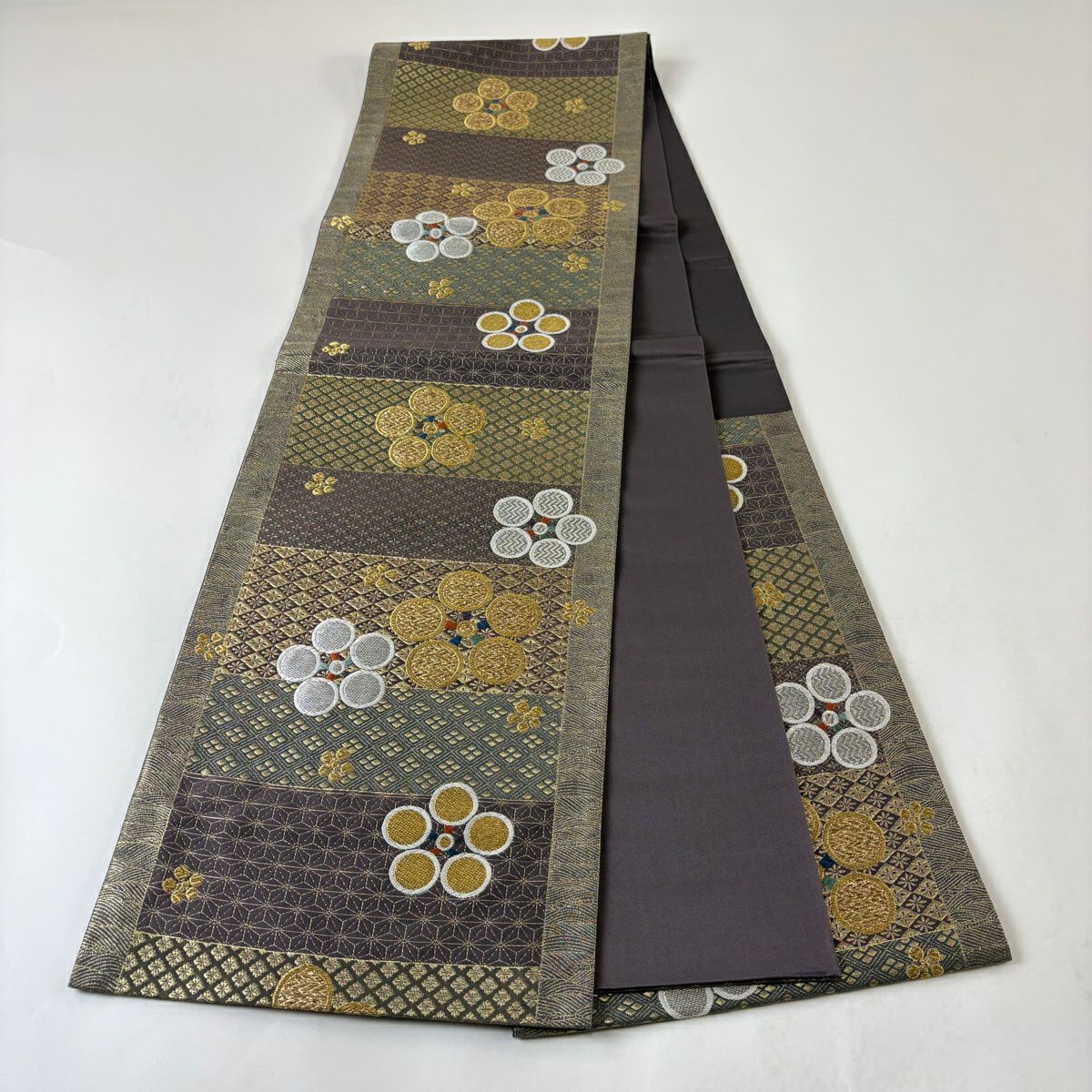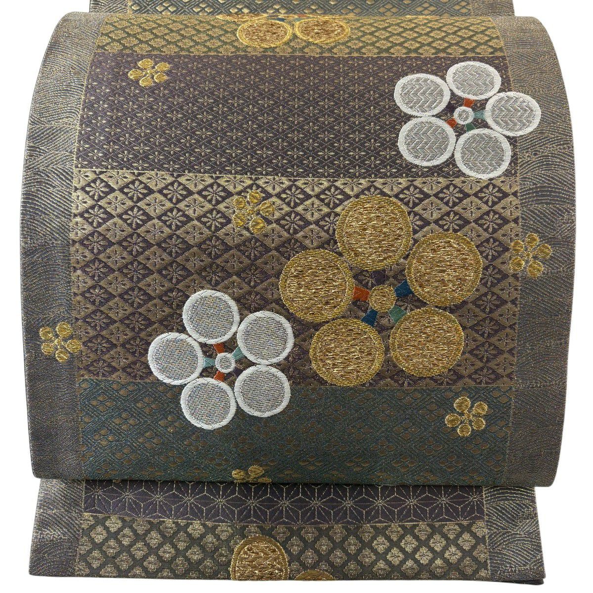 30%OFF 名古屋帯 秀品 幾何学模様 金糸 灰色 正絹 K30