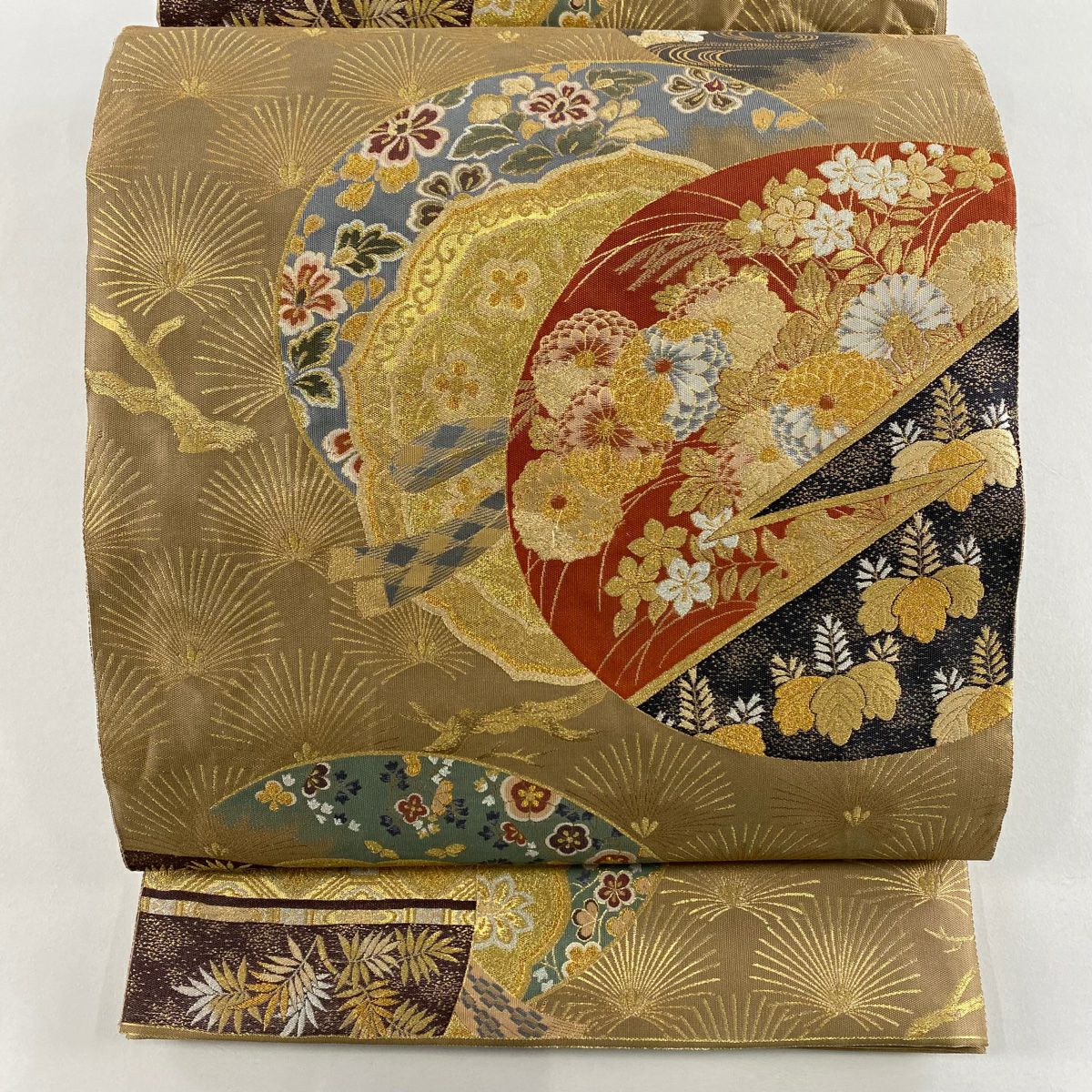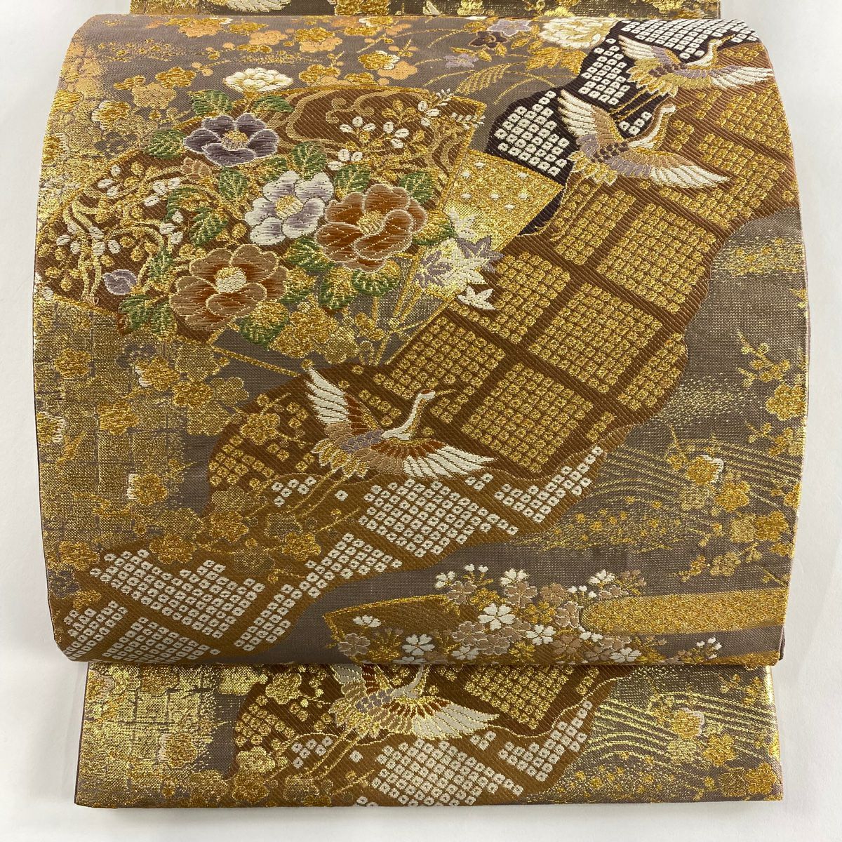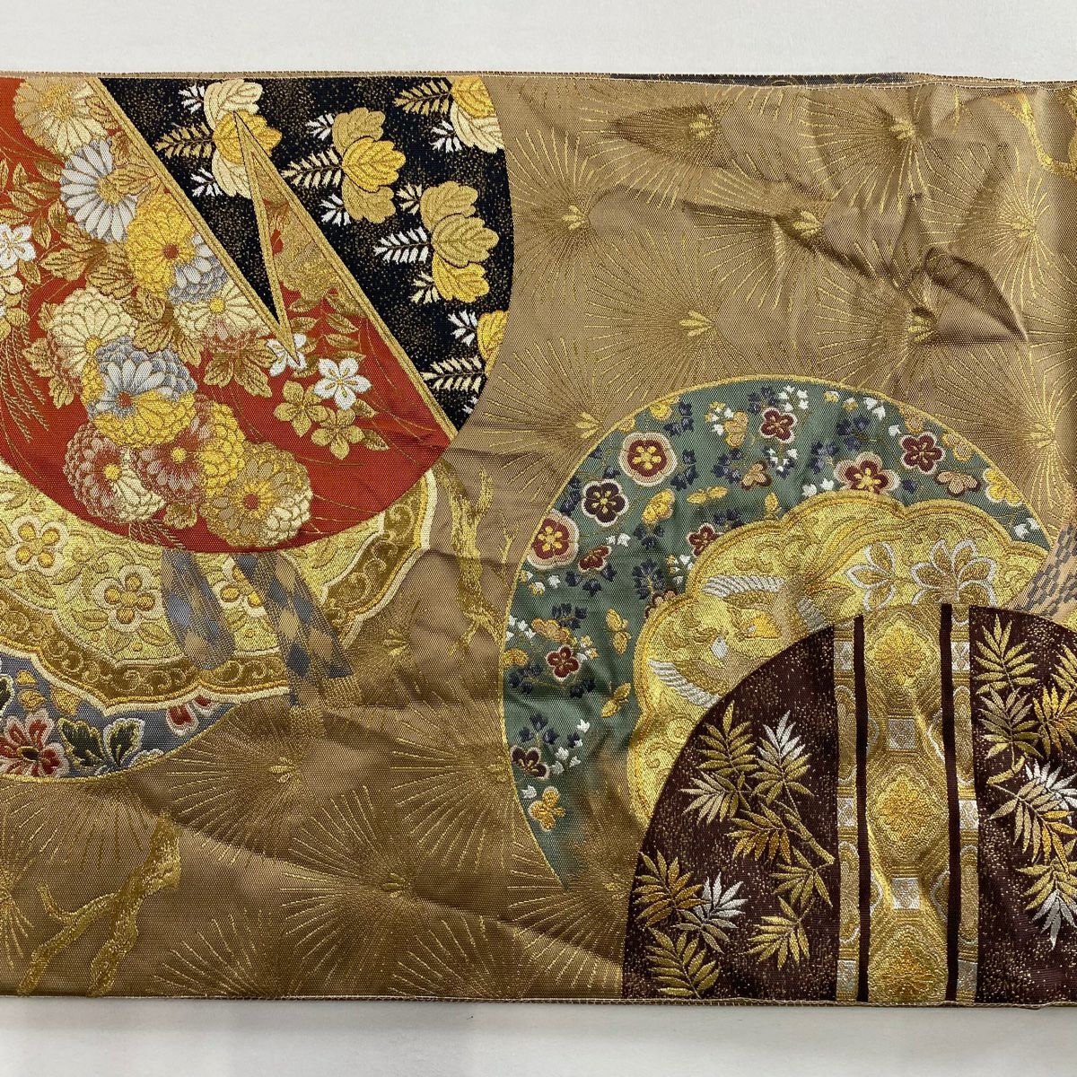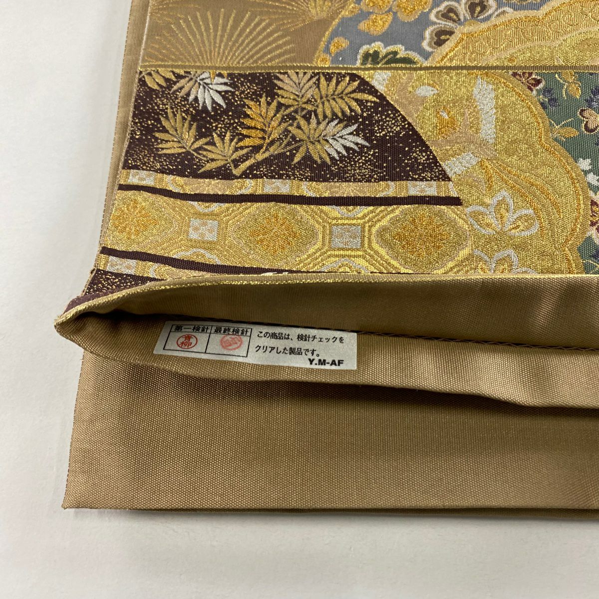 【在庫一掃】 袋帯 秀品 やまと 扇 鶴 金糸 箔 金色 六通 正絹