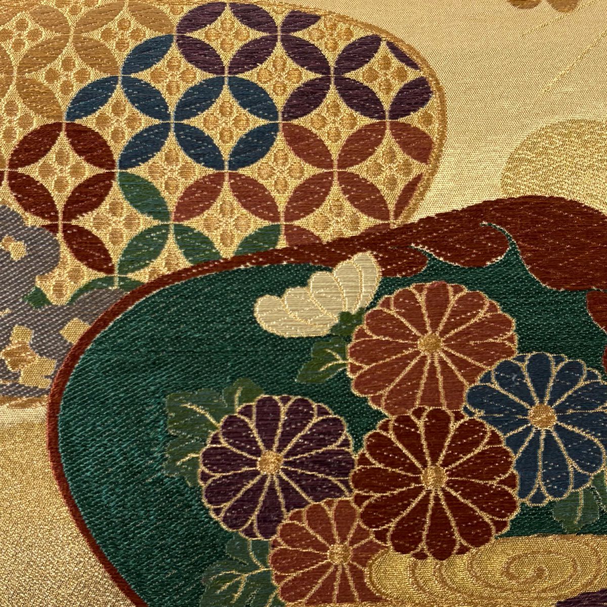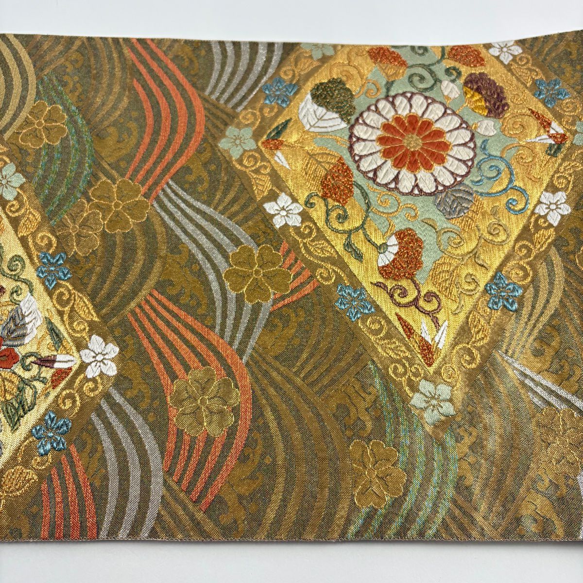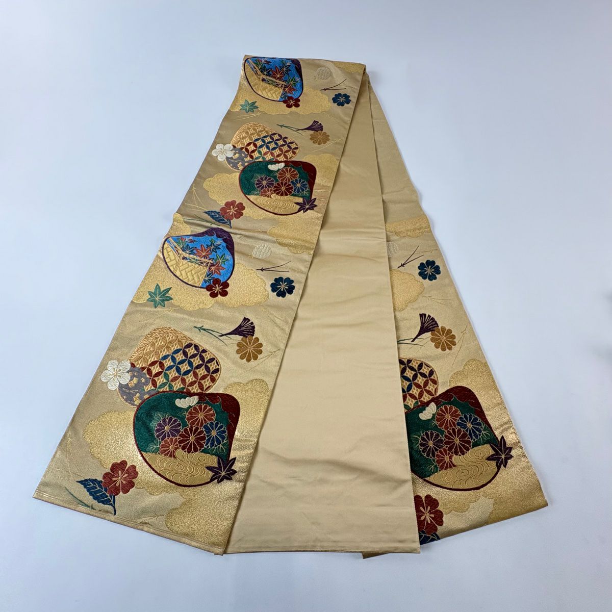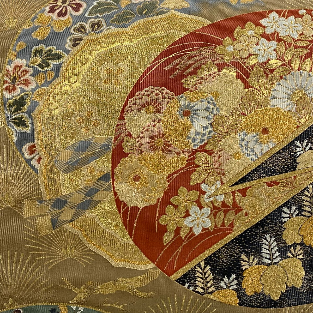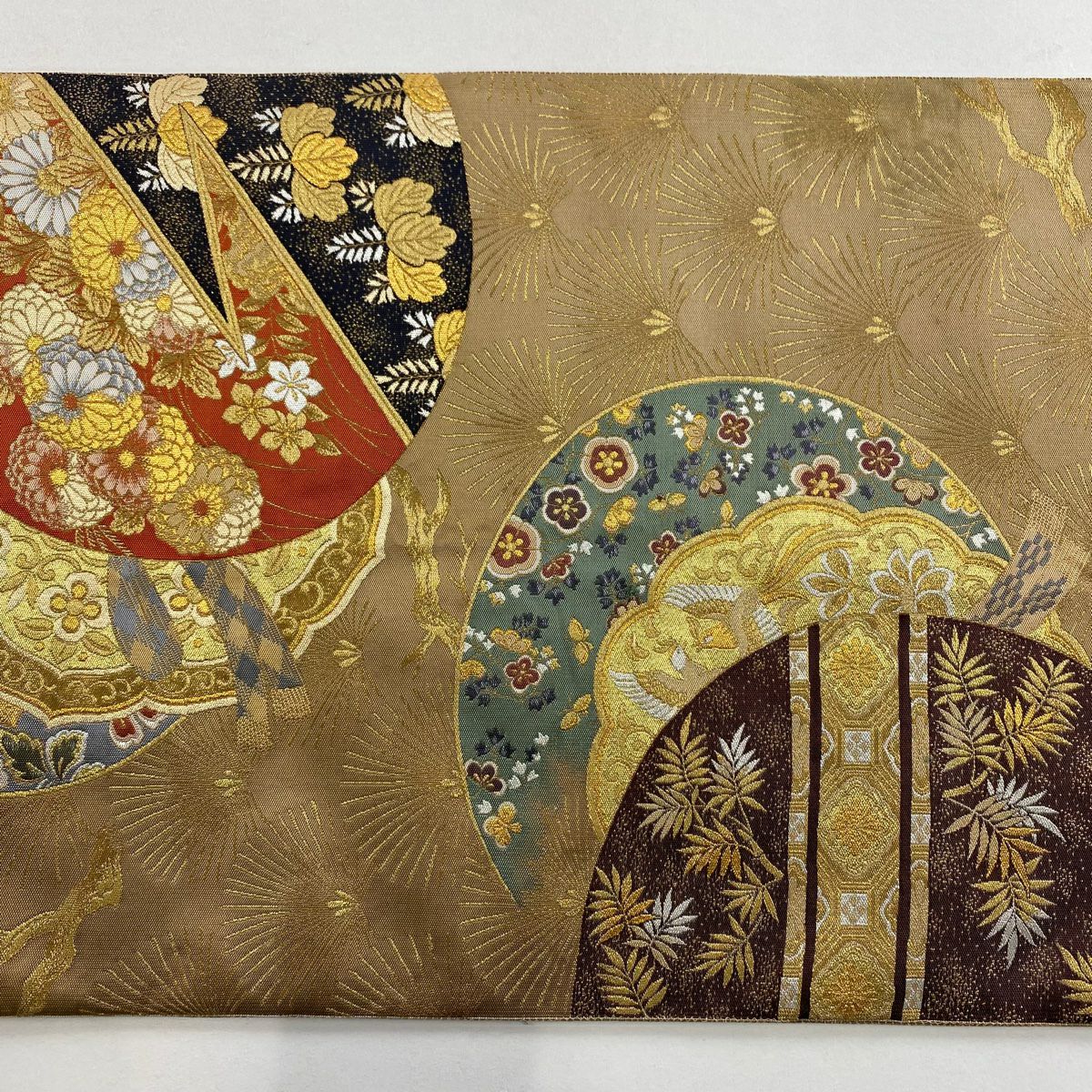 【在庫一掃】 袋帯 秀品 やまと 扇 鶴 金糸 箔 金色 六通 正絹