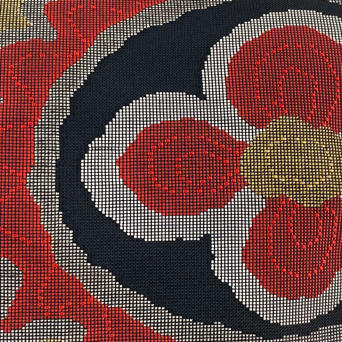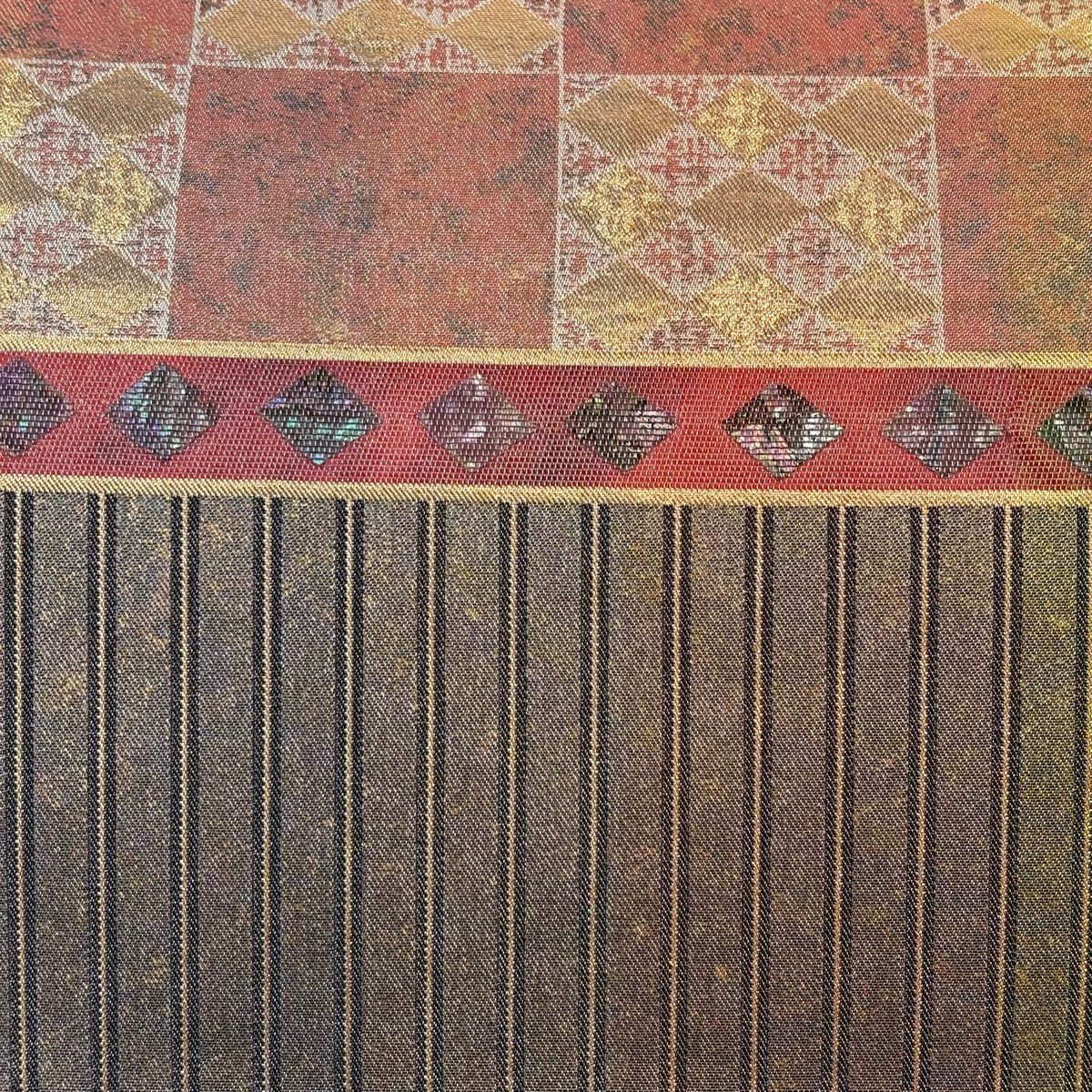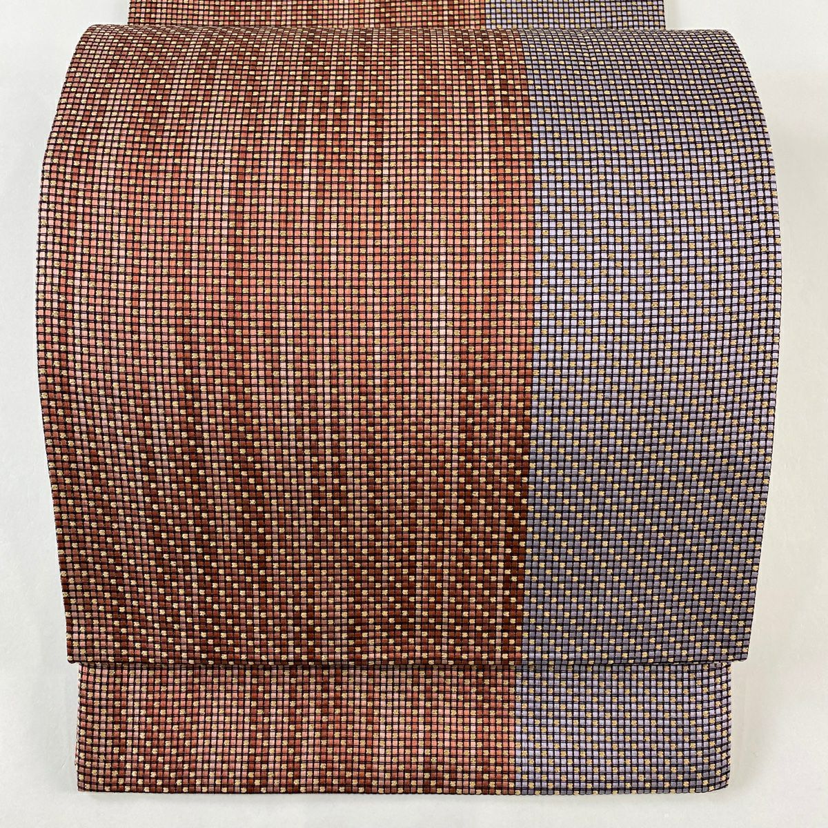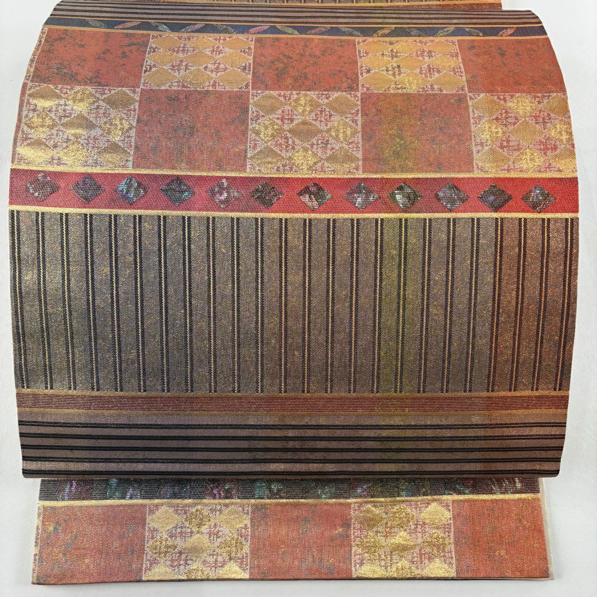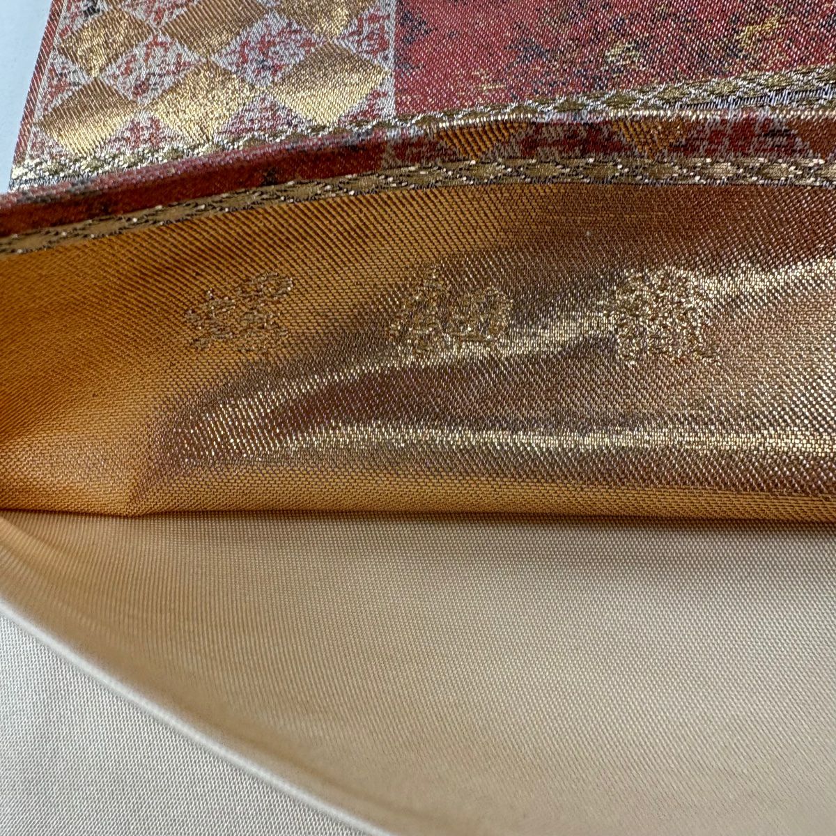 【在庫一掃】 【美品】 袋帯 秀品 幾何学模様 箔 茜色 全通 正絹