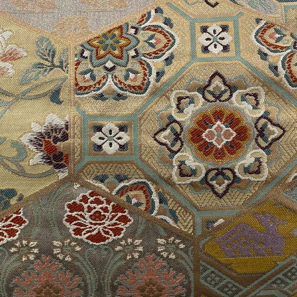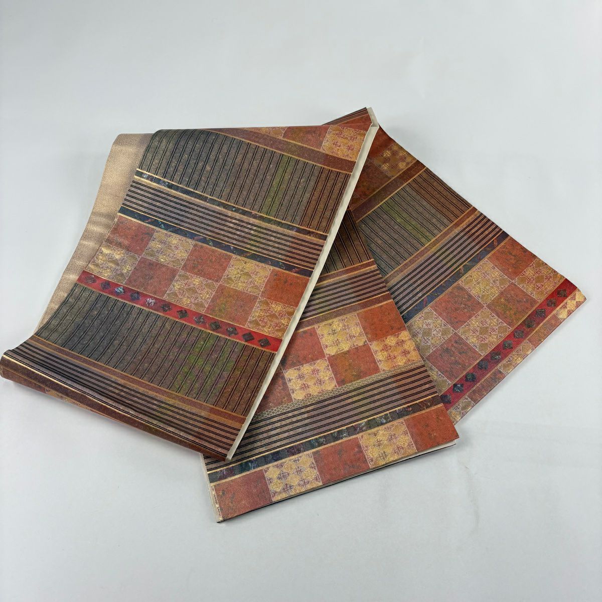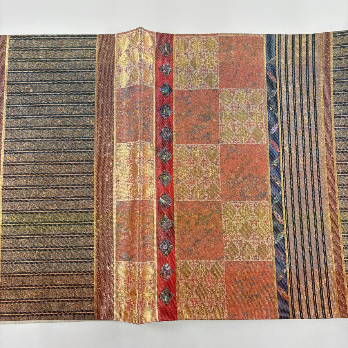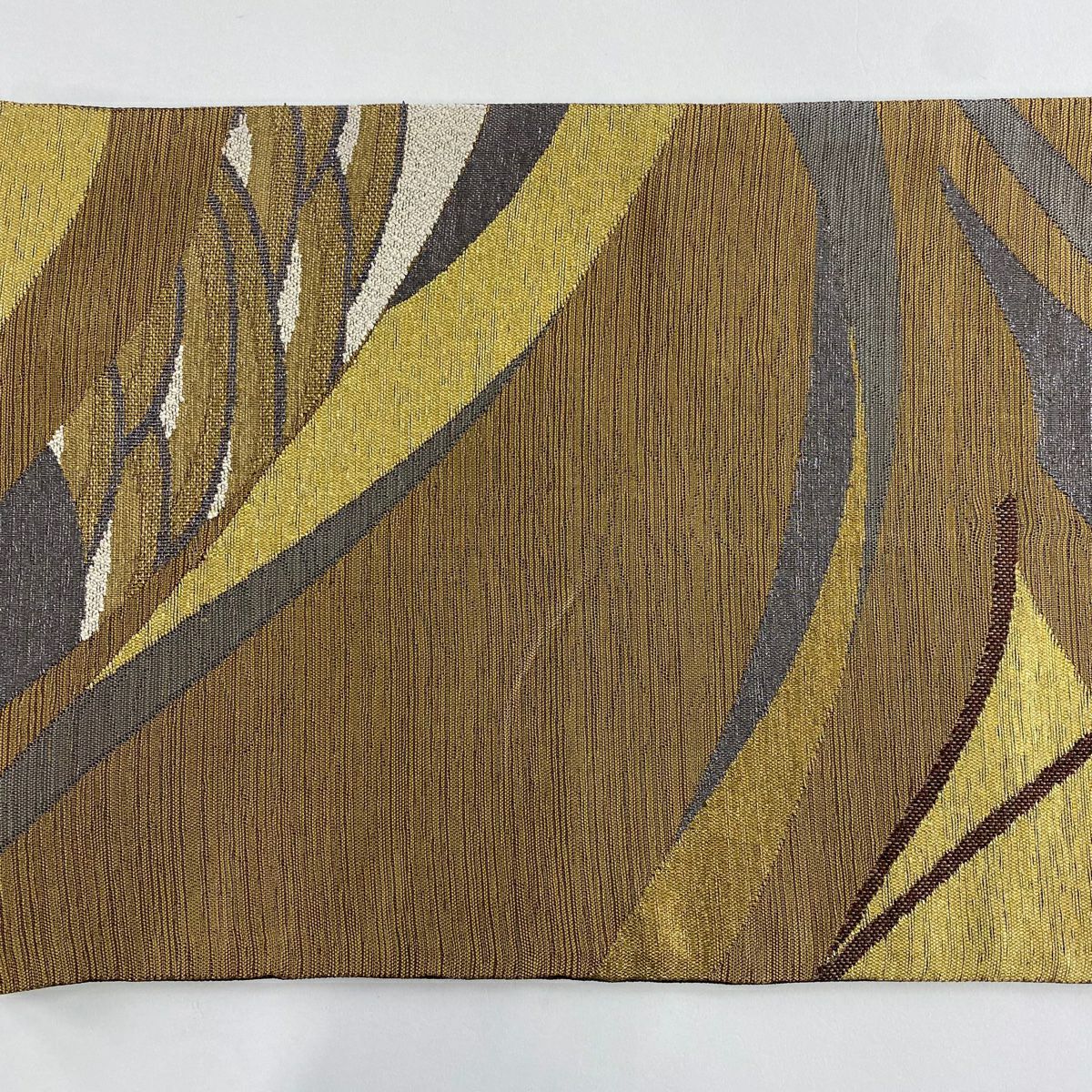 【在庫一掃】 【美品】 袋帯 秀品 幾何学 金糸 箔 金茶 六通 正絹