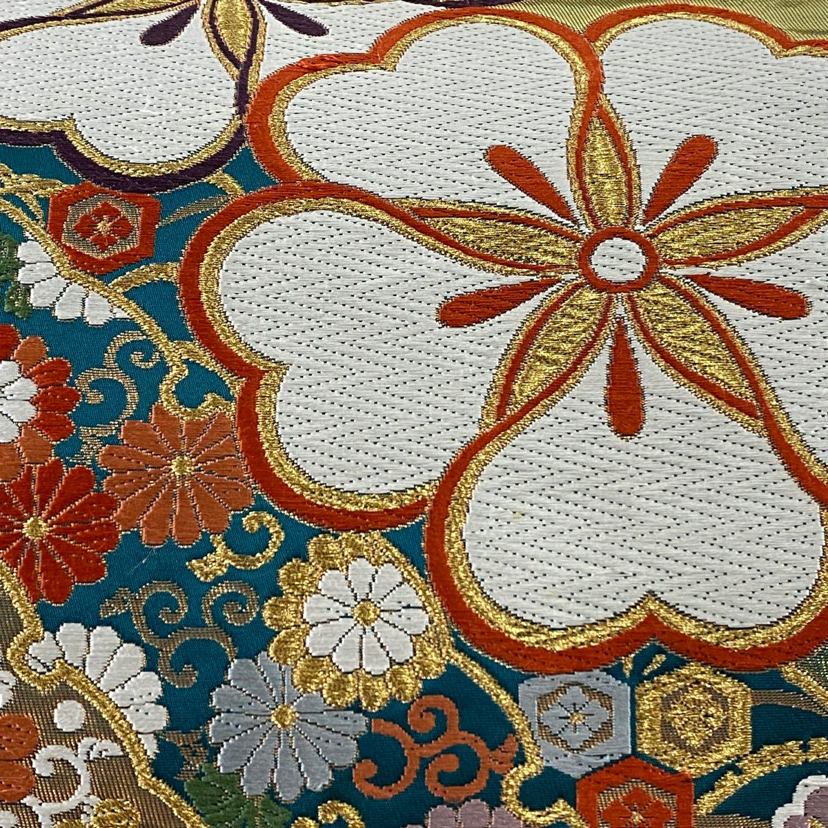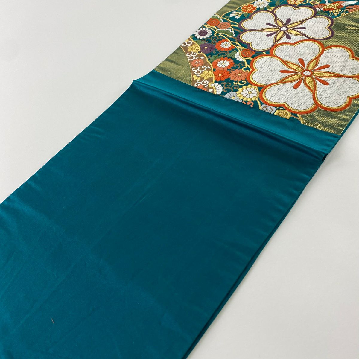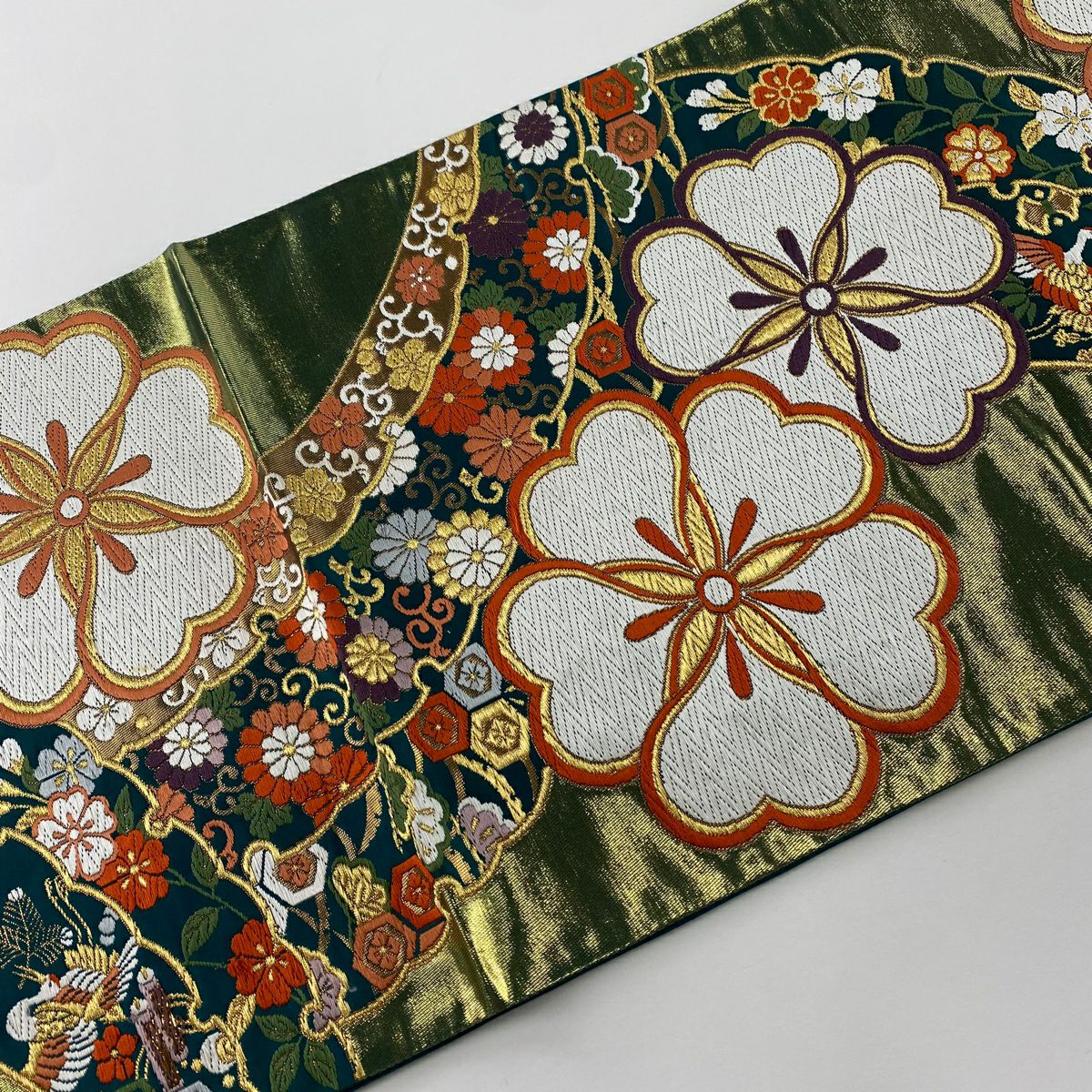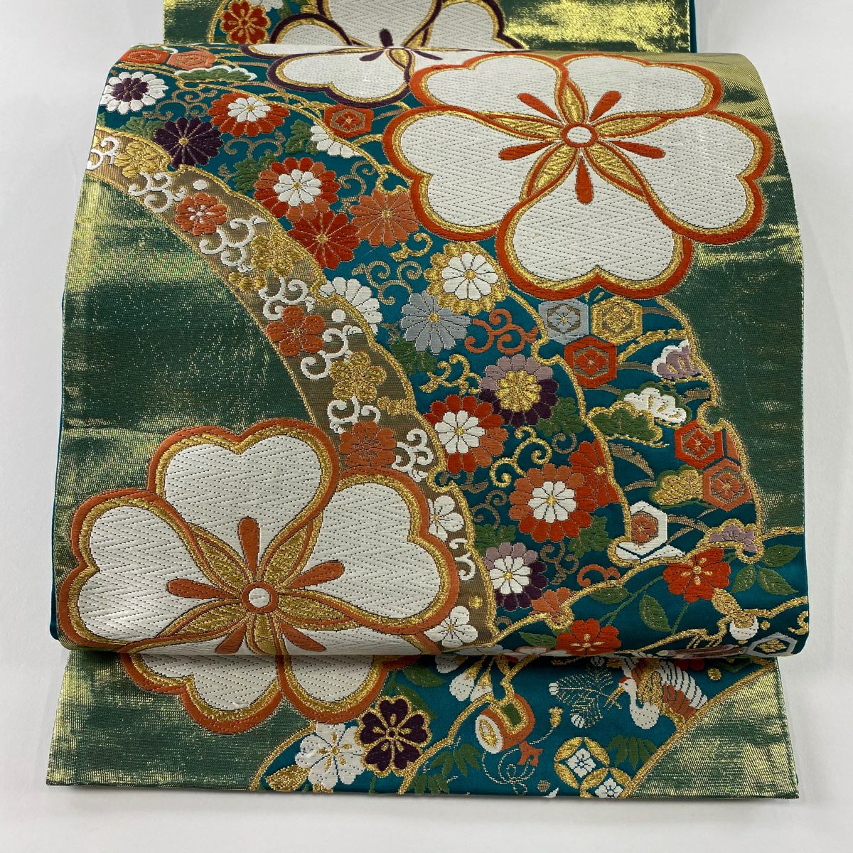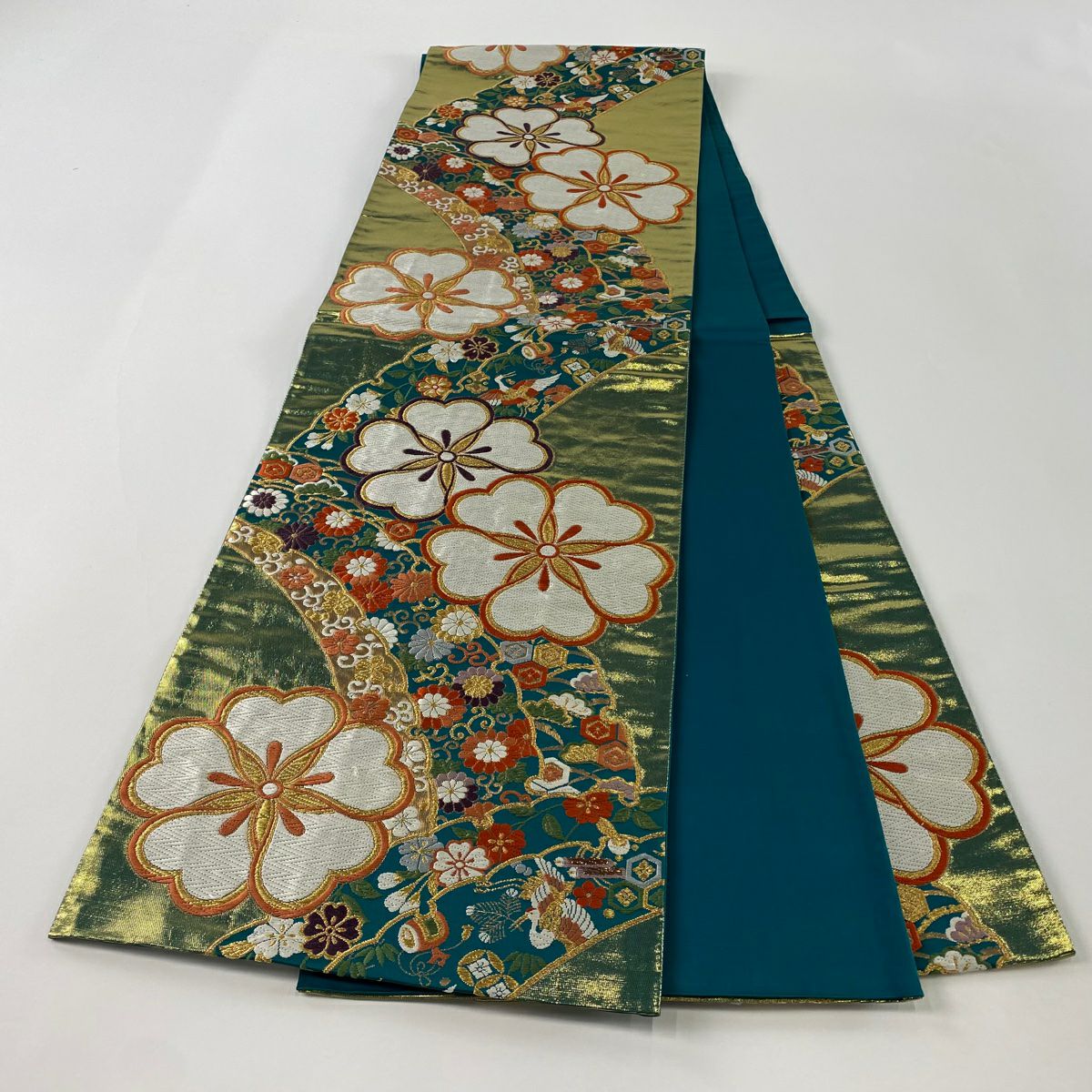 【在庫一掃】 袋帯 秀品 桜 宝尽くし 金糸 唐織 緑 六通 正絹