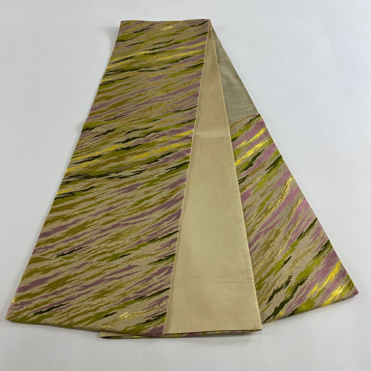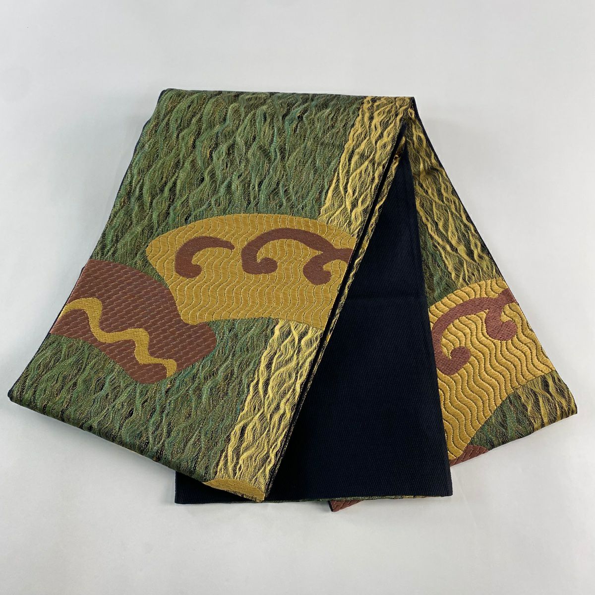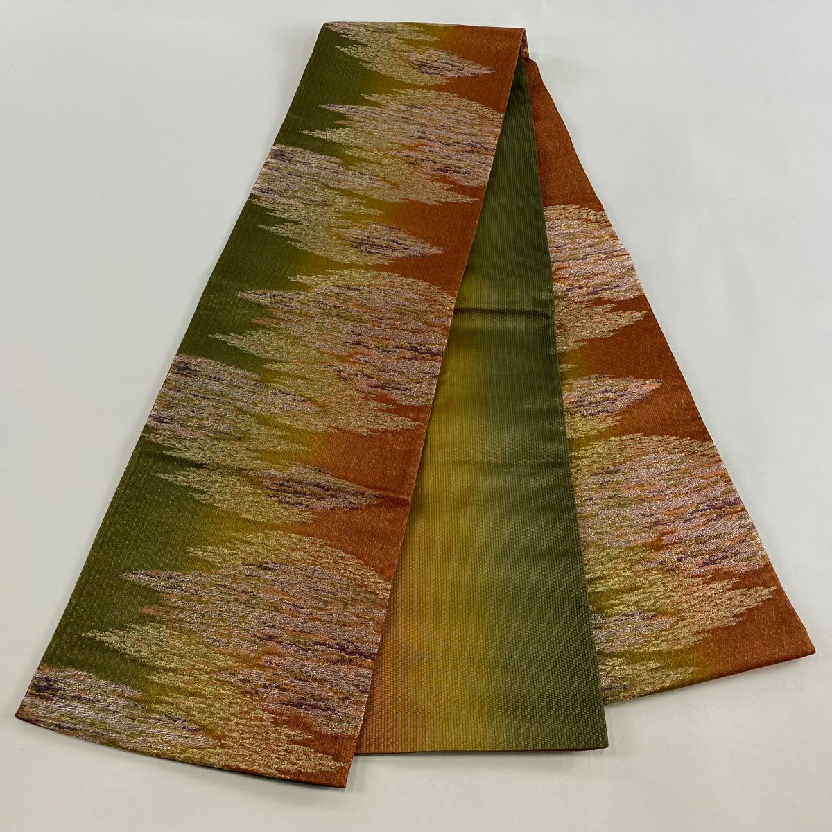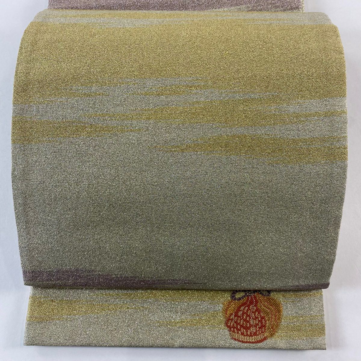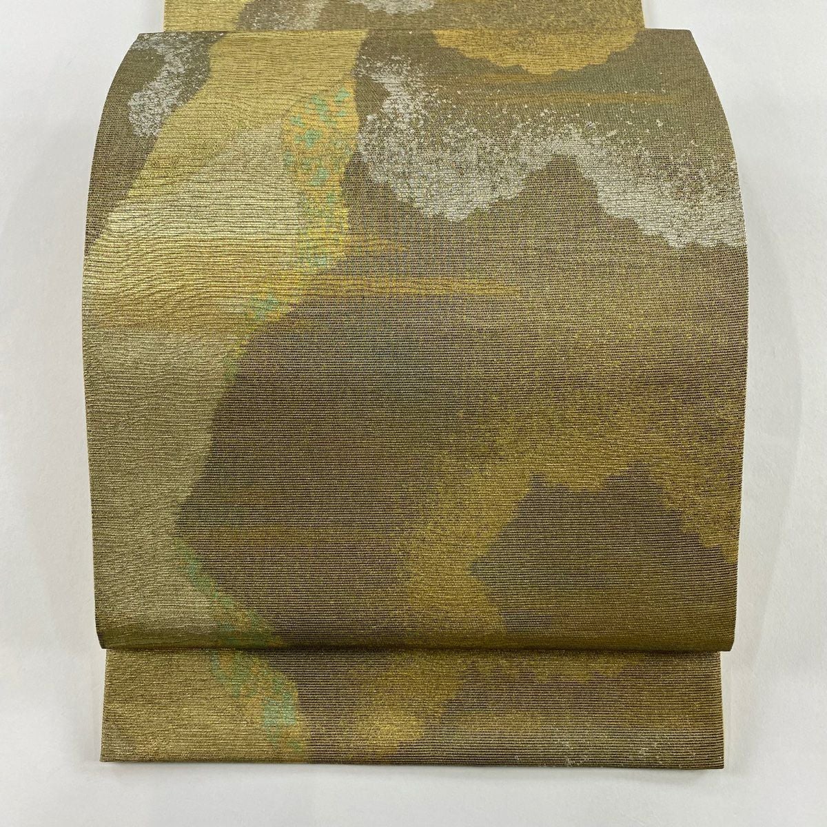 【在庫一掃】 【美品】 袋帯 秀品 霞 金糸 箔 茶緑色 六通 正絹