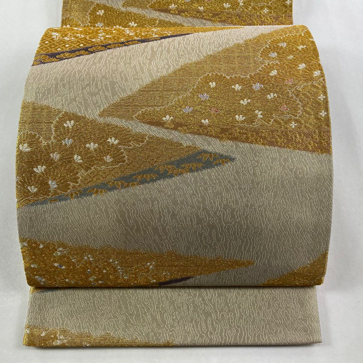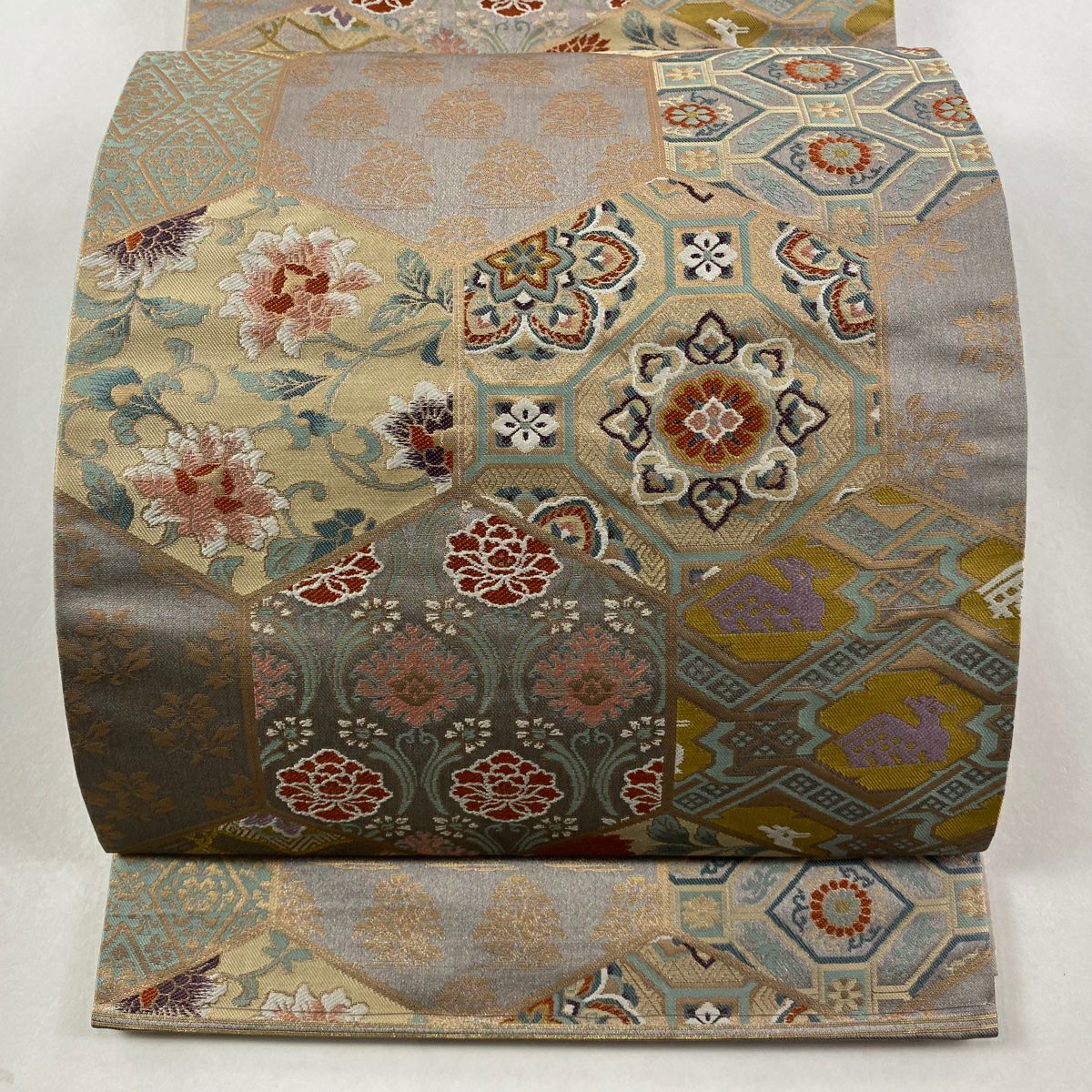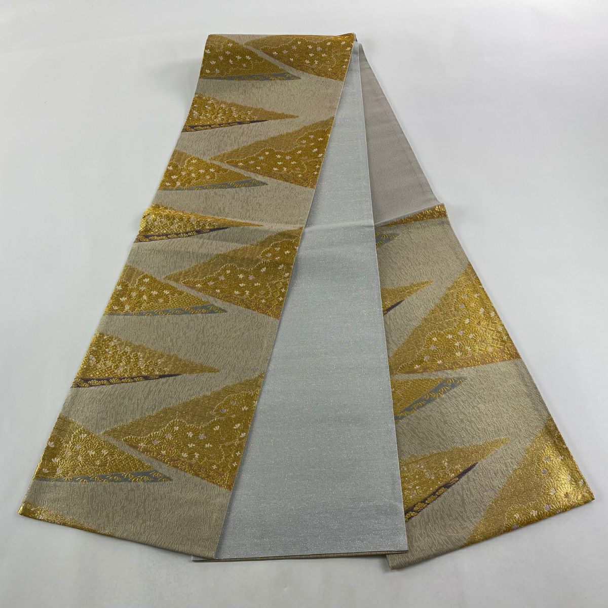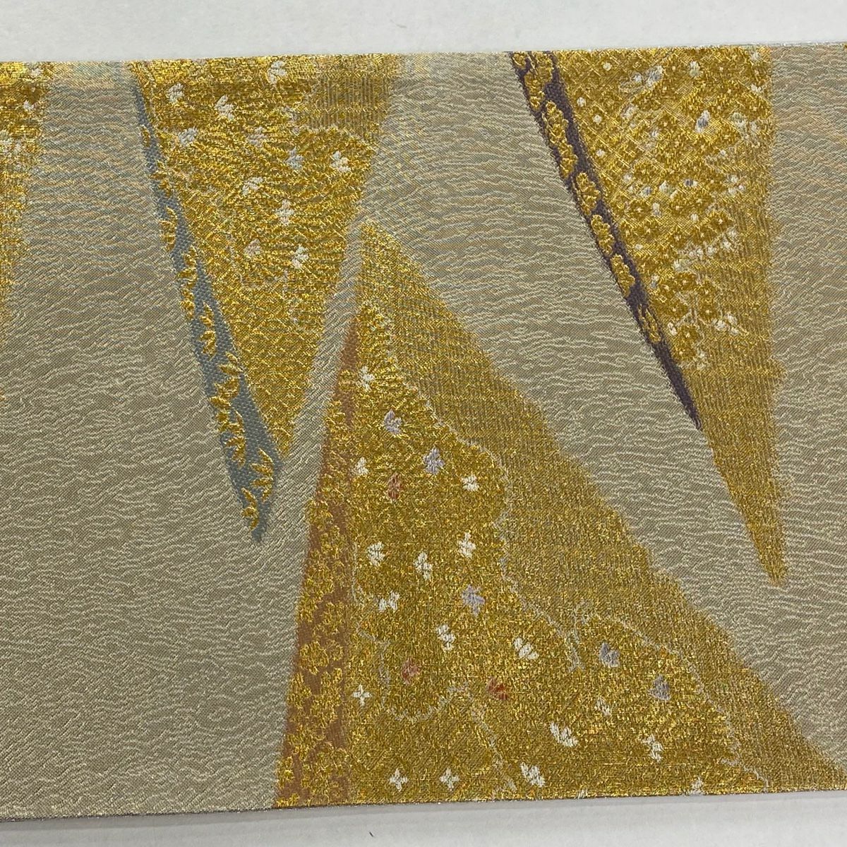 【在庫一掃】 【美品】 袋帯 秀品 幾何学 金糸 薄茶色 六通 正絹