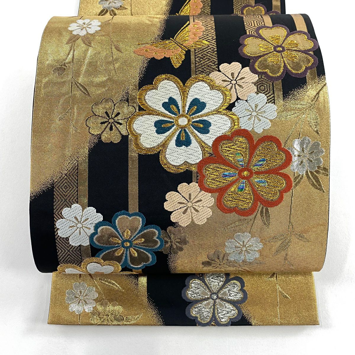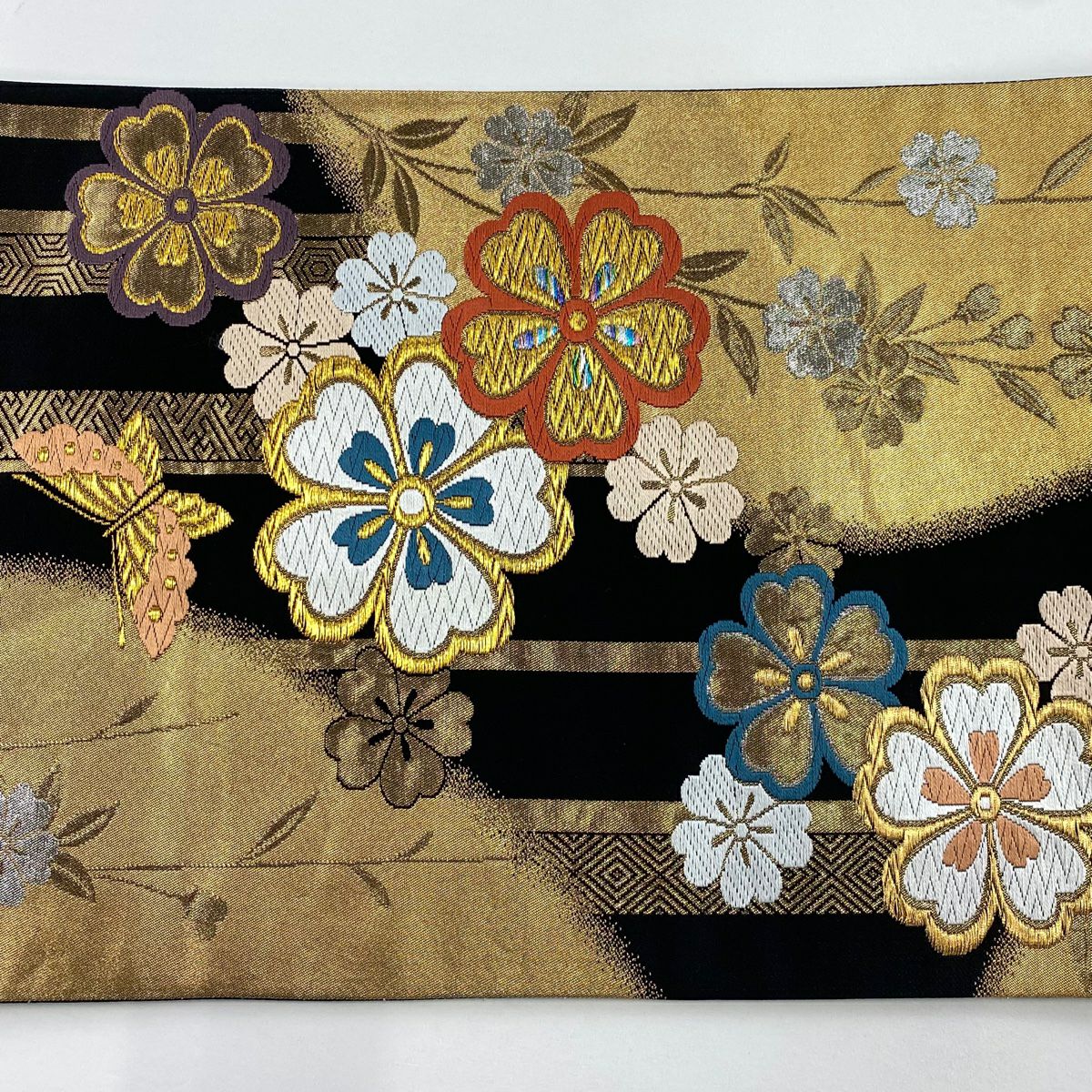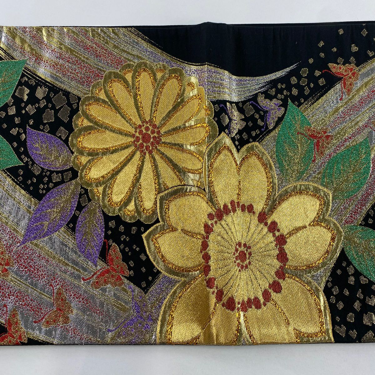 【在庫一掃】 【美品】 袋帯 秀品 花 蝶 箔 金糸 黒 六通 正絹