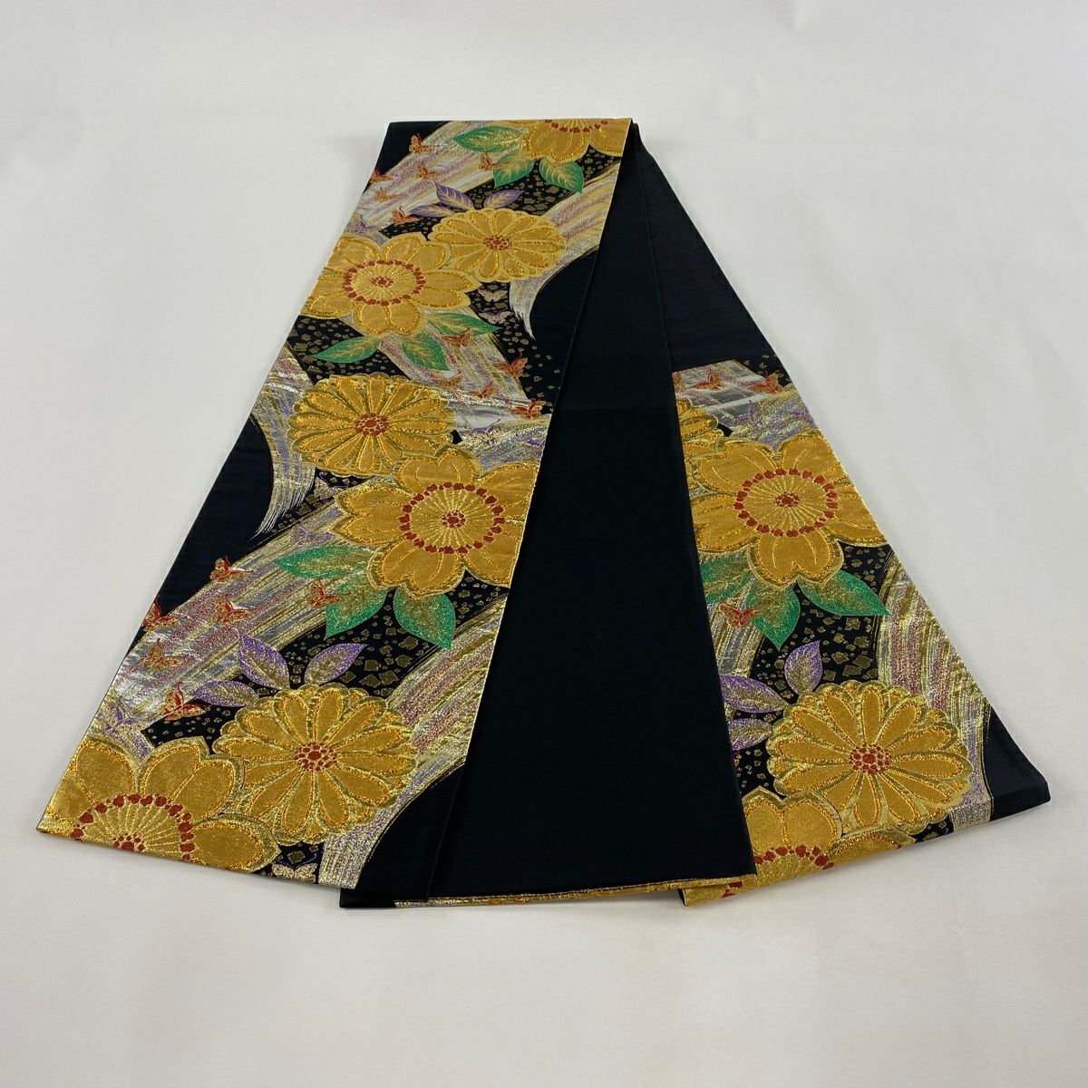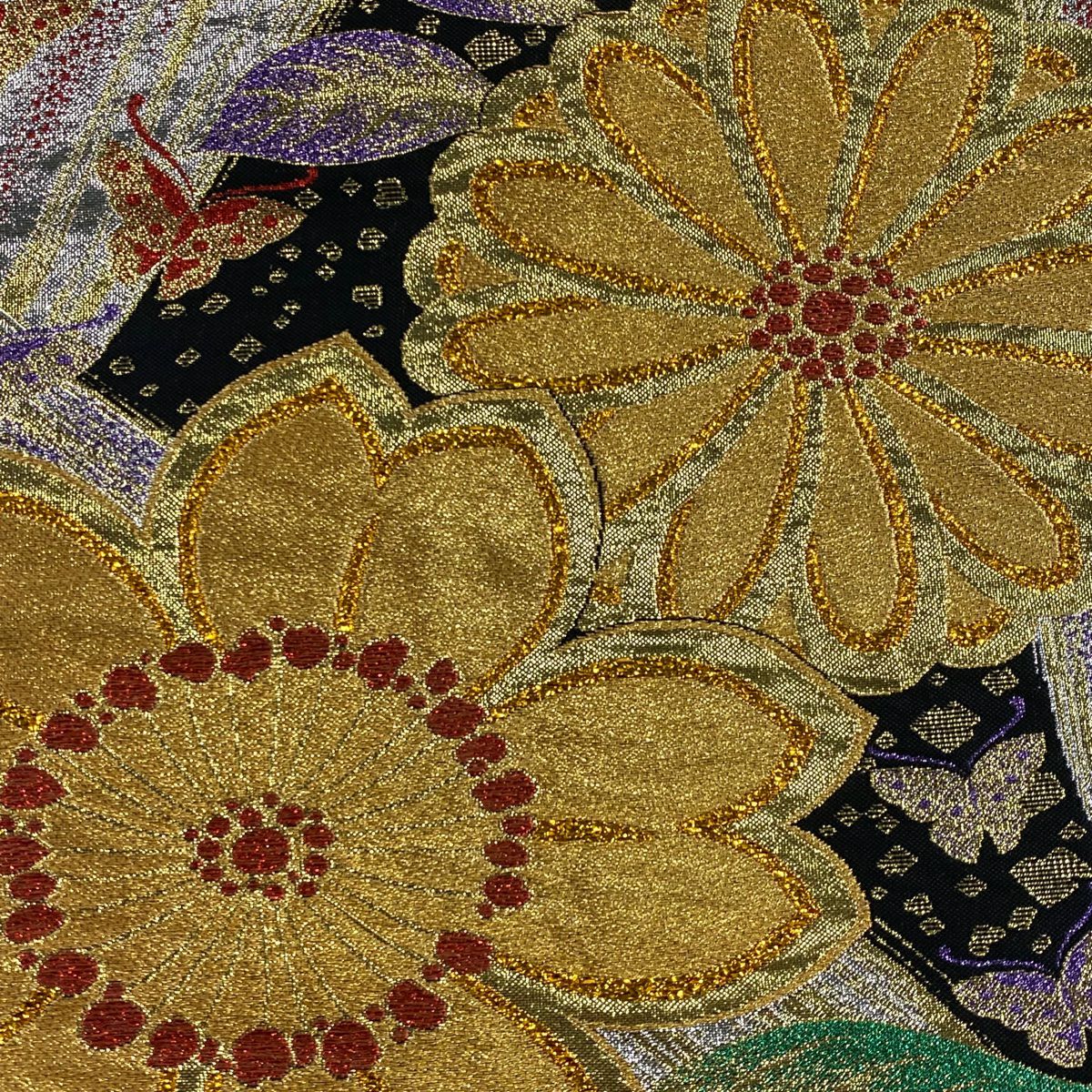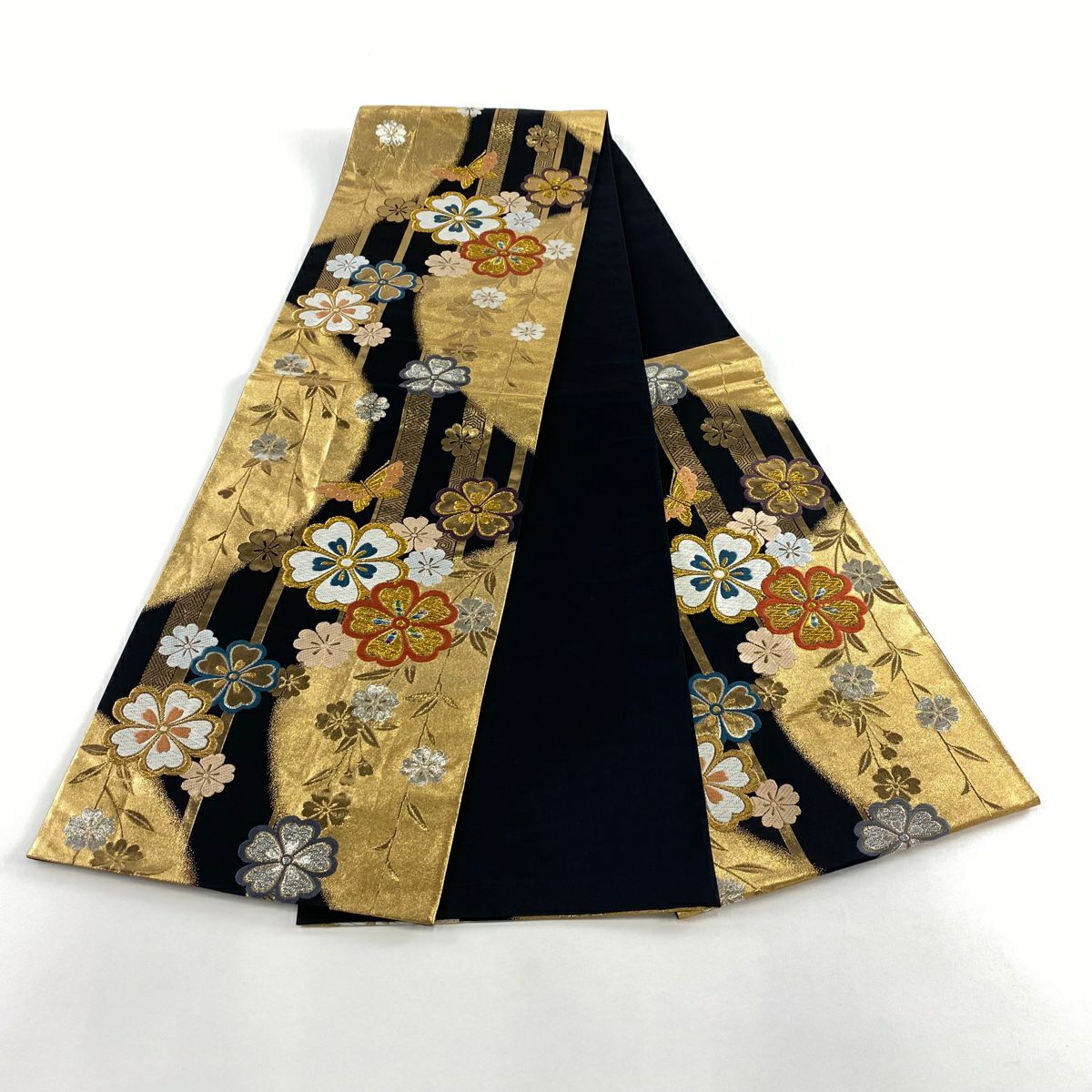 【在庫一掃】 【美品】 袋帯 秀品 花 蝶 箔 金糸 黒 六通 正絹