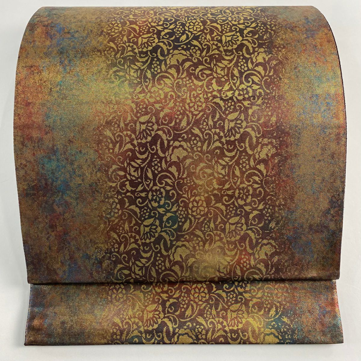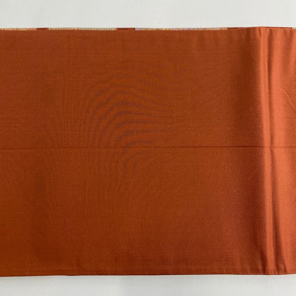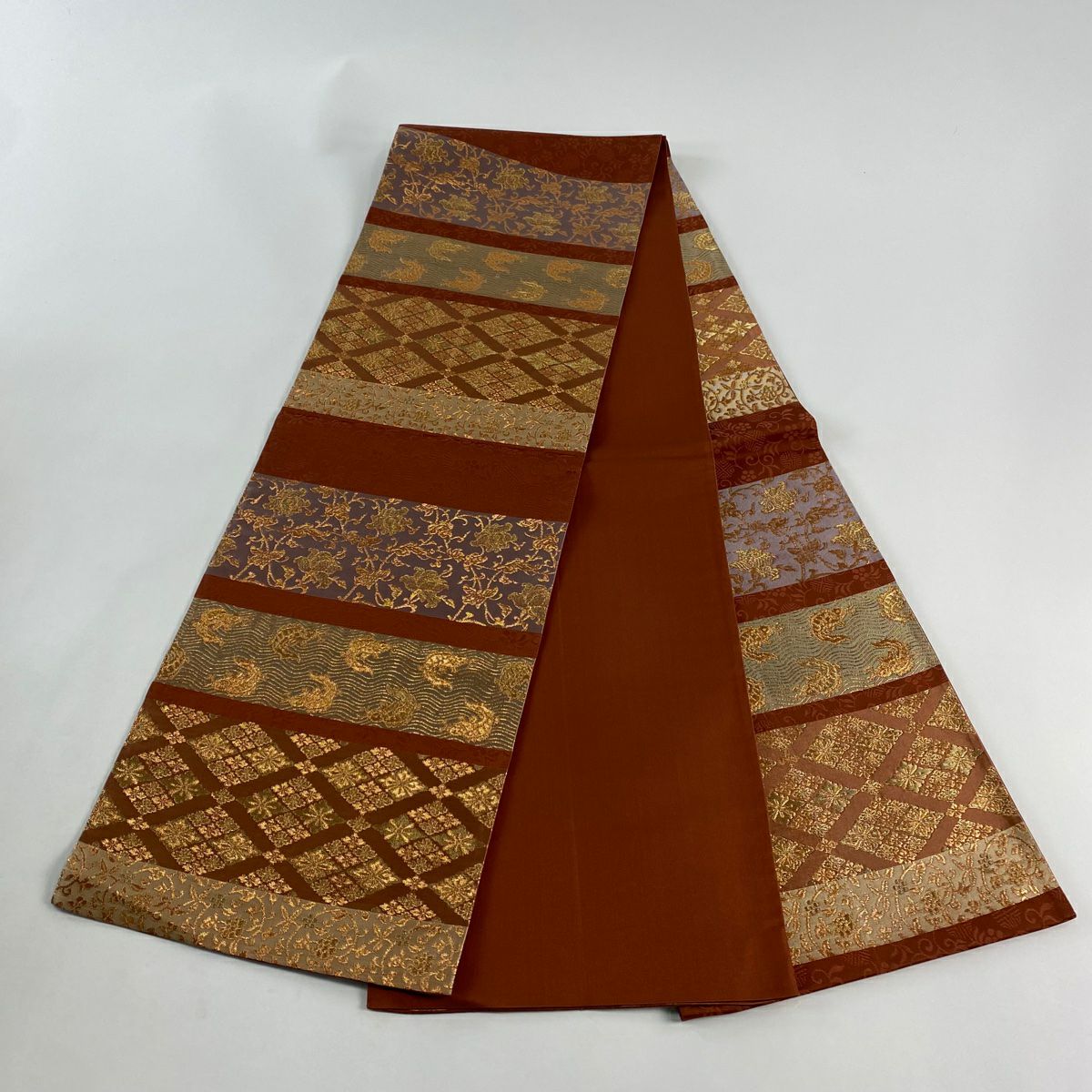 【在庫一掃】 袋帯 秀品 花唐草 幾何学模様 箔 赤茶 六通 正絹