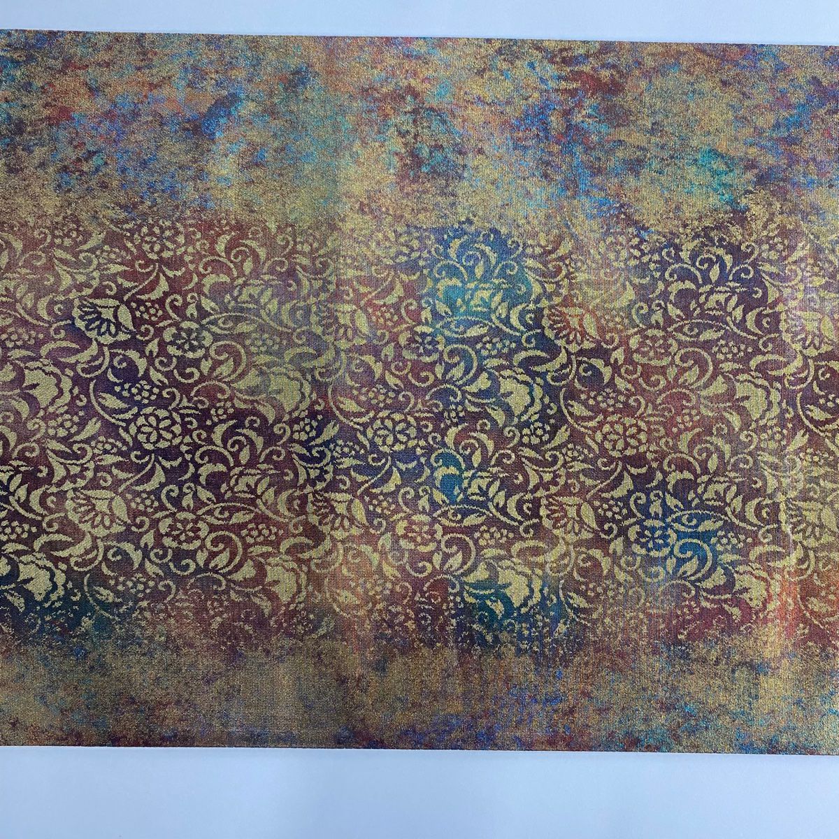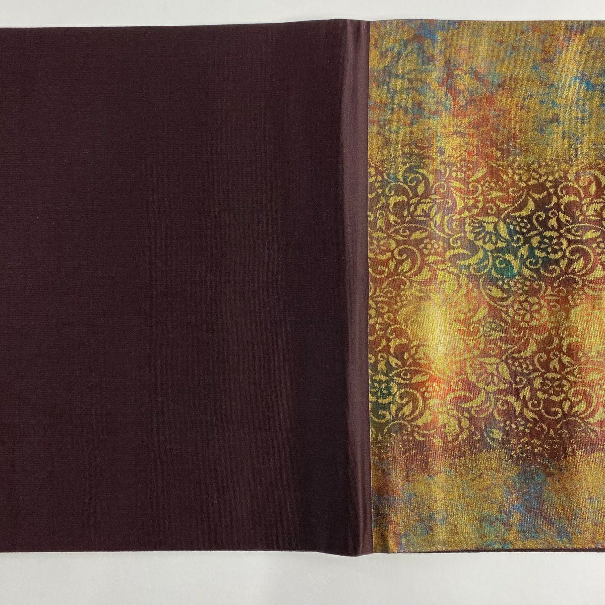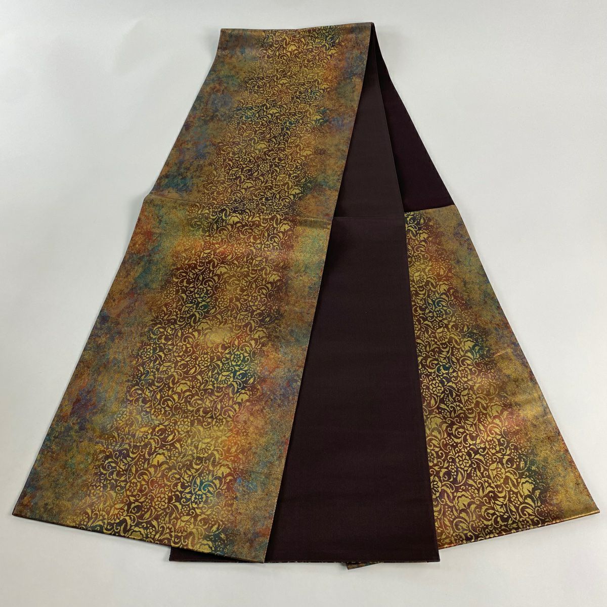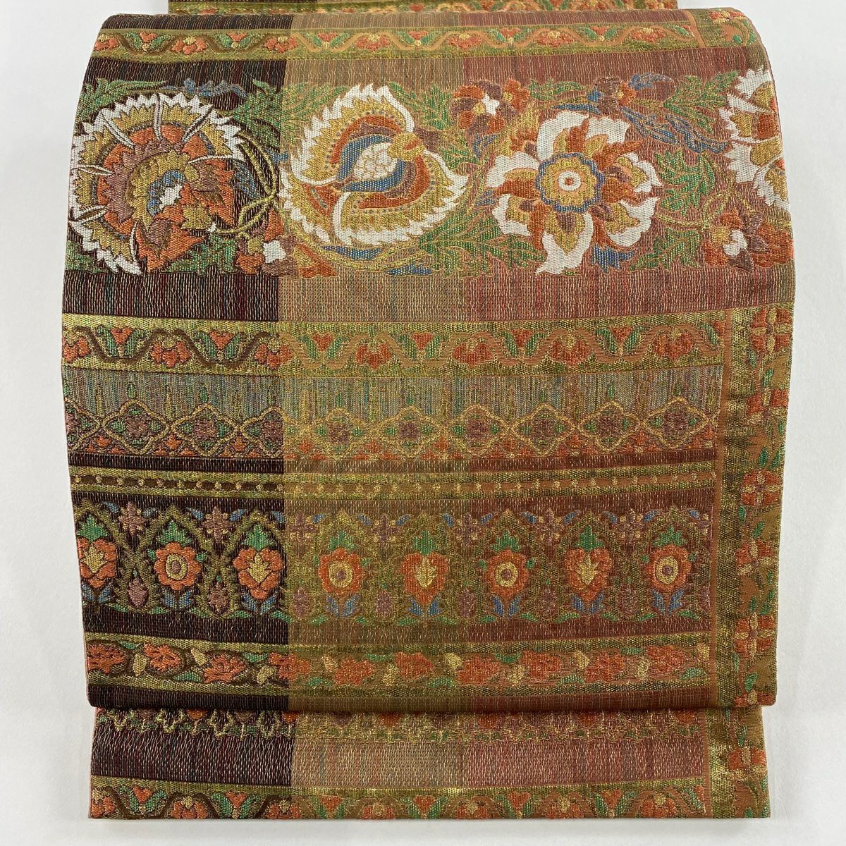 【在庫一掃】 袋帯 秀品 花唐草 幾何学模様 箔 赤茶 六通 正絹