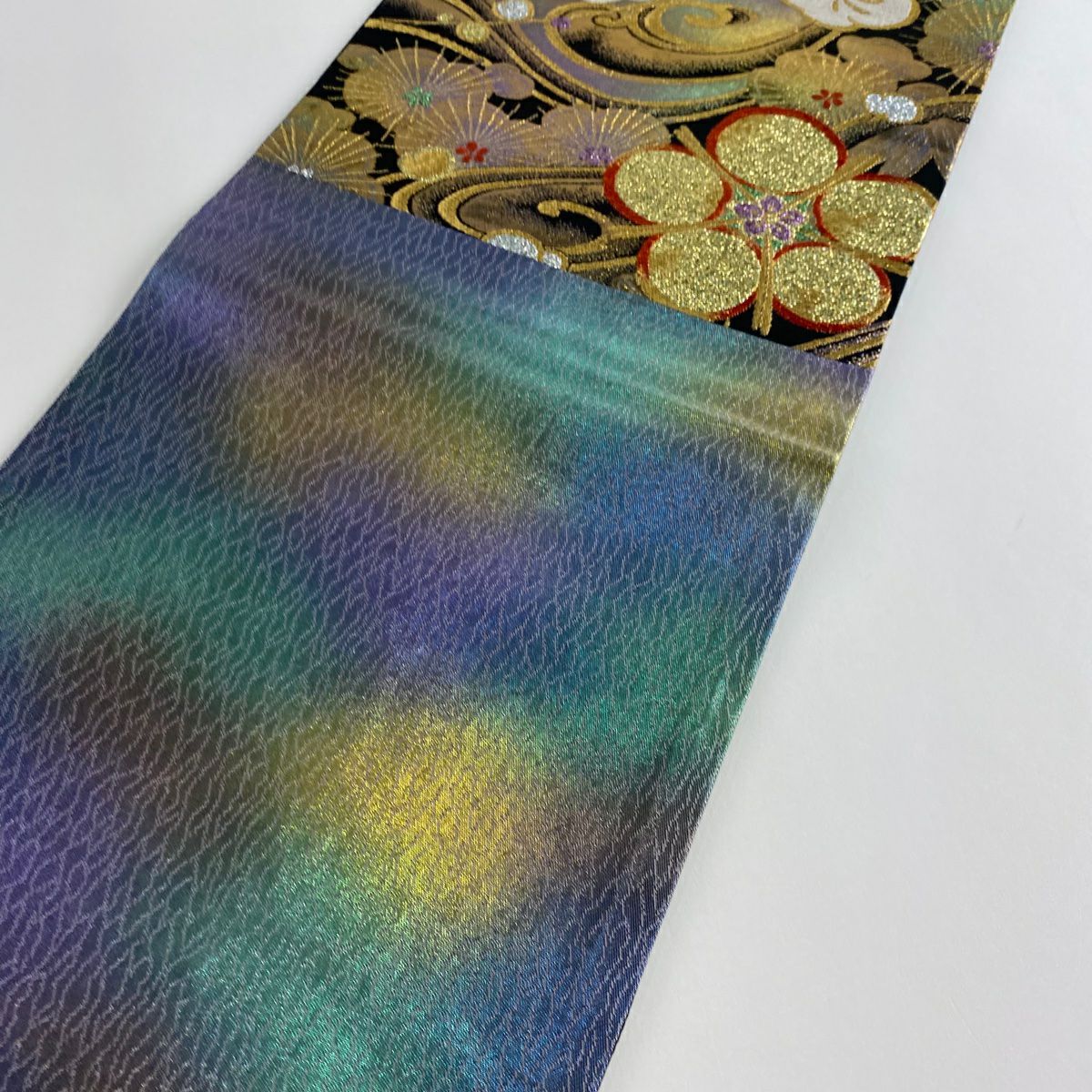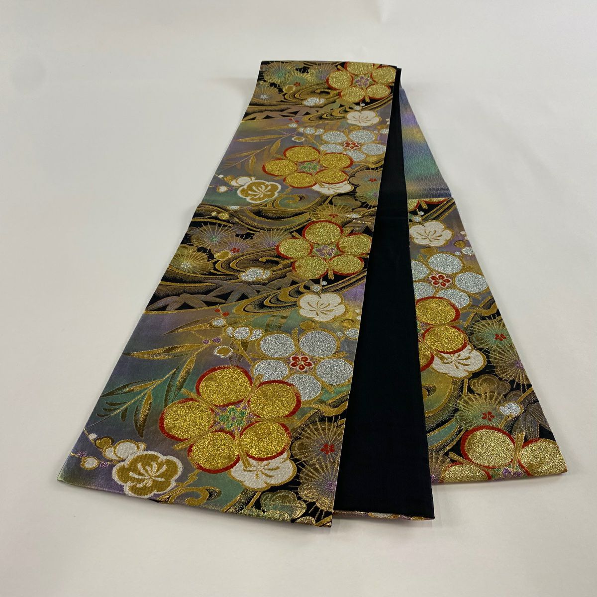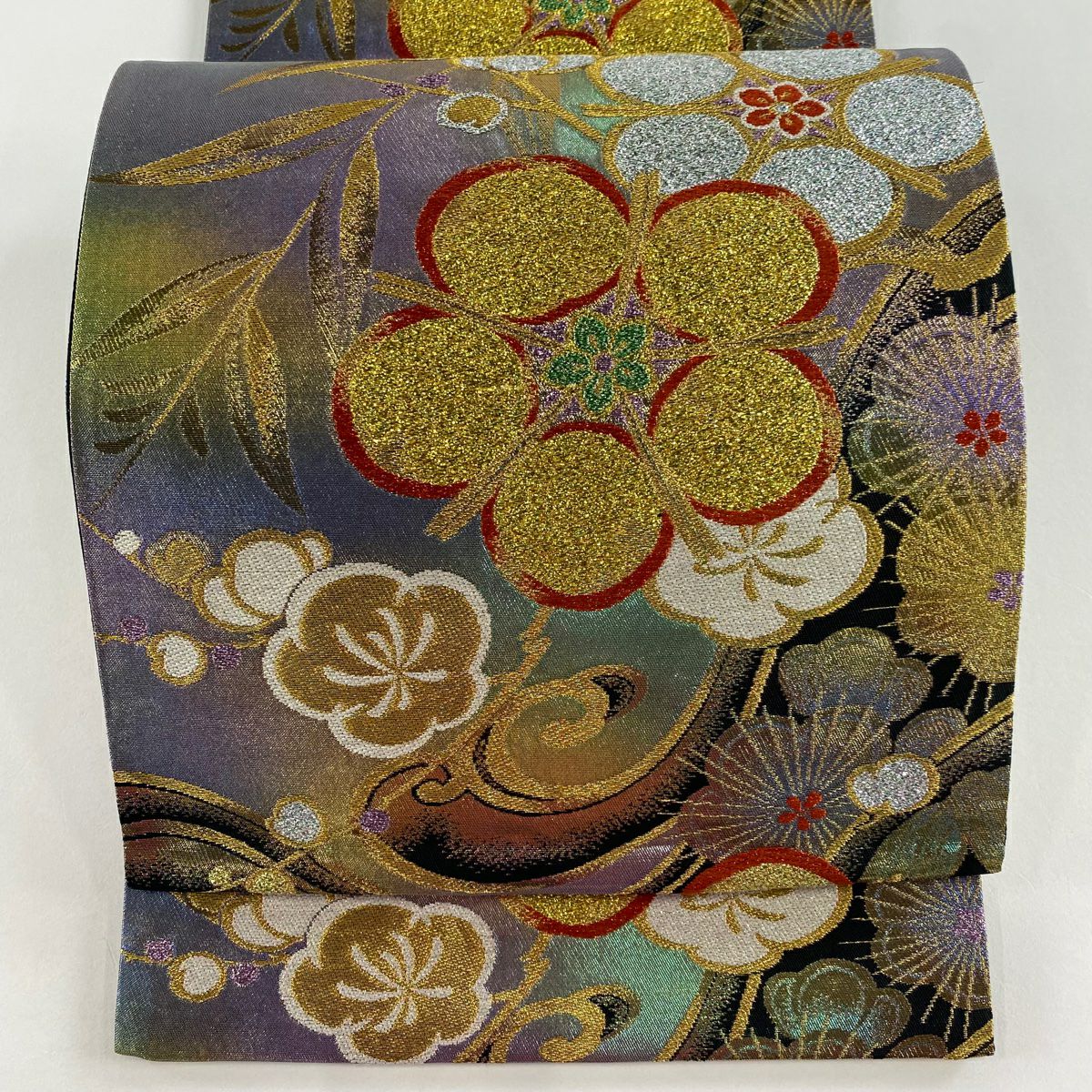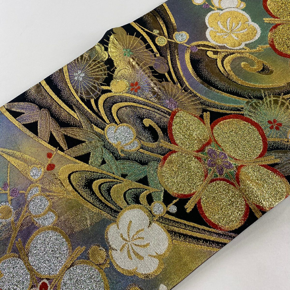 【在庫一掃】 【美品】 袋帯 秀品 梅 波 金糸 箔 黒 六通 正絹
