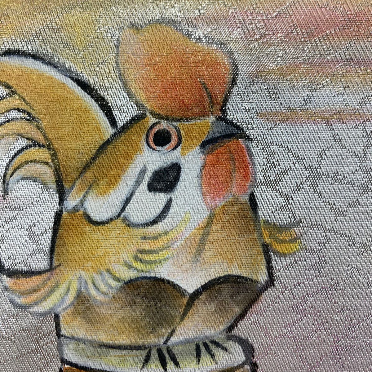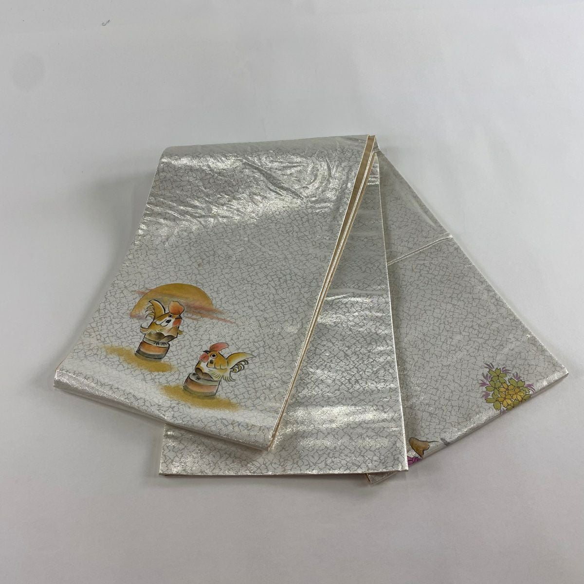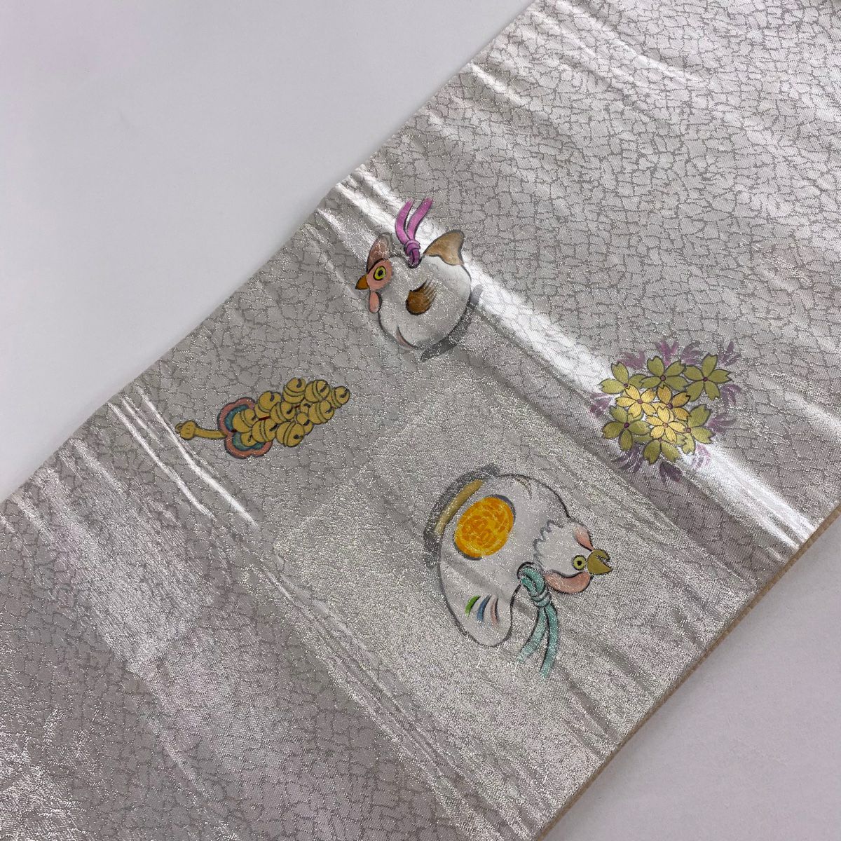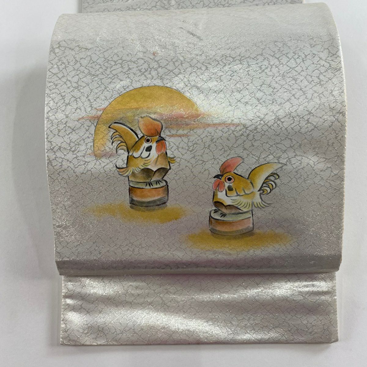 【在庫一掃】 袋帯 秀品 鶏 朝日 箔 金彩 灰白 お太鼓柄 正絹