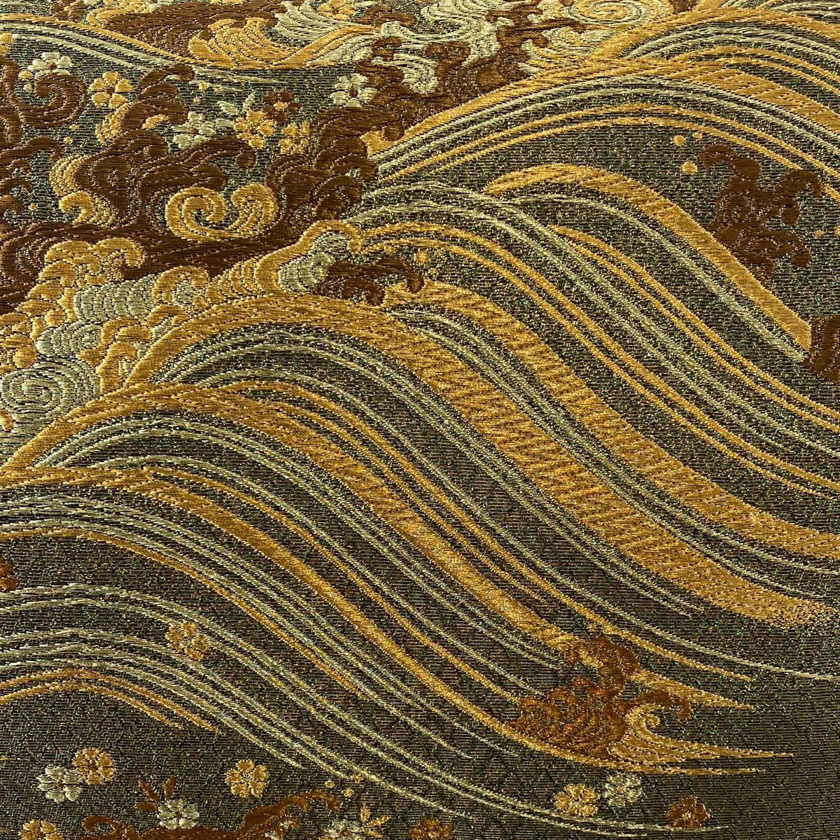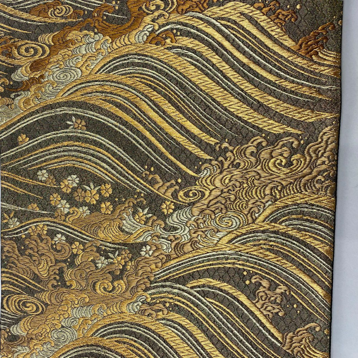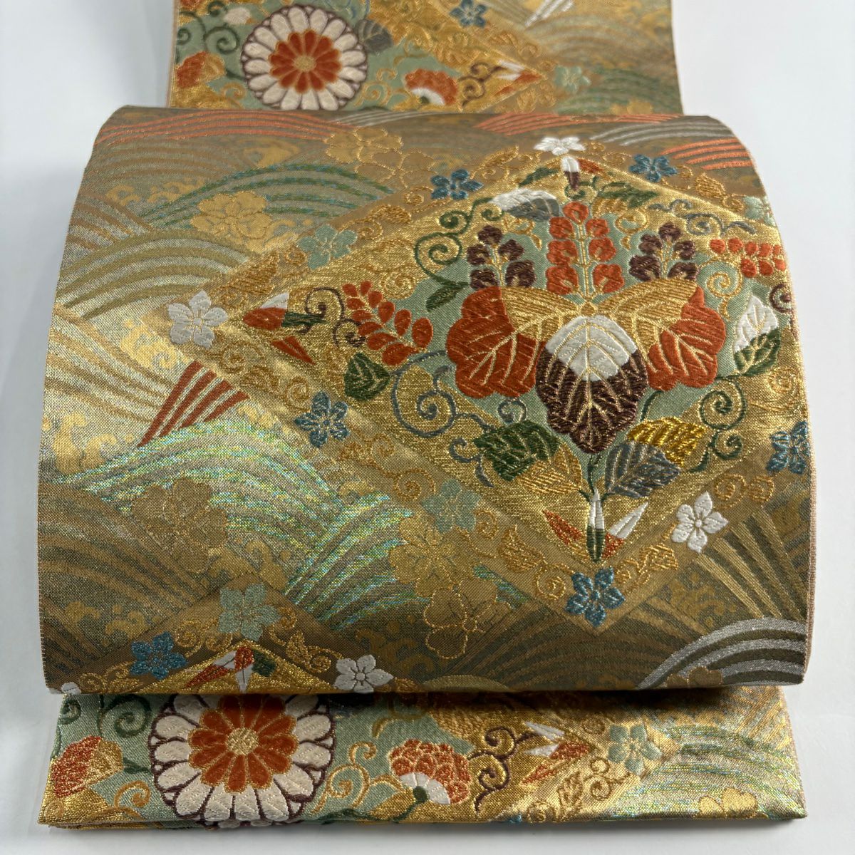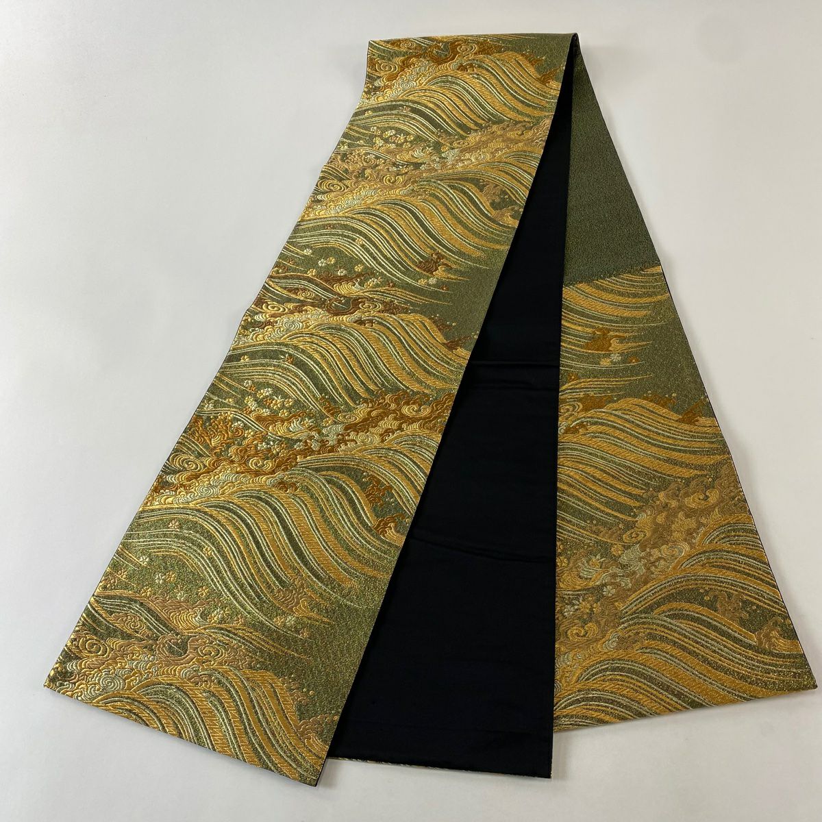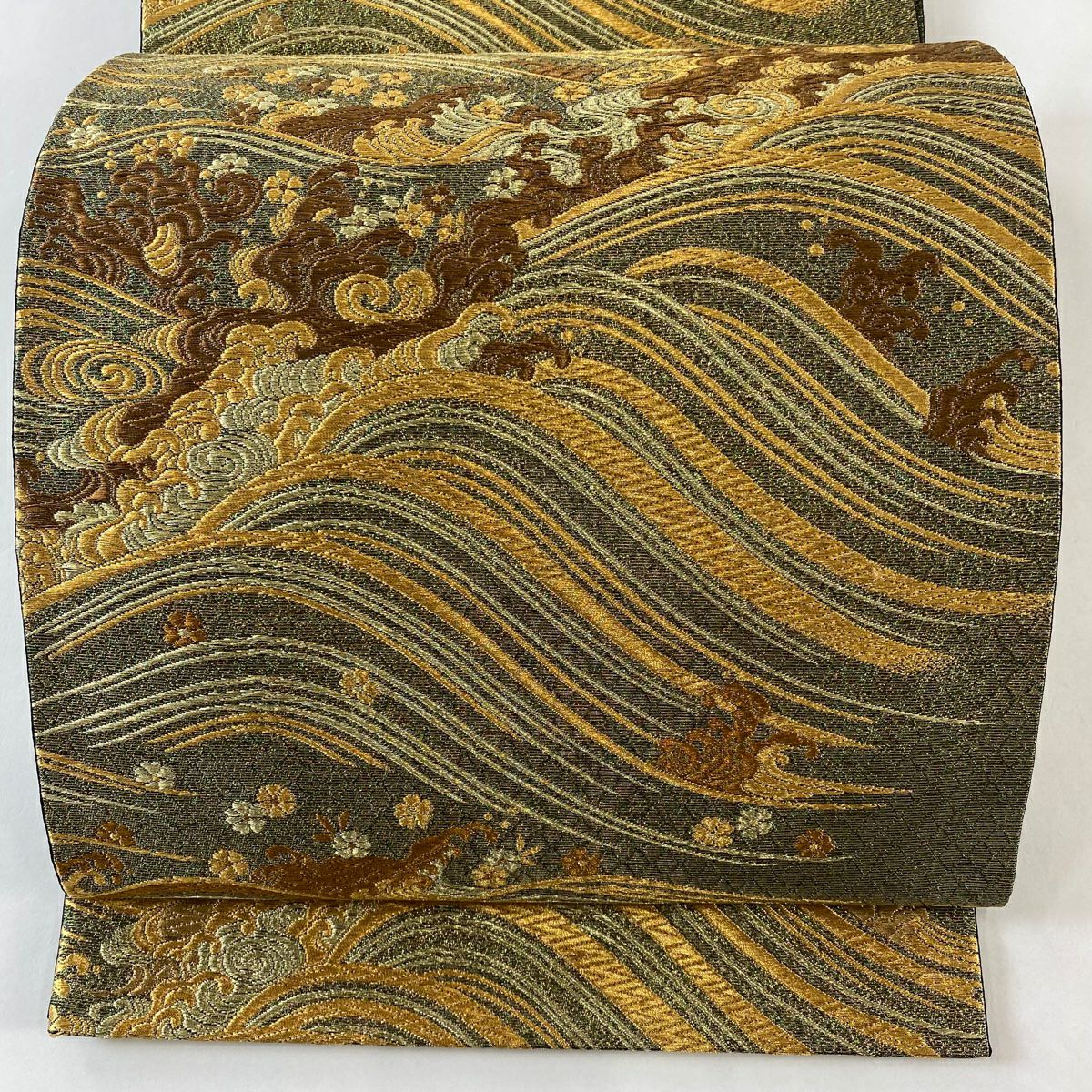 【在庫一掃】 【美品】 袋帯 秀品 桐 波 金糸 箔 金色 六通 正絹