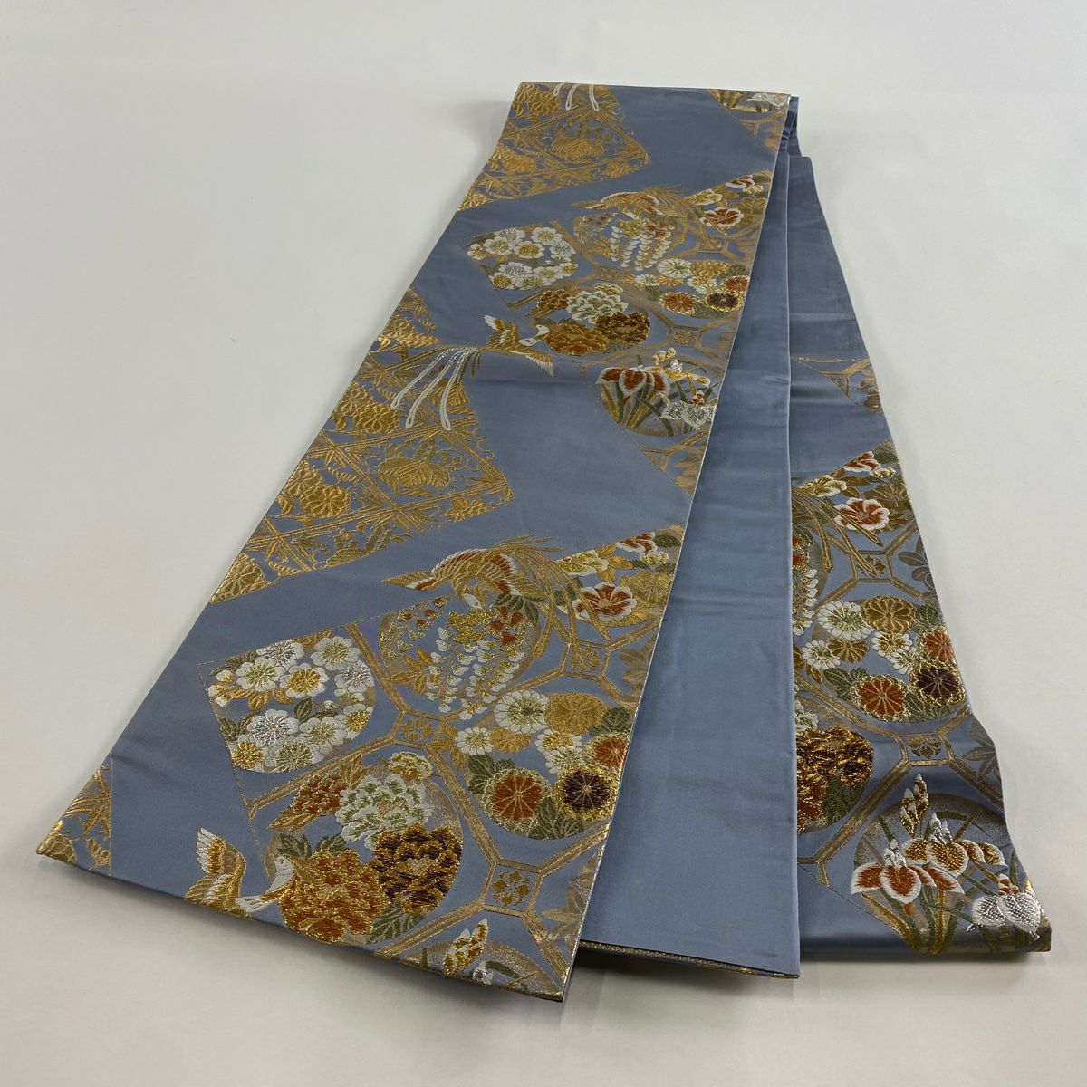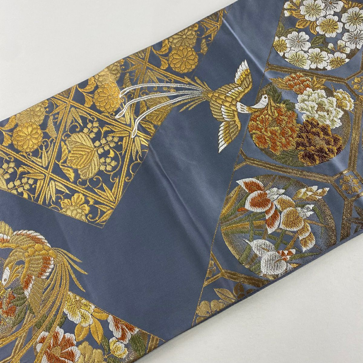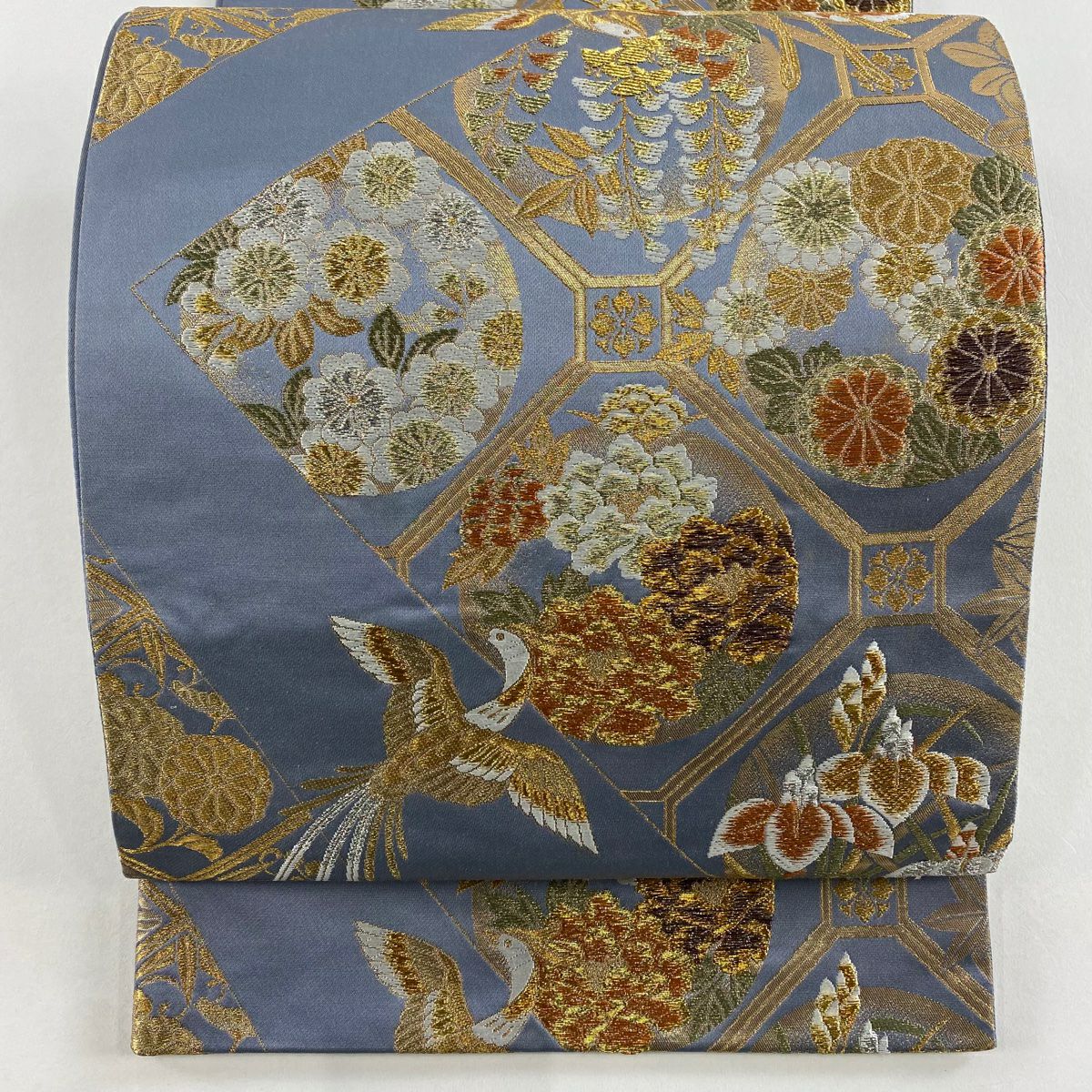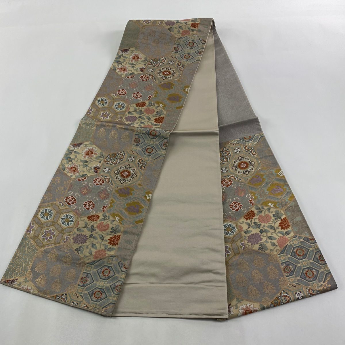 【在庫一掃】 袋帯 秀品 花丸文 鳥 金銀糸 箔 灰色 六通 正絹