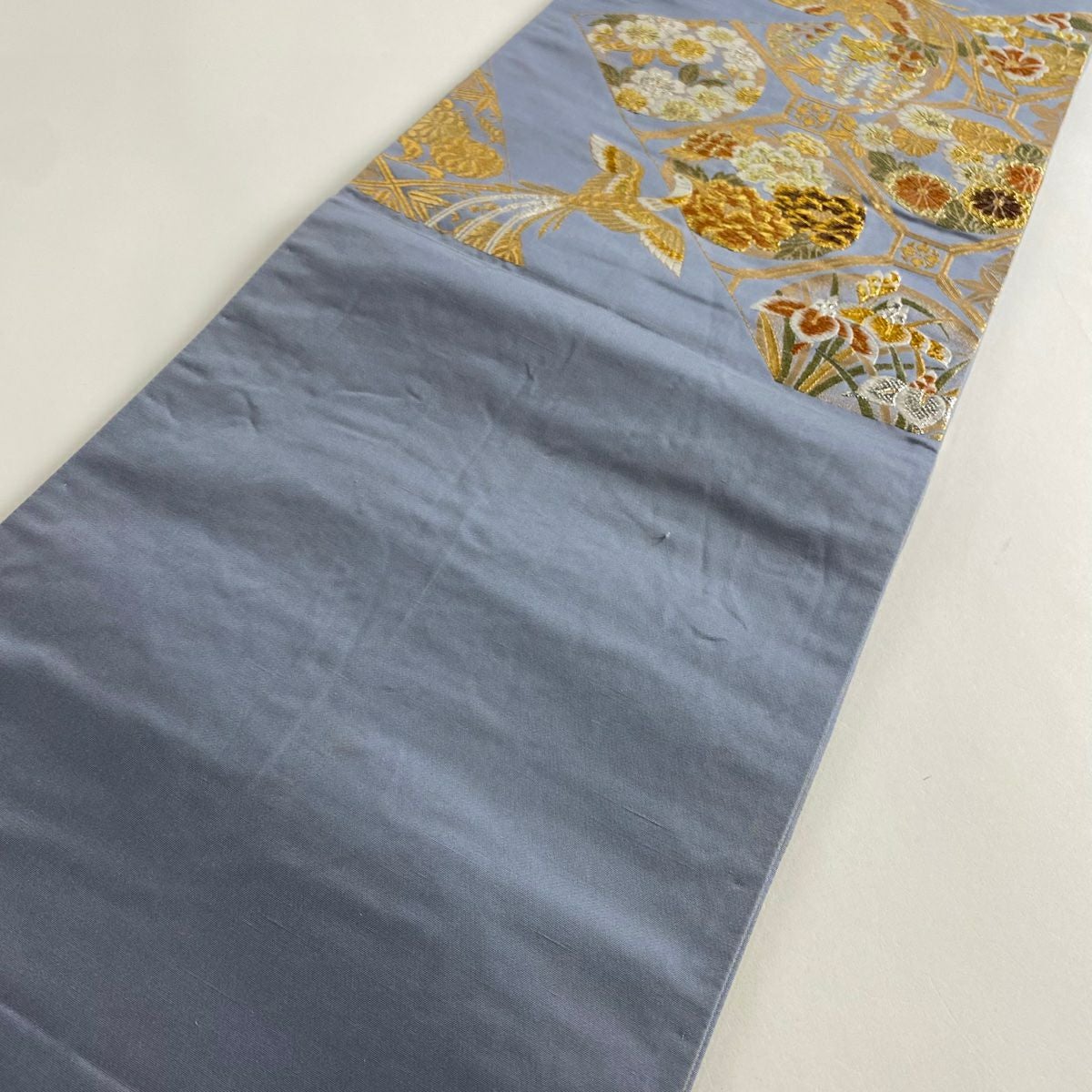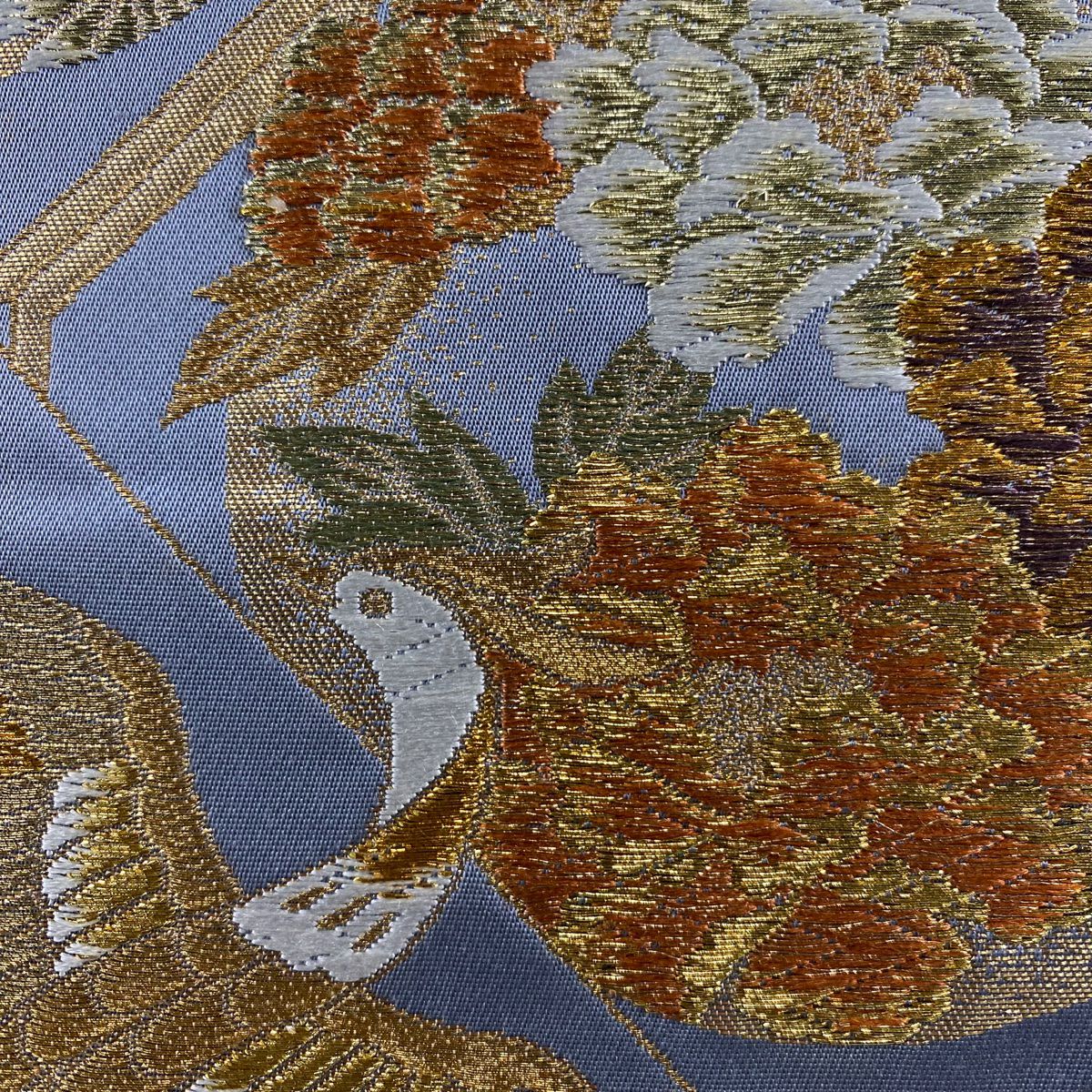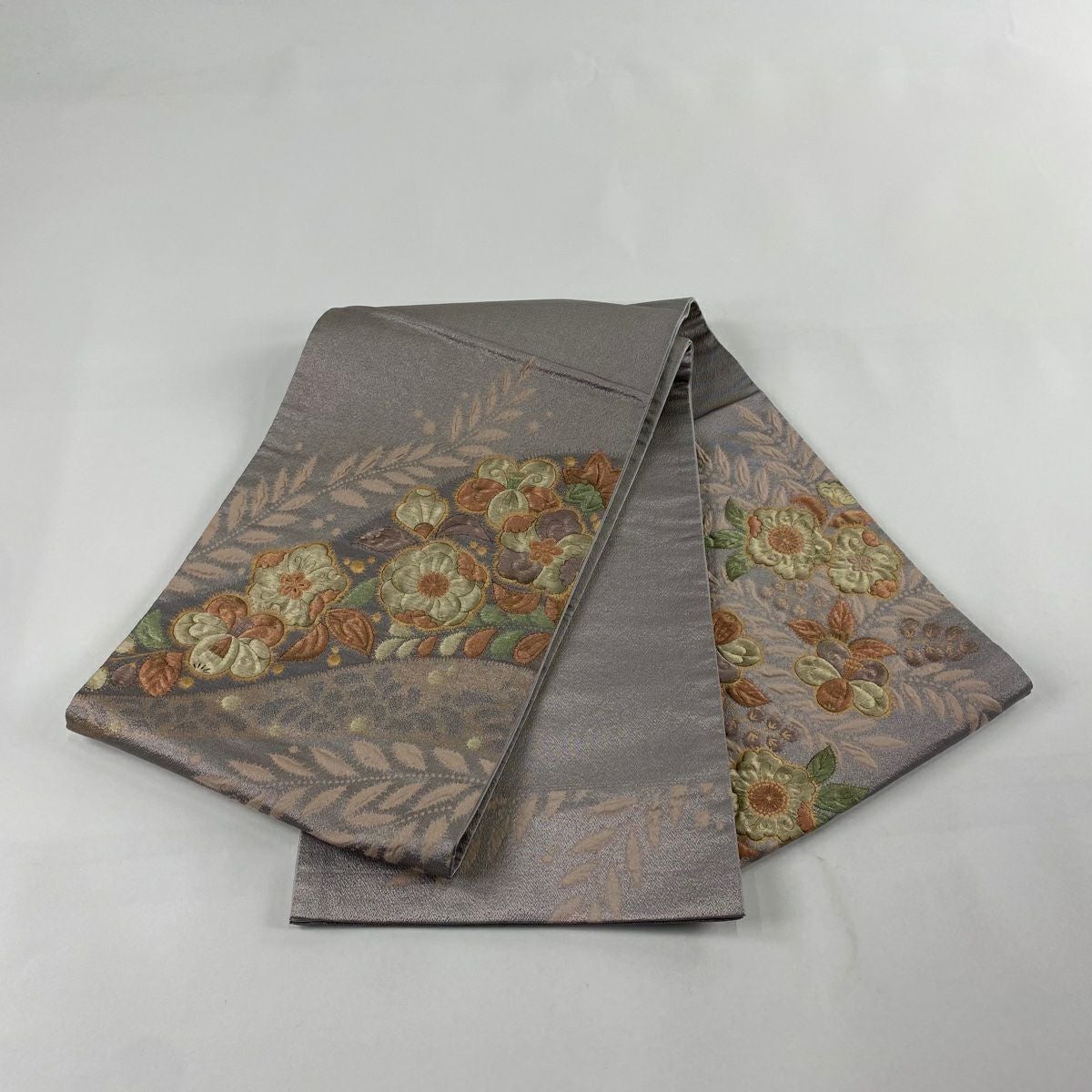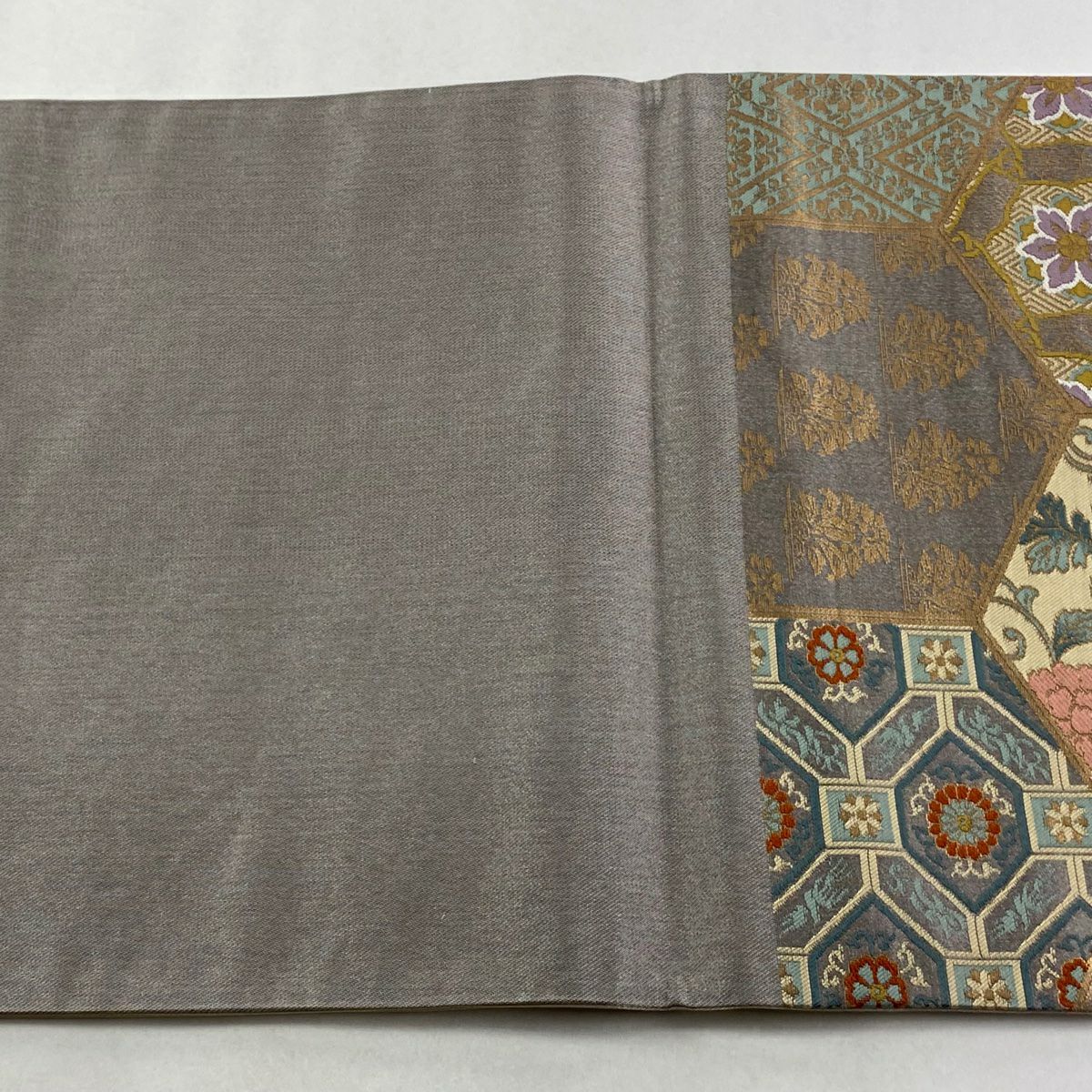 【在庫一掃】 袋帯 秀品 花丸文 鳥 金銀糸 箔 灰色 六通 正絹