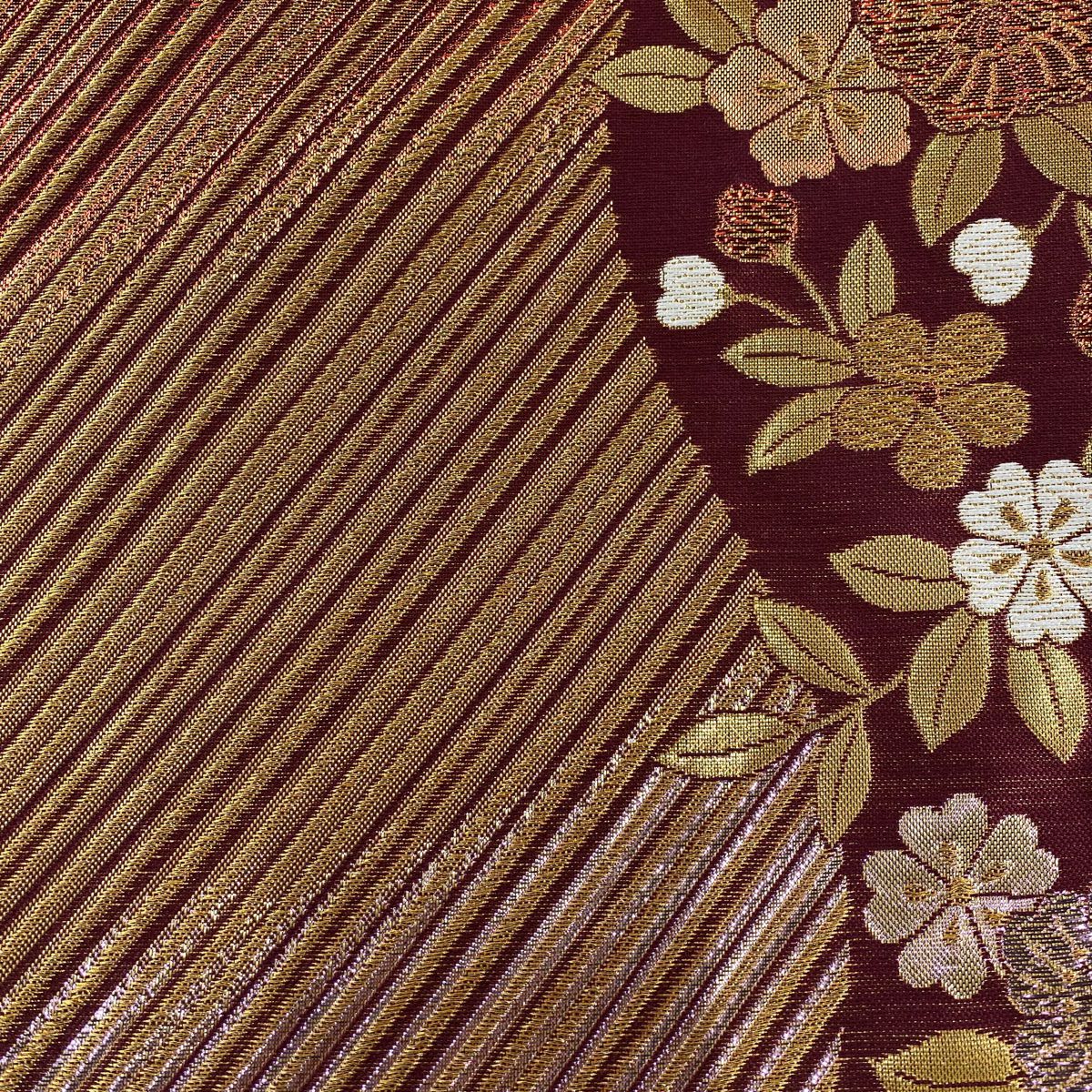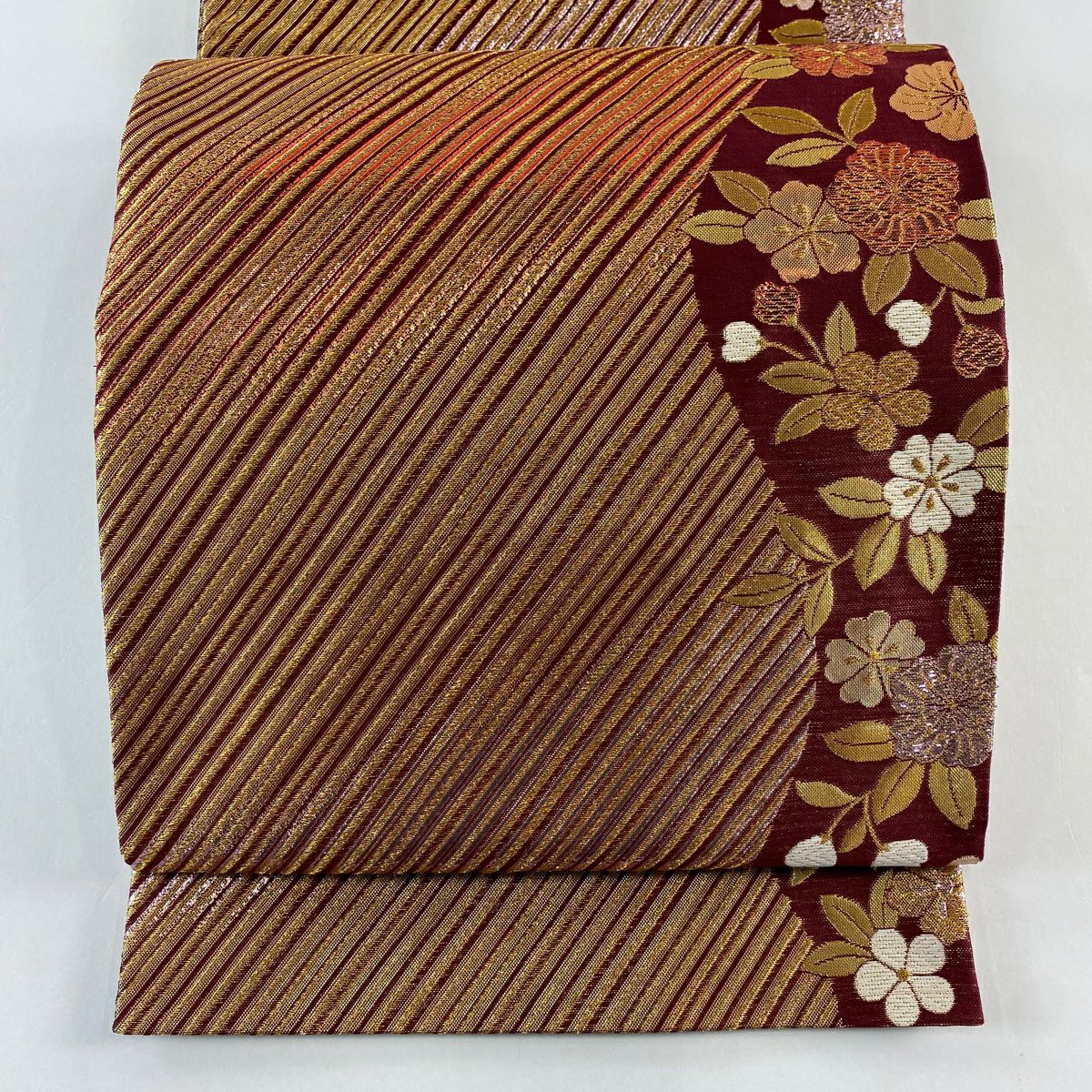 【在庫一掃】 袋帯 秀品 桜 斜縞 金糸 箔 えんじ色 六通 正絹