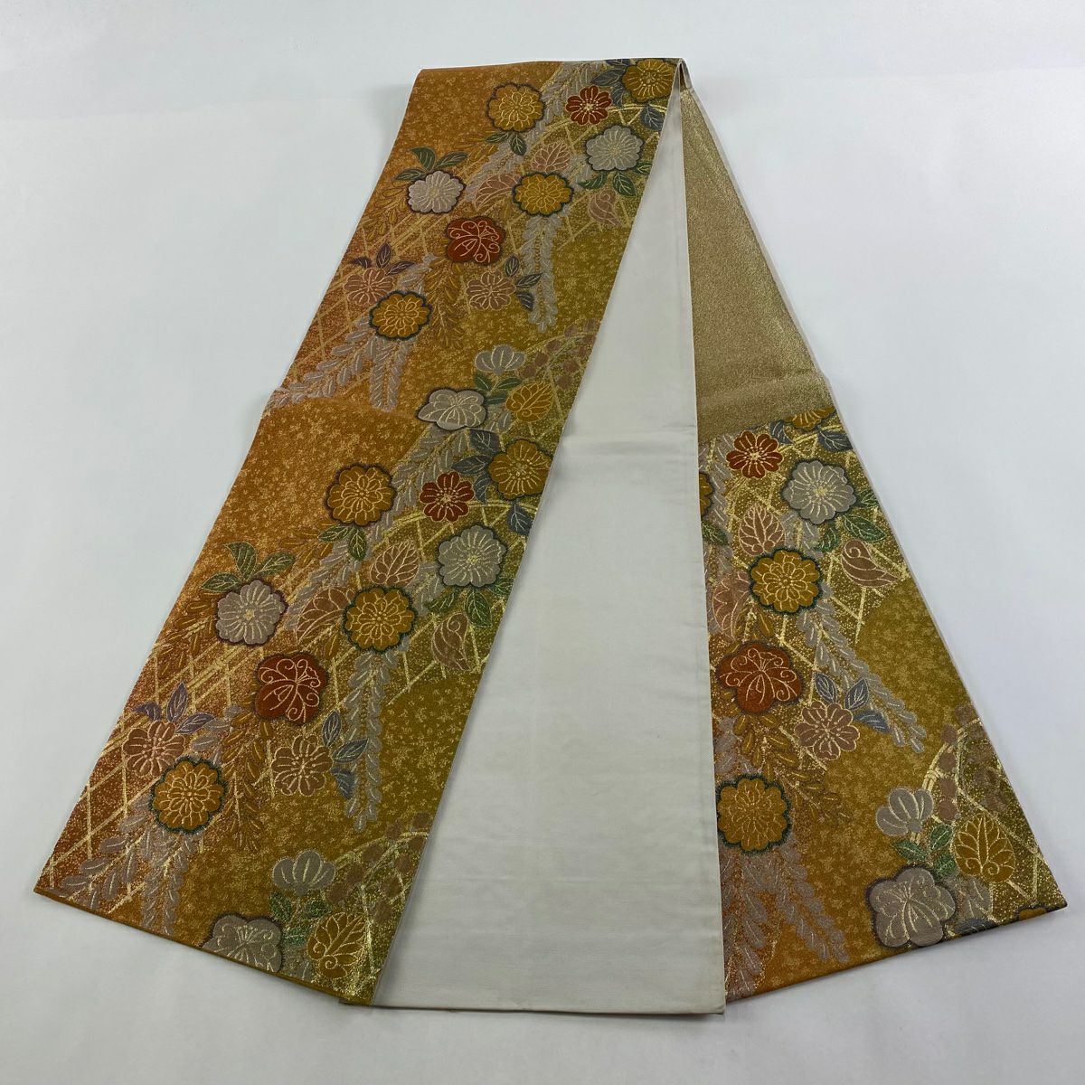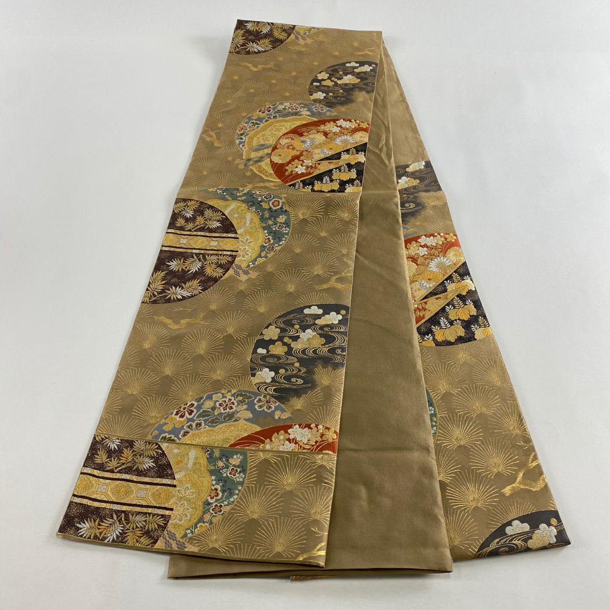 【在庫一掃】 袋帯 秀品 関西仕立て 菊 松梅 薄茶色 六通 正絹