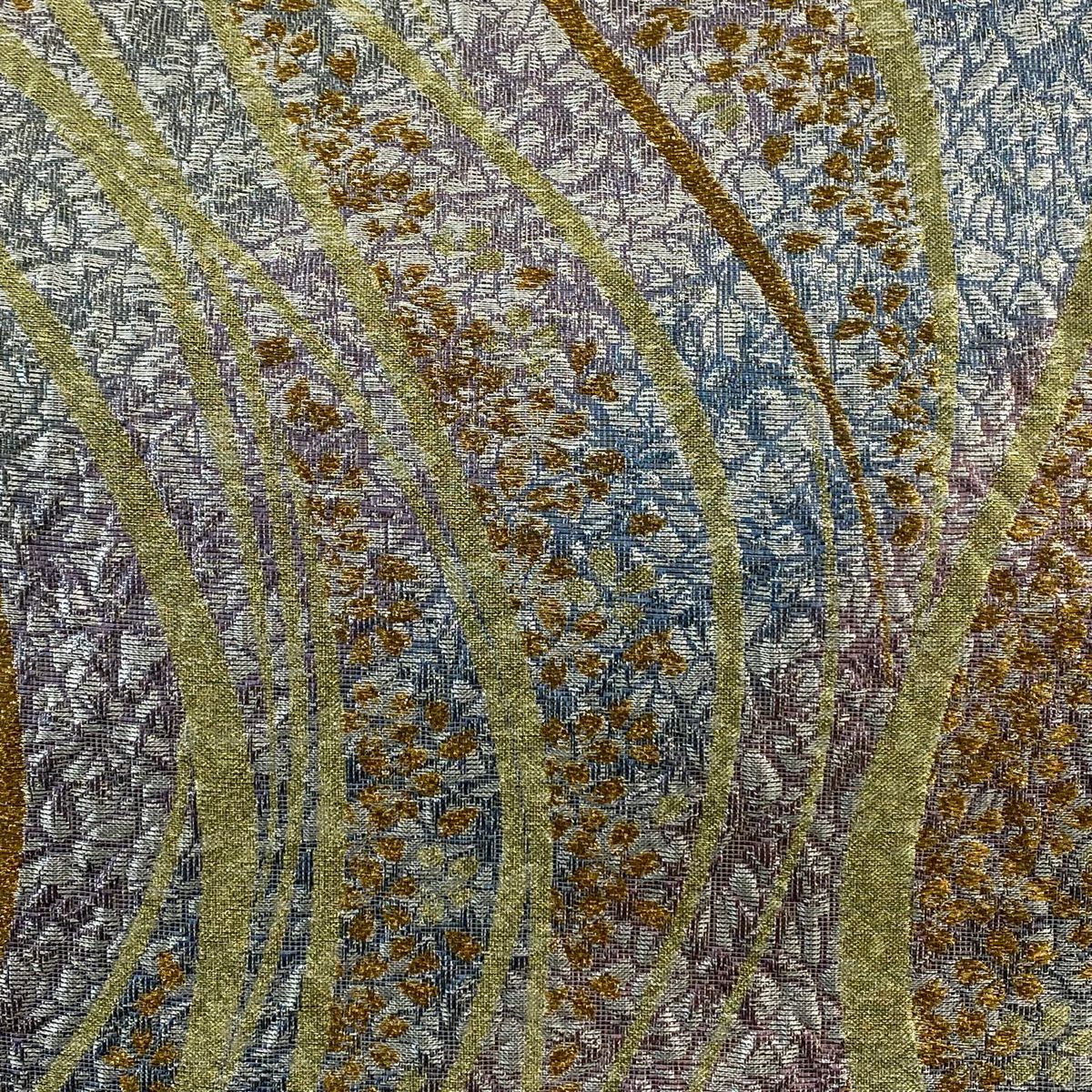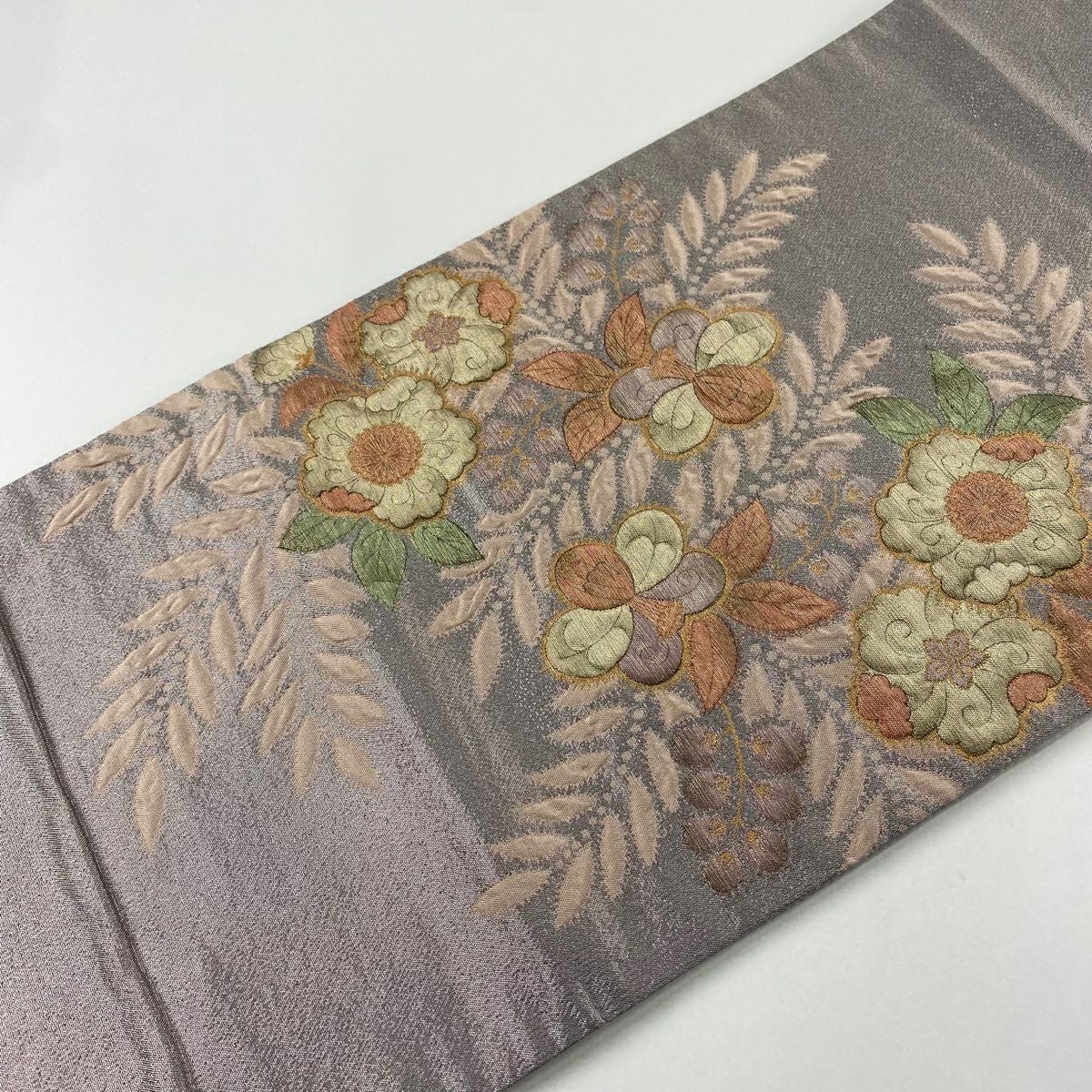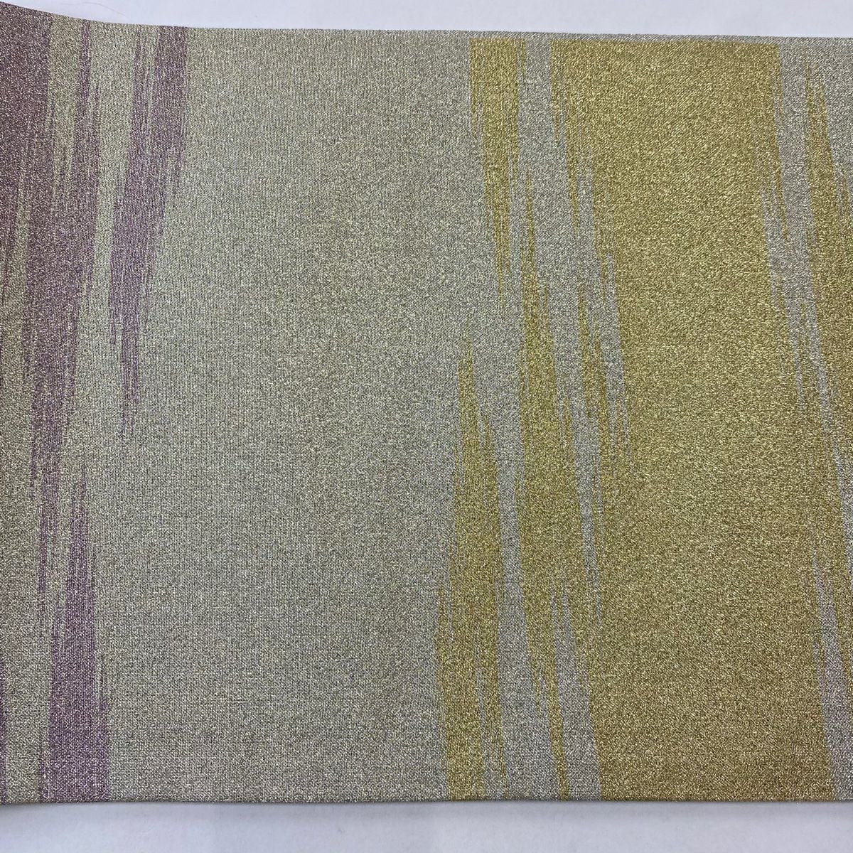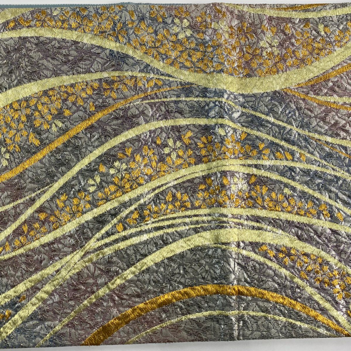 【在庫一掃】 袋帯 秀品 桜 よろけ縞 金糸 箔 灰紫 六通 正絹