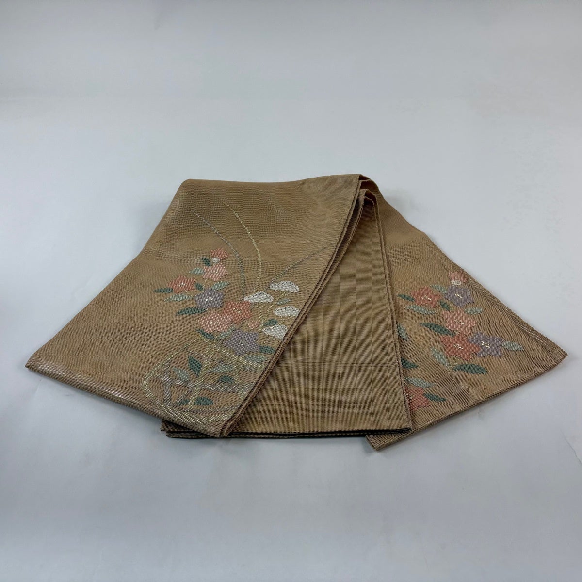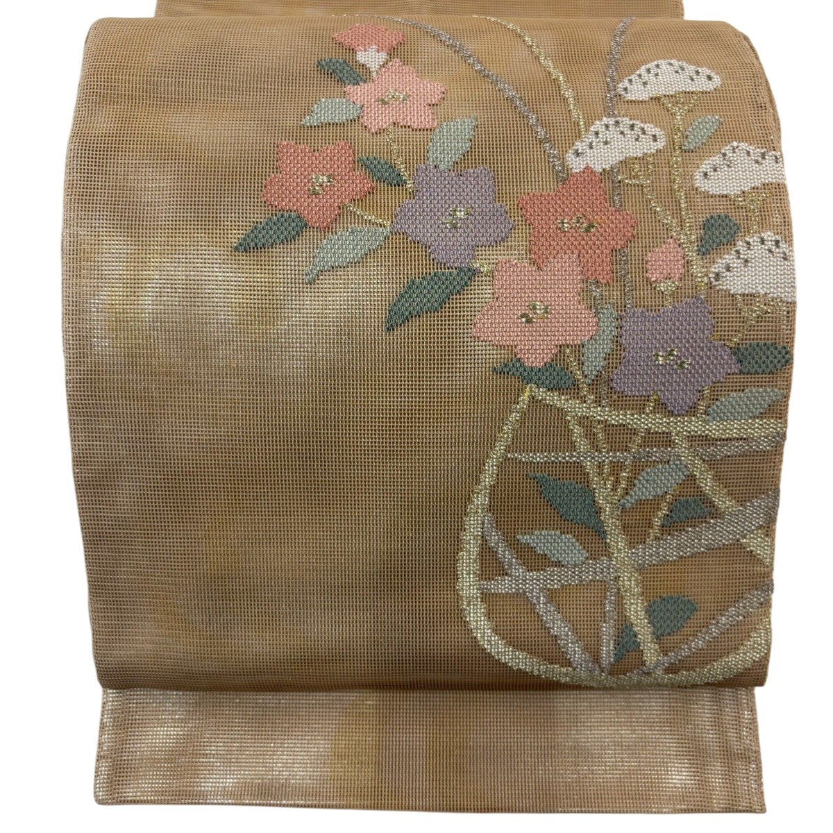 袋帯 秀品 夏帯 羅 花籠 桔梗 箔 金銀糸 薄茶色 お太鼓柄 正絹