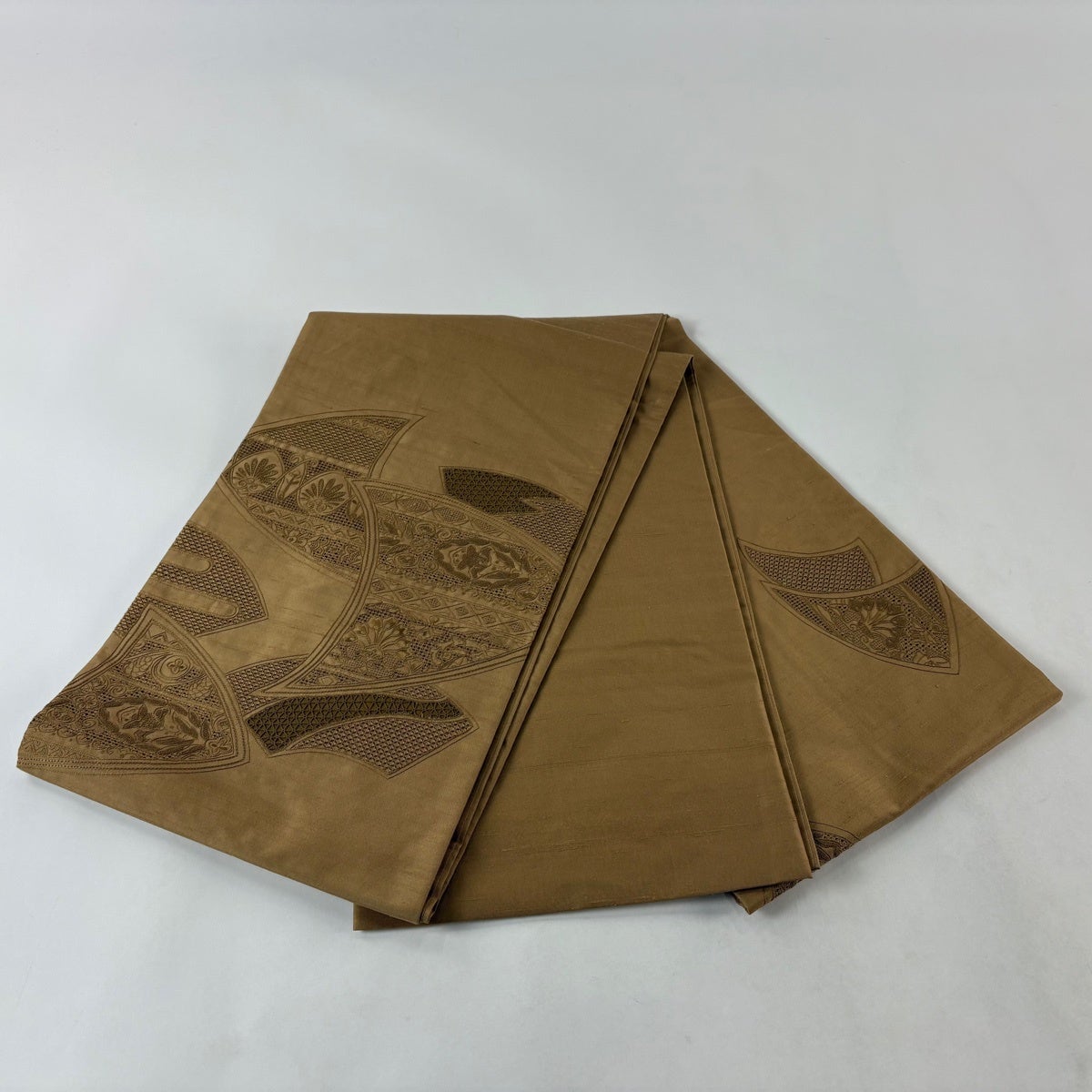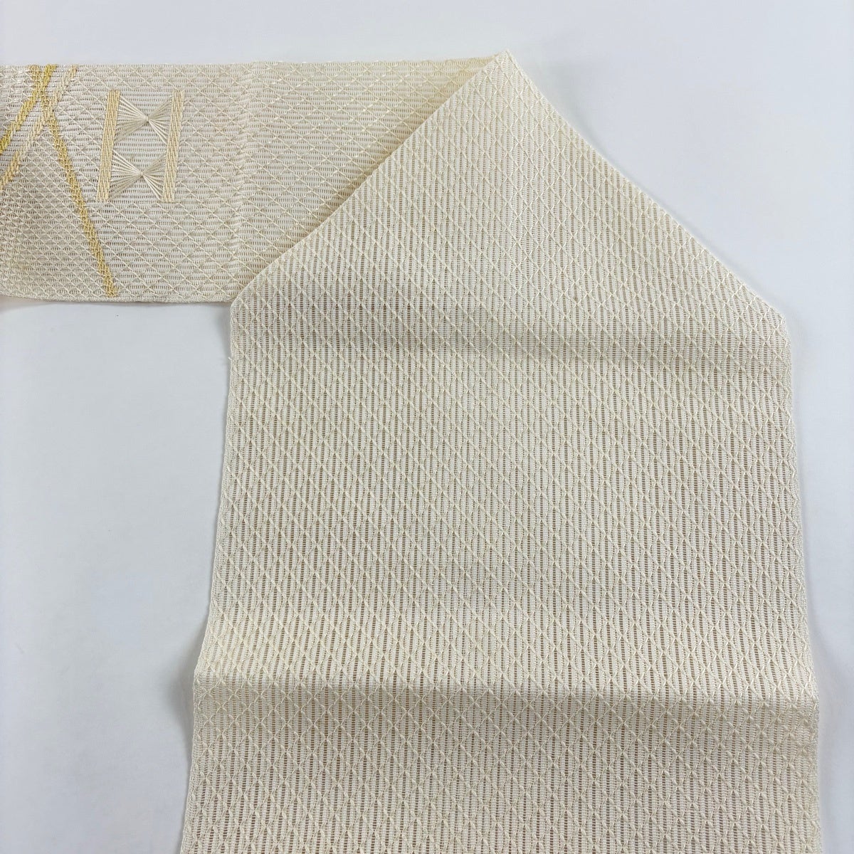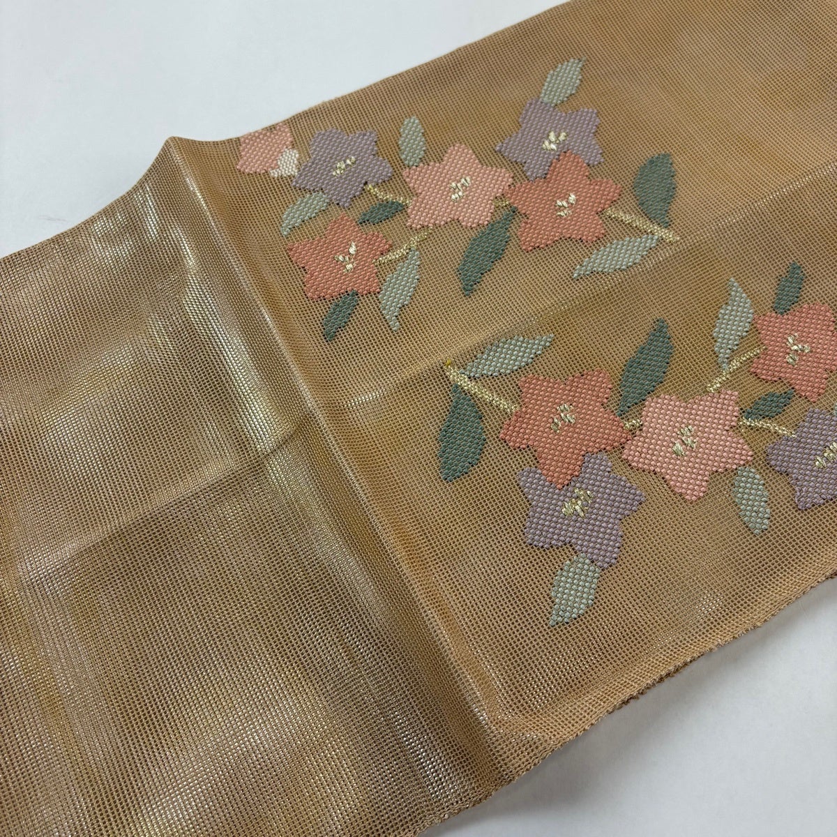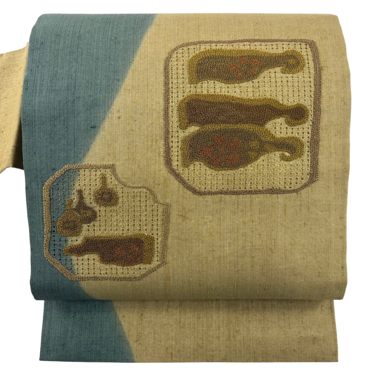 【美品】 名古屋帯 秀品 紬地 幾何学模様 花 刺繍 薄黄土色 正絹
