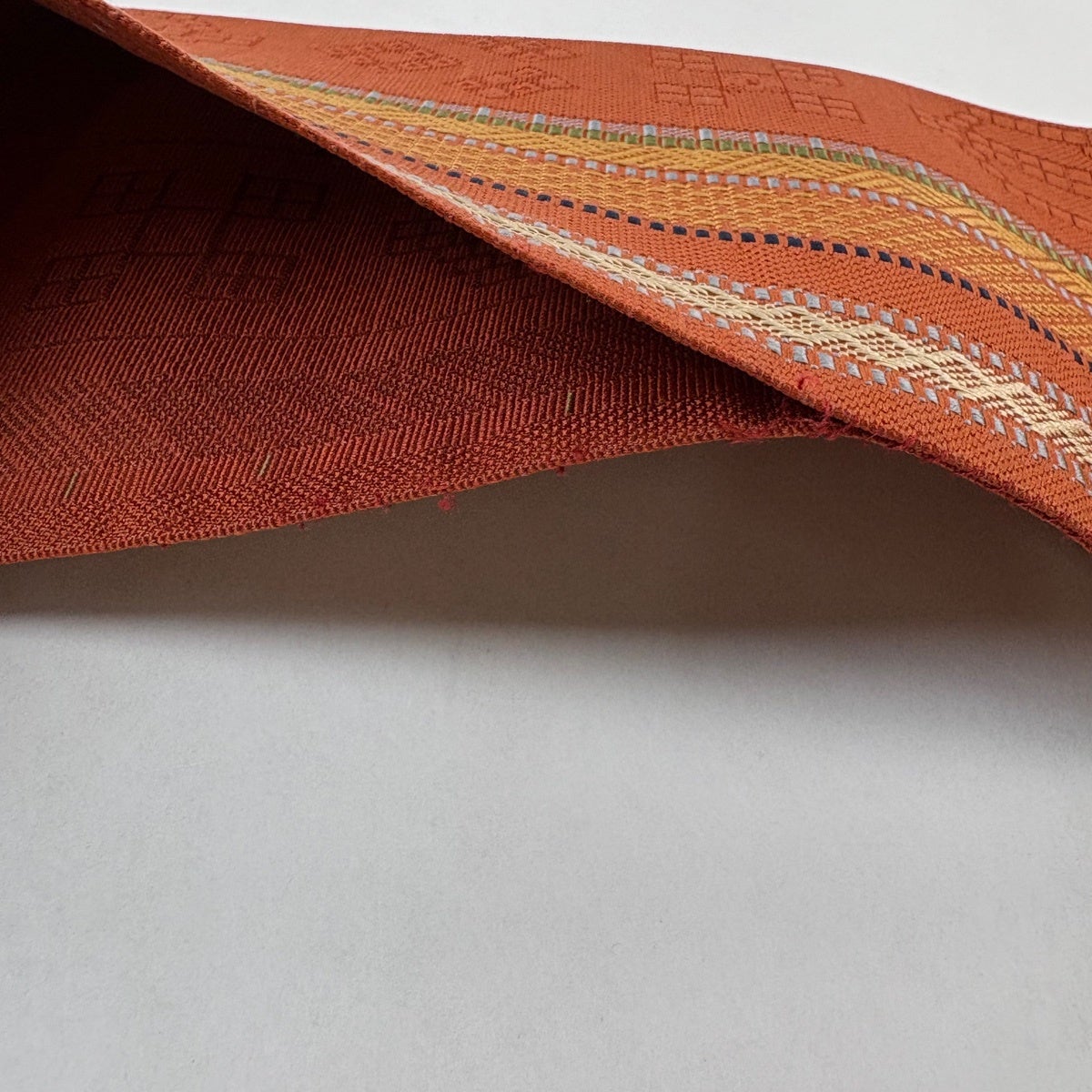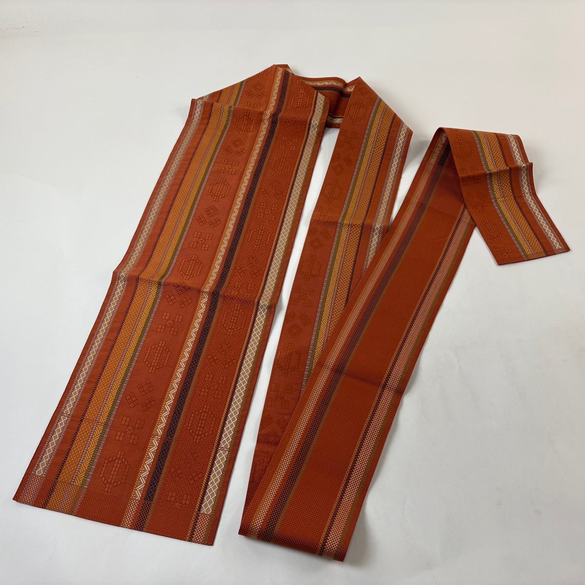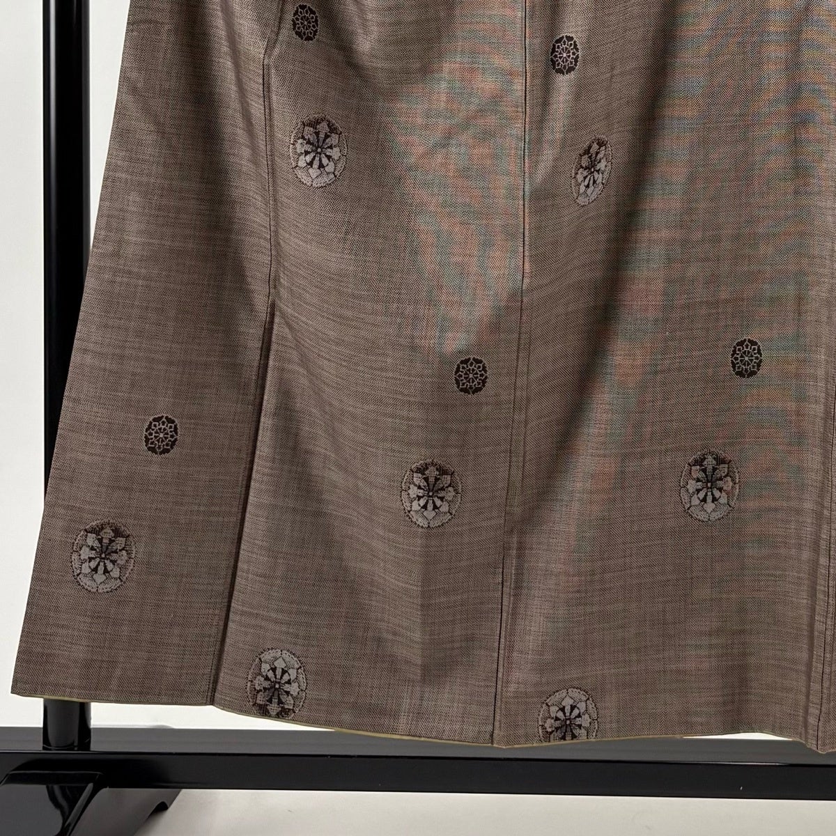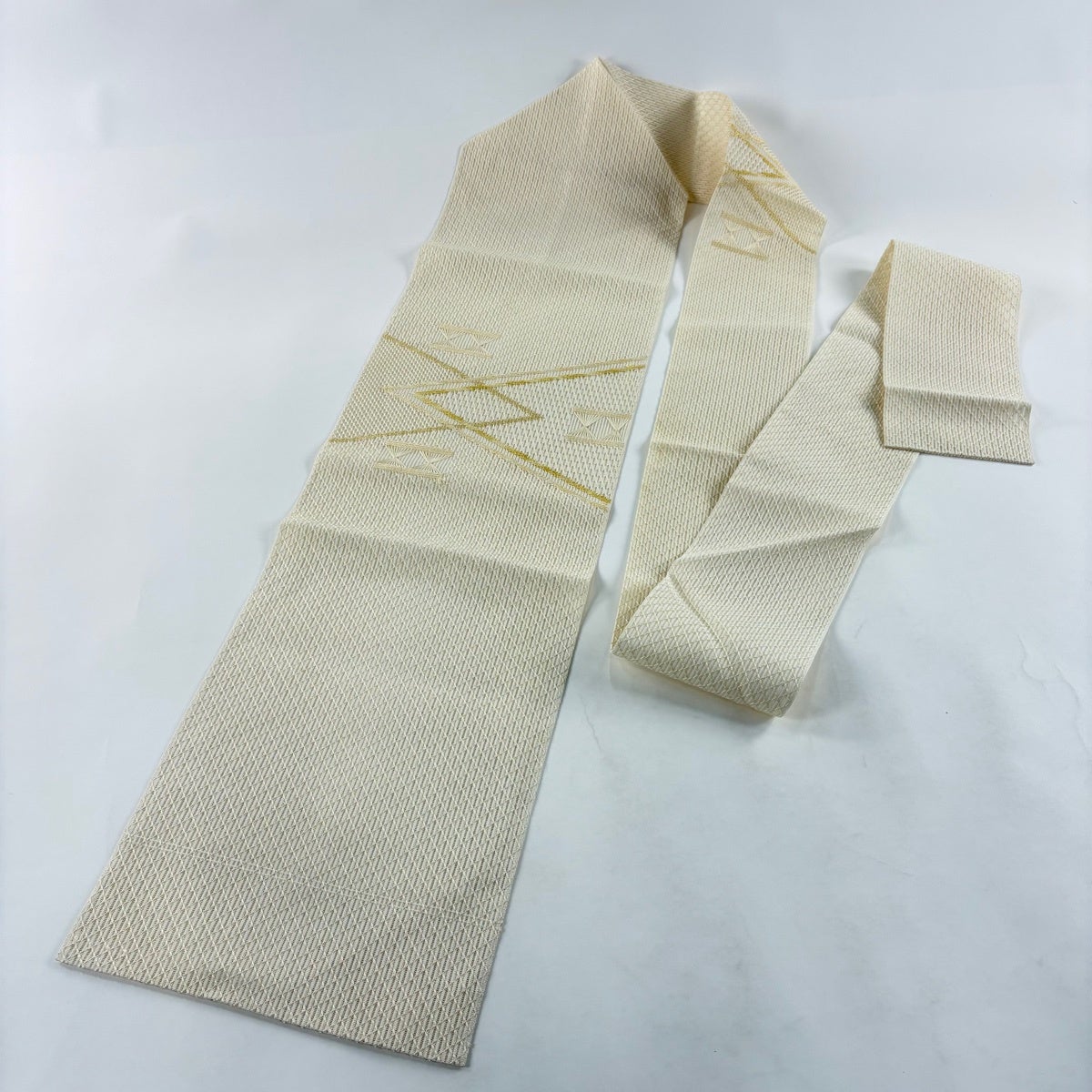 【美品】 名古屋帯 秀品 紬地 幾何学模様 花 刺繍 薄黄土色 正絹