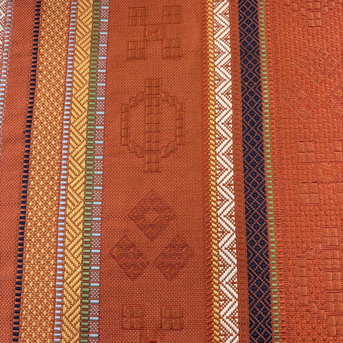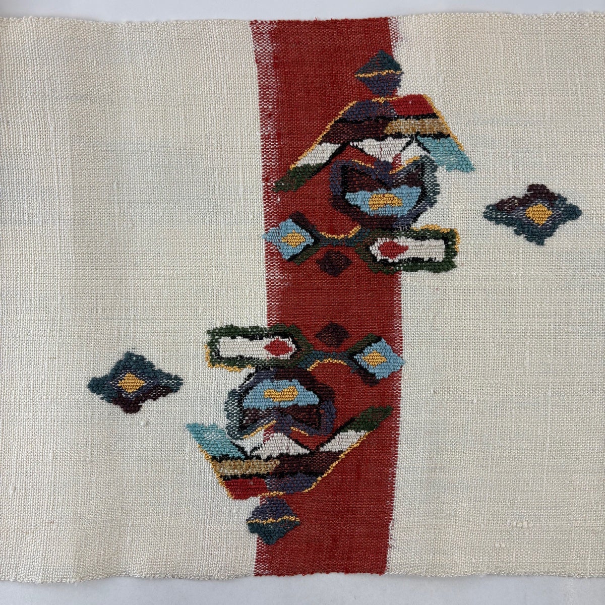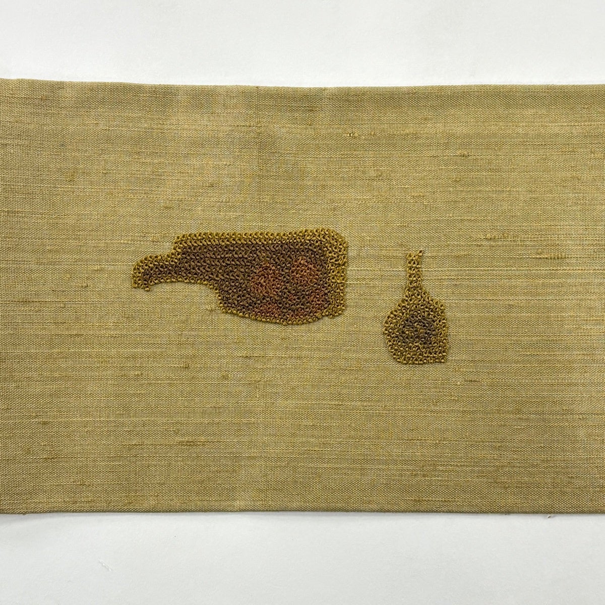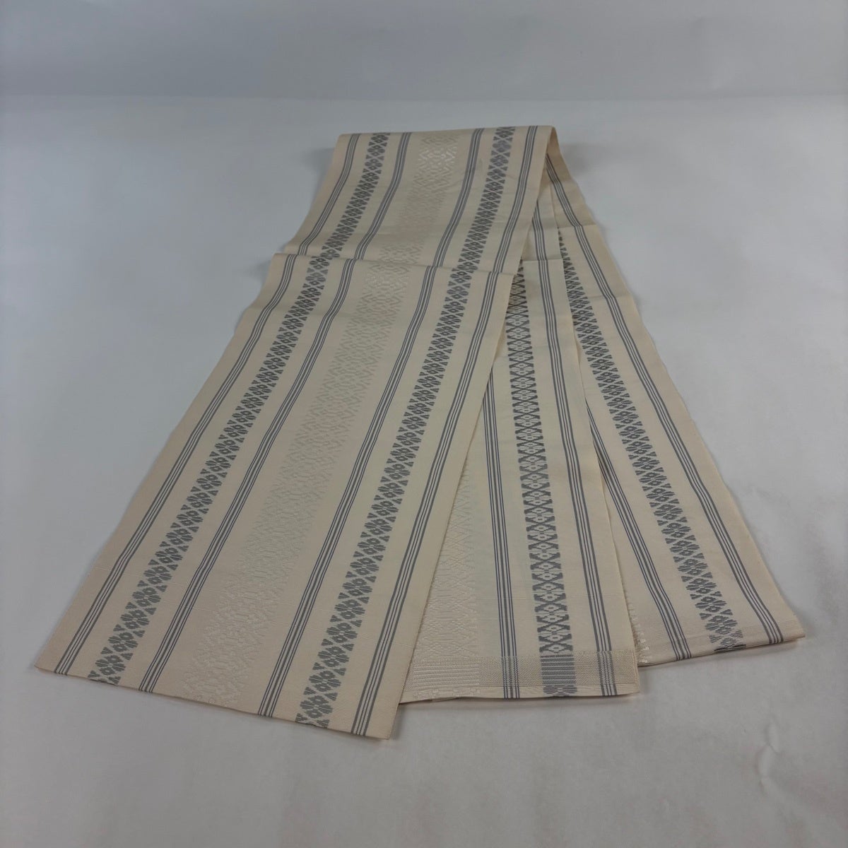 【美品】 名古屋帯 秀品 紬地 幾何学模様 花 刺繍 薄黄土色 正絹