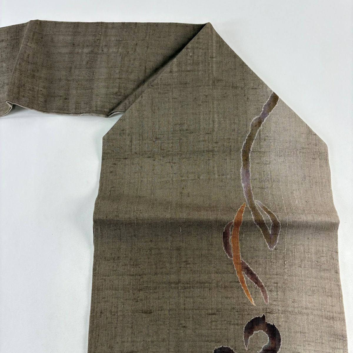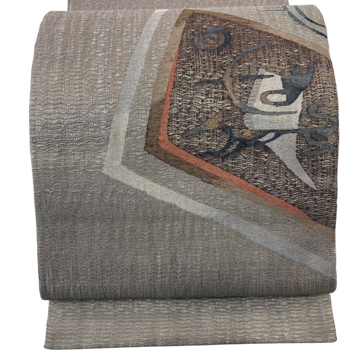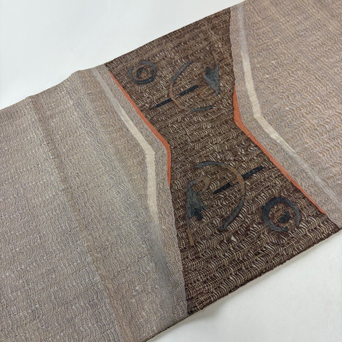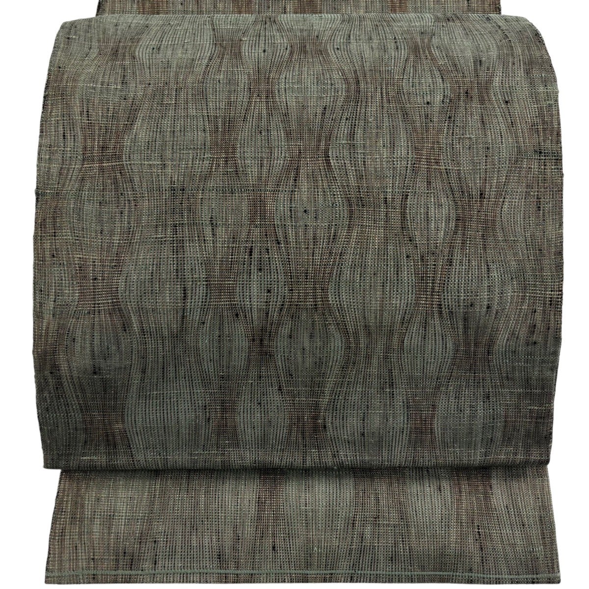 名古屋帯 秀品 落款あり 夏帯 紬地 幾何学模様 ぼかし 灰茶 正絹