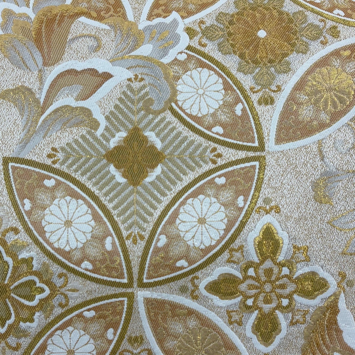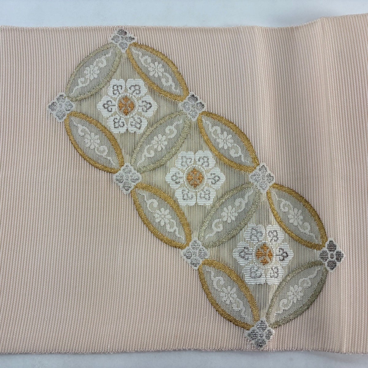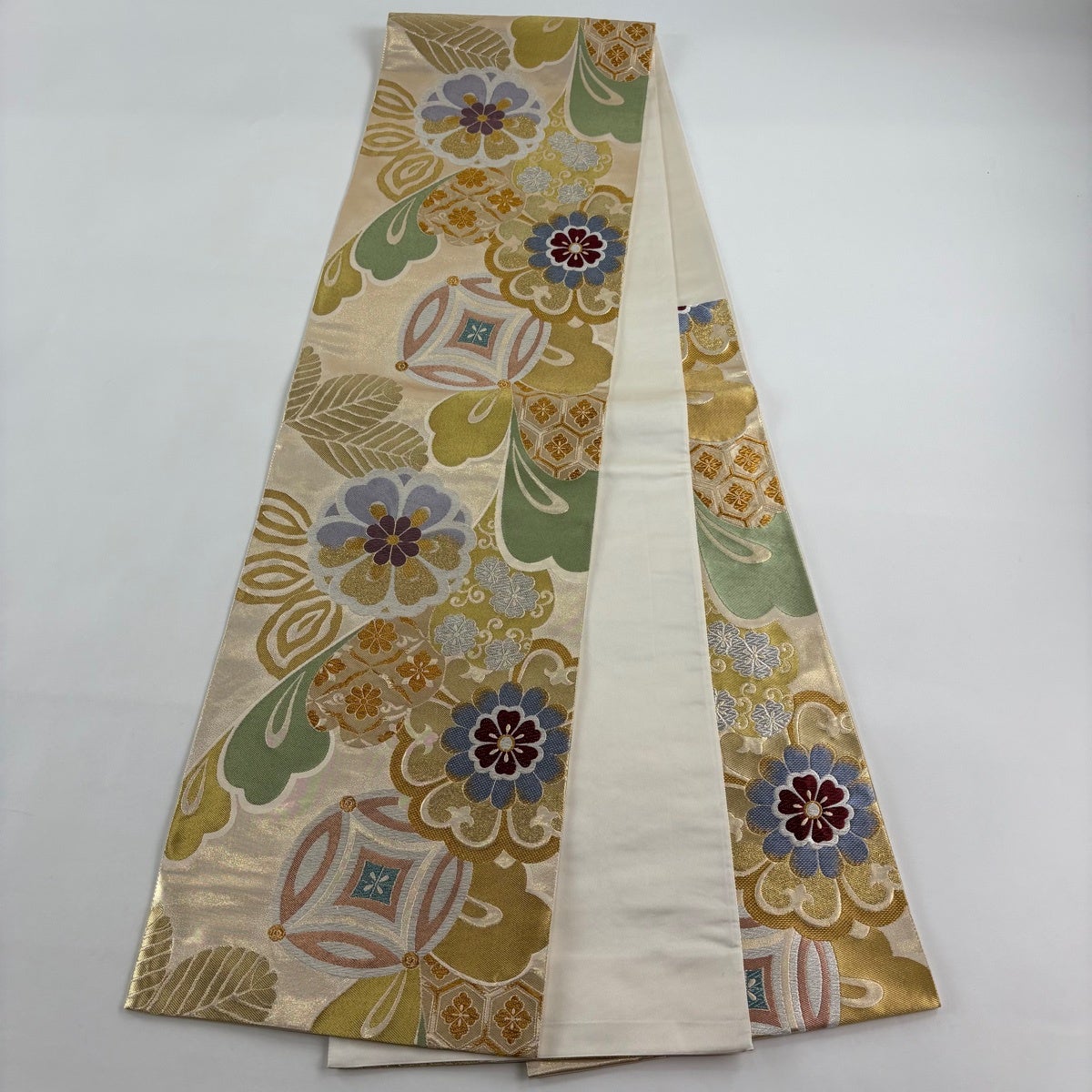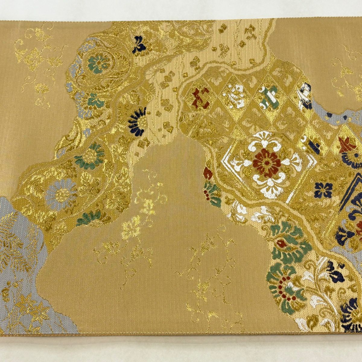 【美品】 袋帯 秀品 花唐草 菱 金糸 箔 ベージュ 六通 正絹