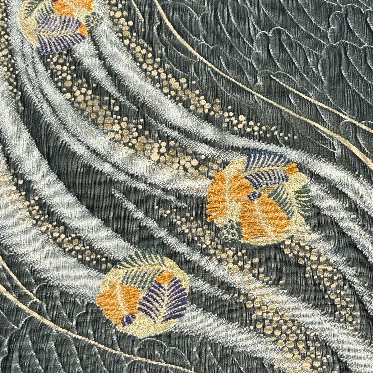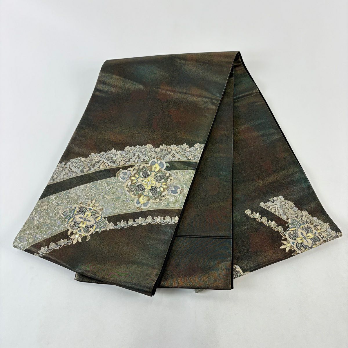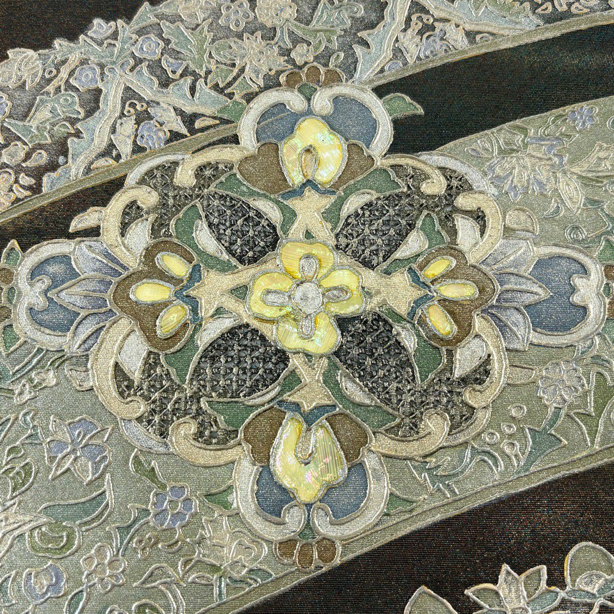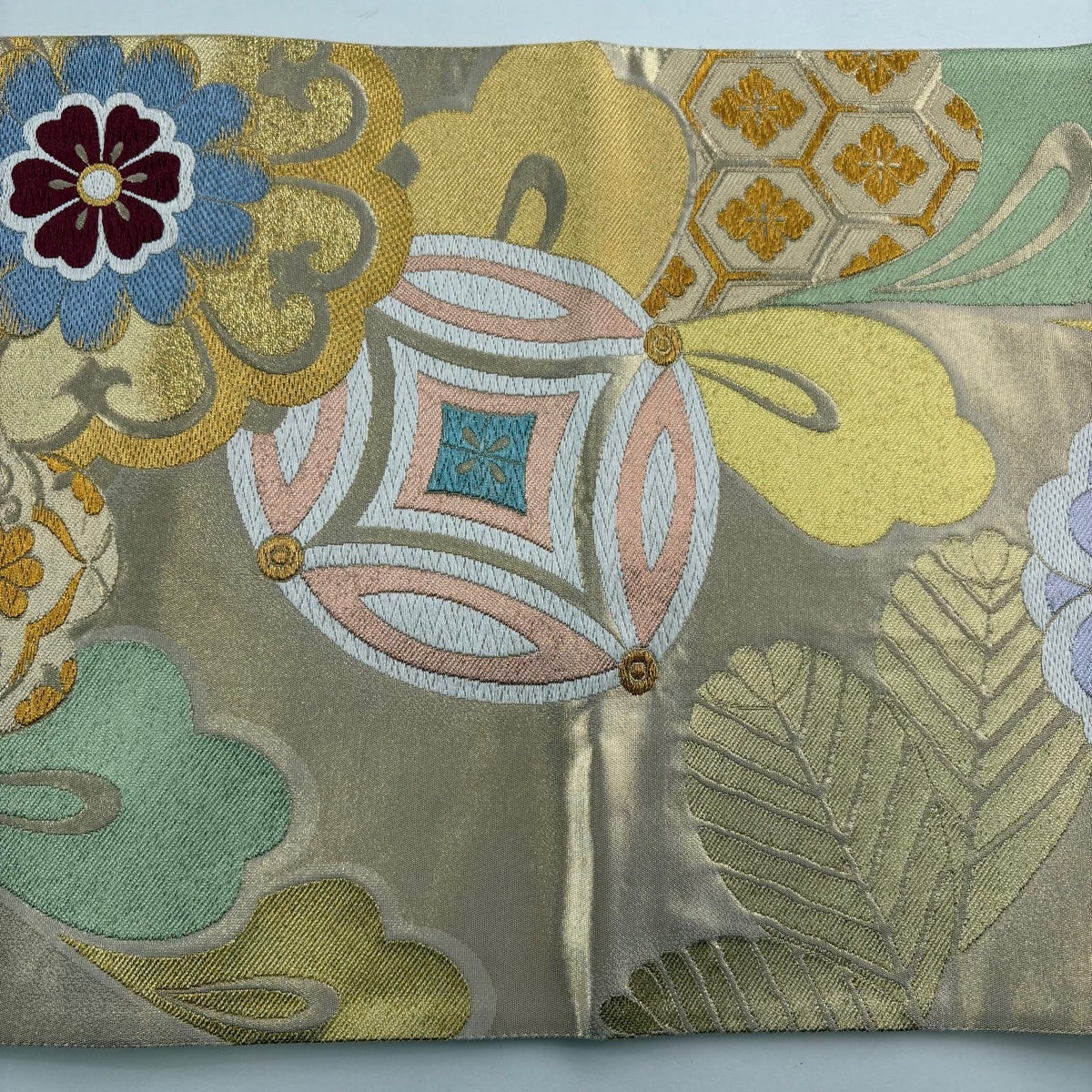 【美品】 袋帯 秀品 華文 草花 金銀彩 螺鈿 灰緑 お太鼓柄 正絹