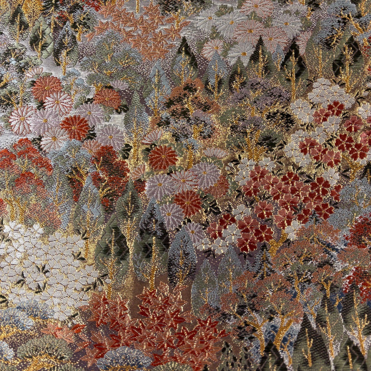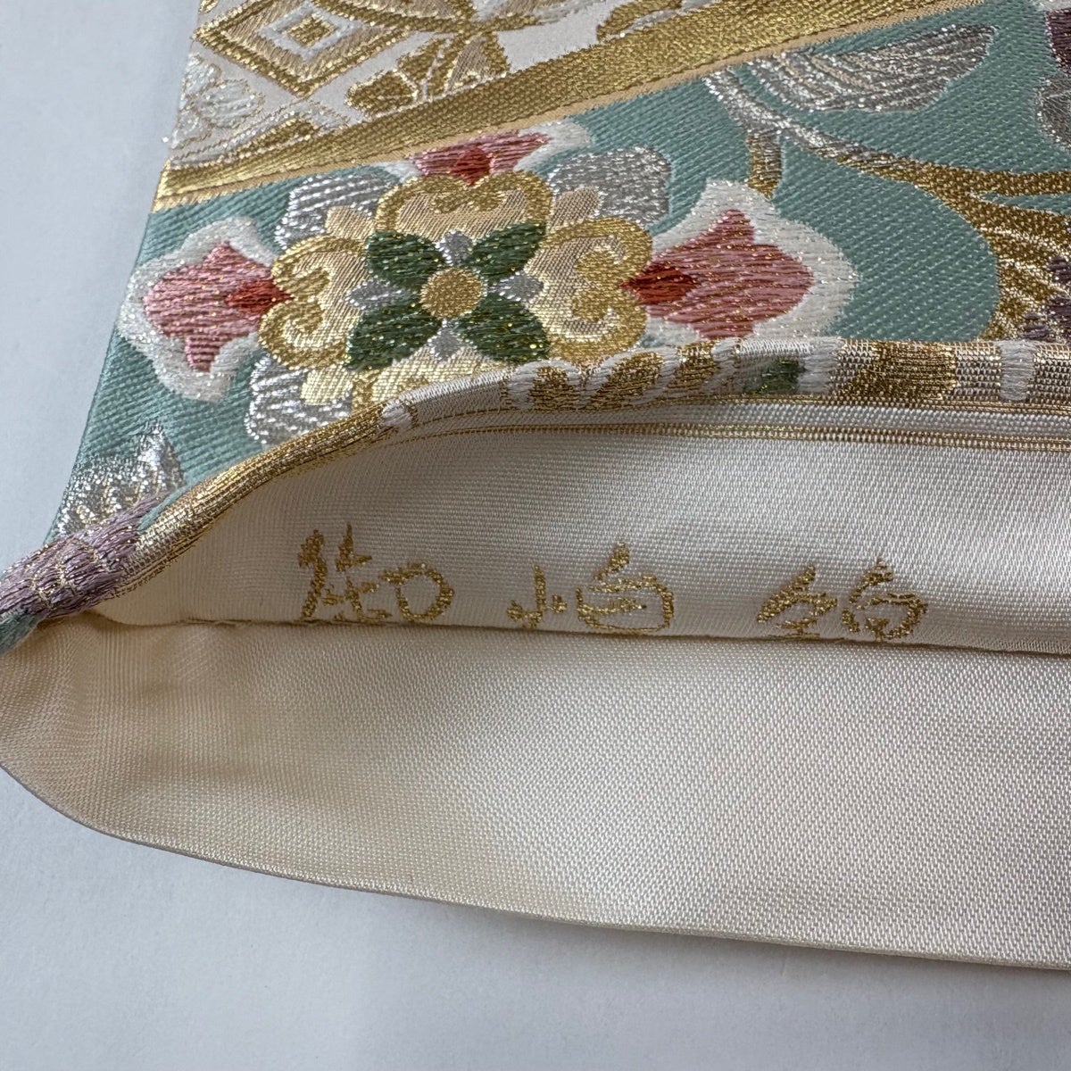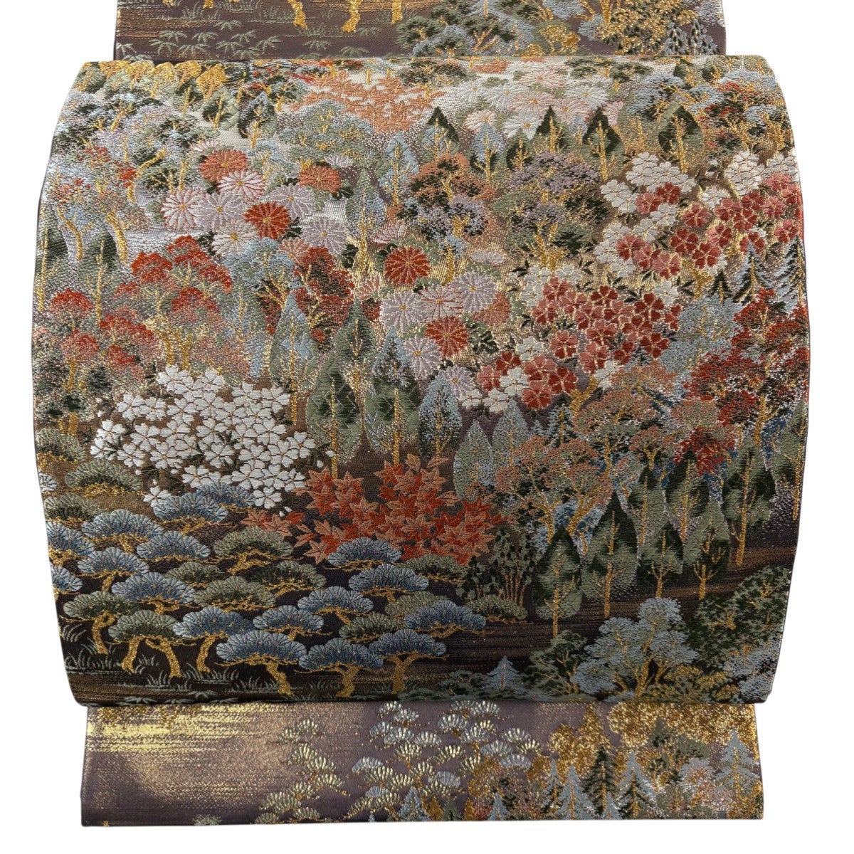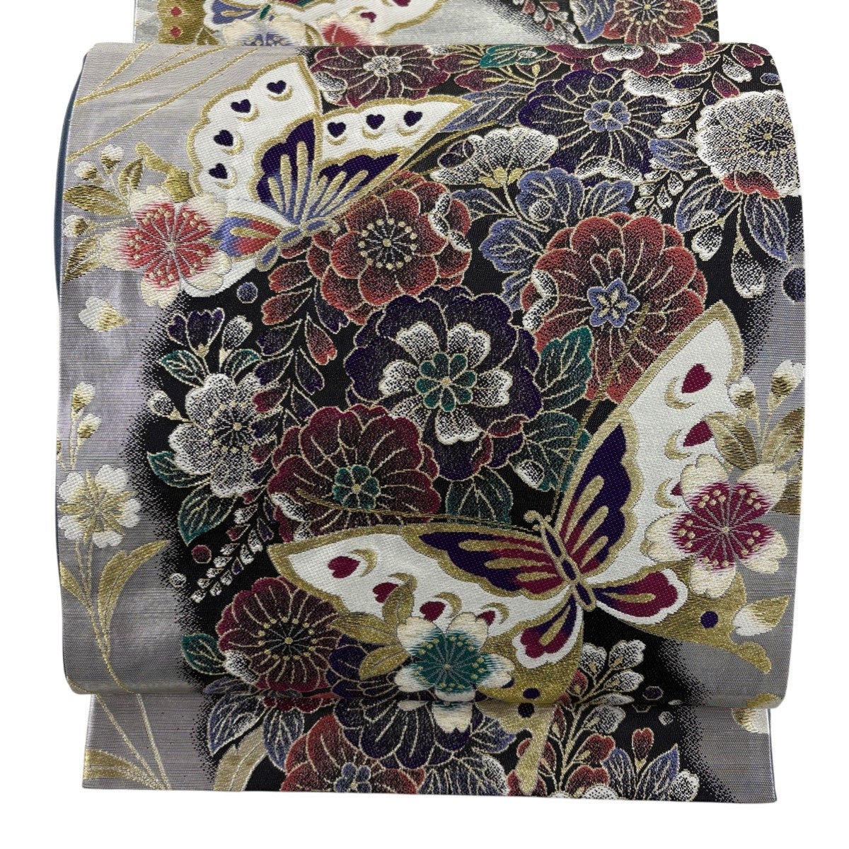 【美品】 袋帯 秀品 華文 草花 金銀彩 螺鈿 灰緑 お太鼓柄 正絹