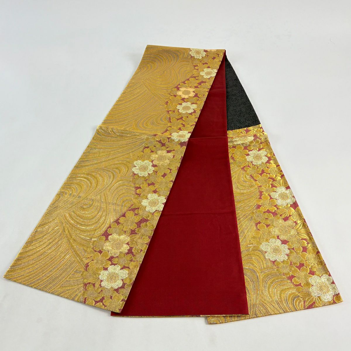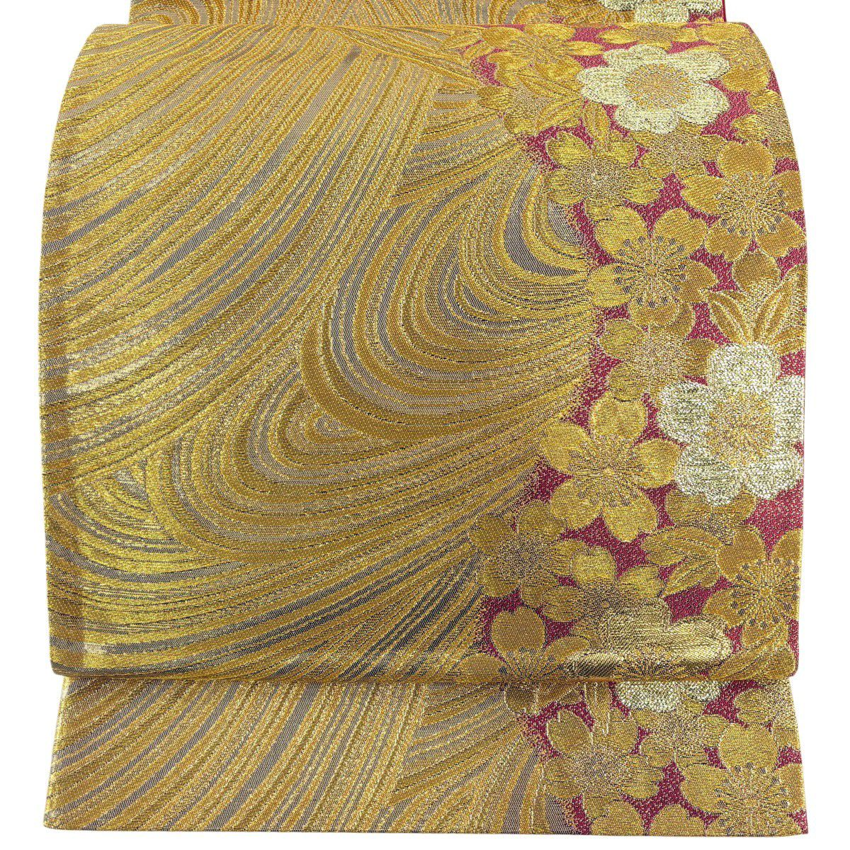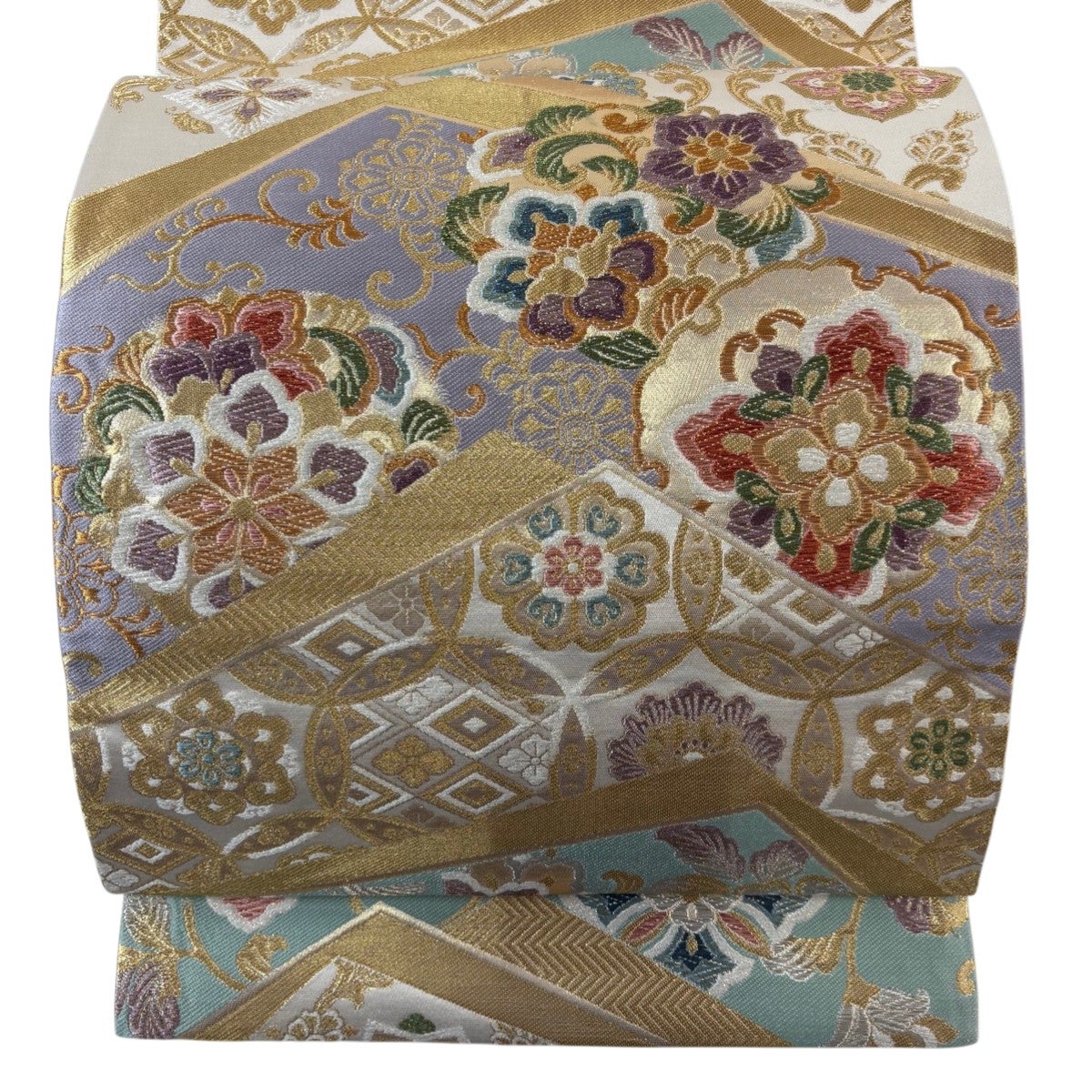 【美品】 袋帯 秀品 振袖向き 桜 幾何学 金糸 箔 金色 六通 正絹