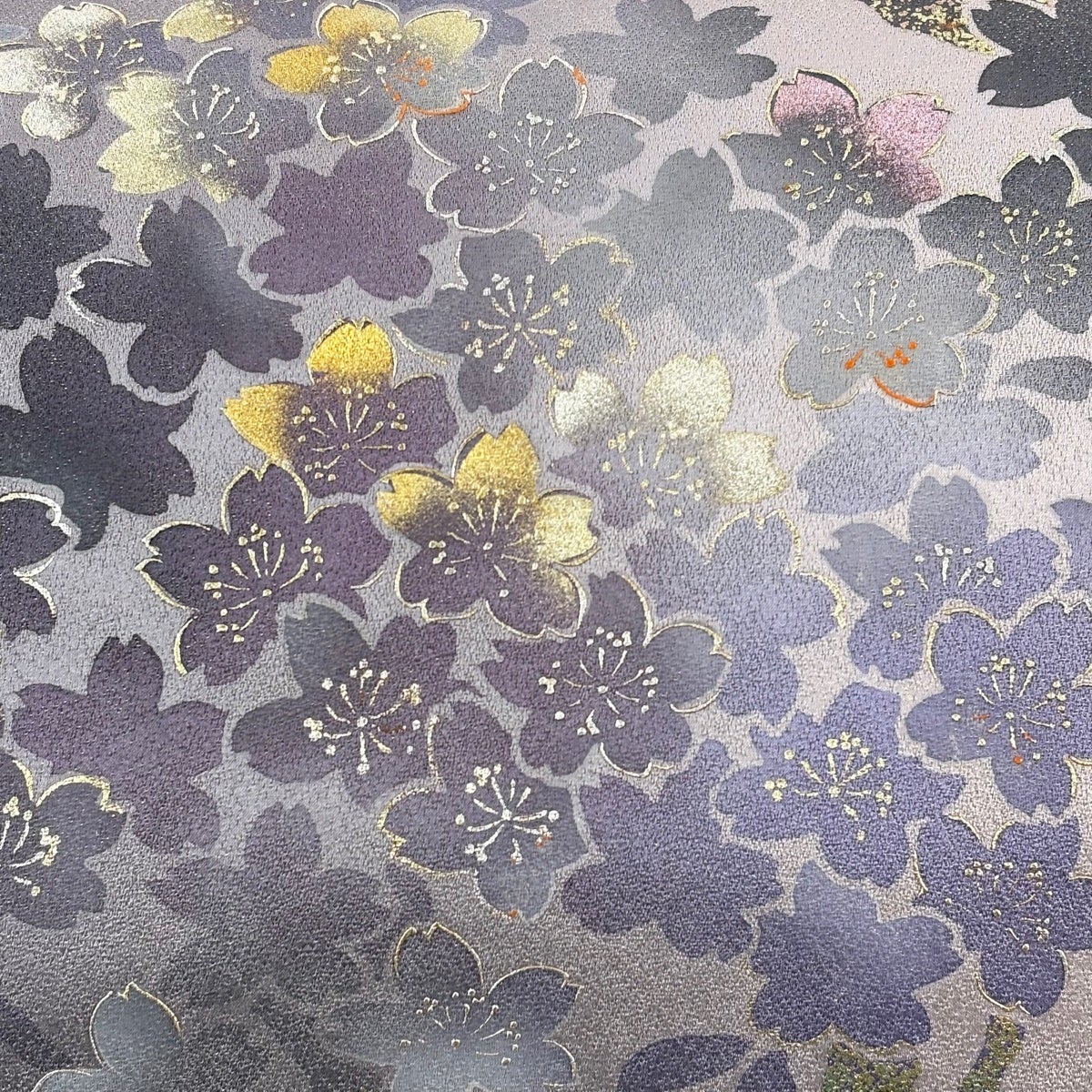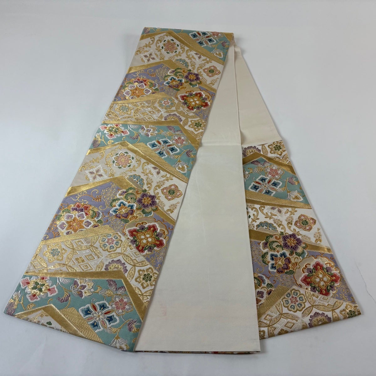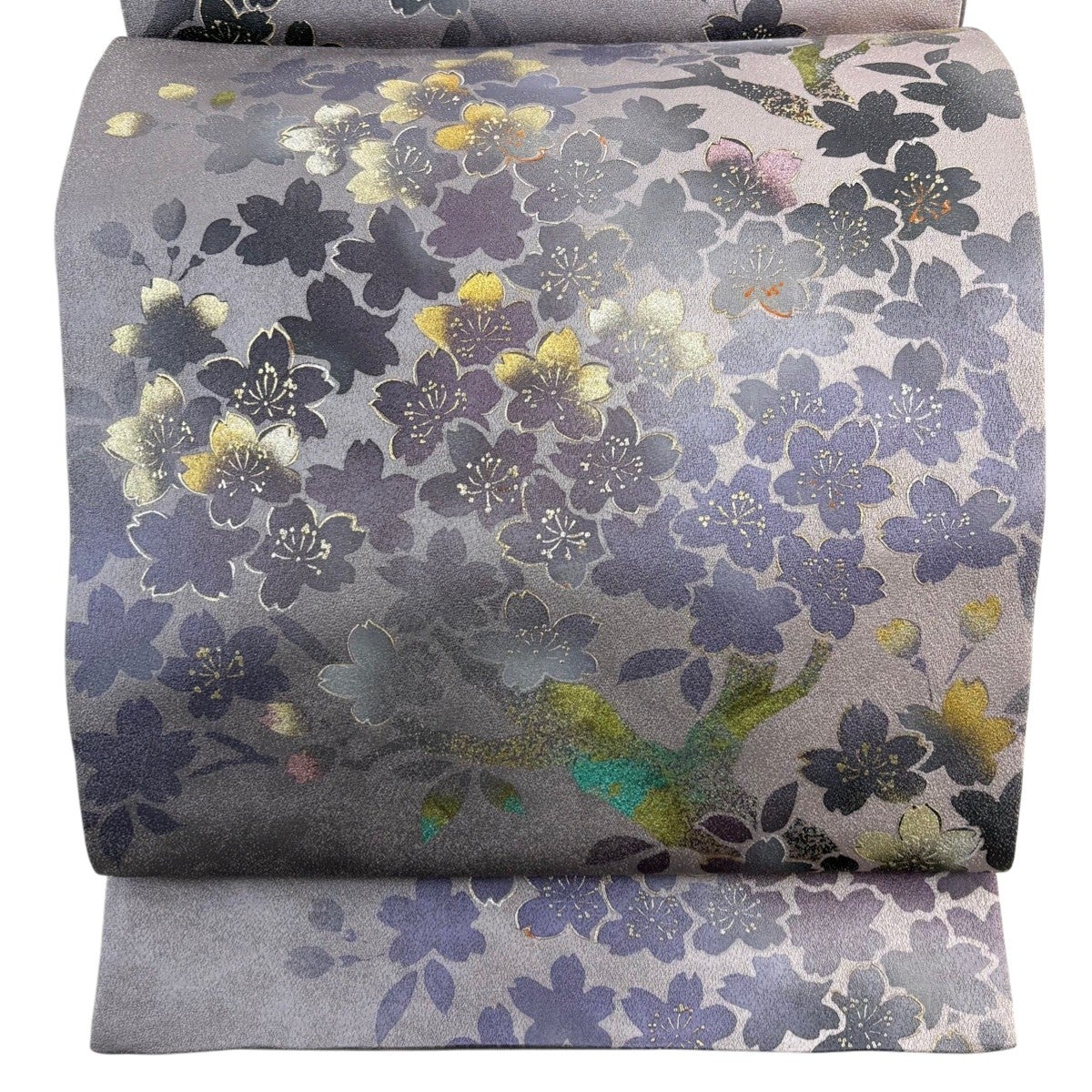 【美品】 袋帯 秀品 振袖向き 桜 幾何学 金糸 箔 金色 六通 正絹