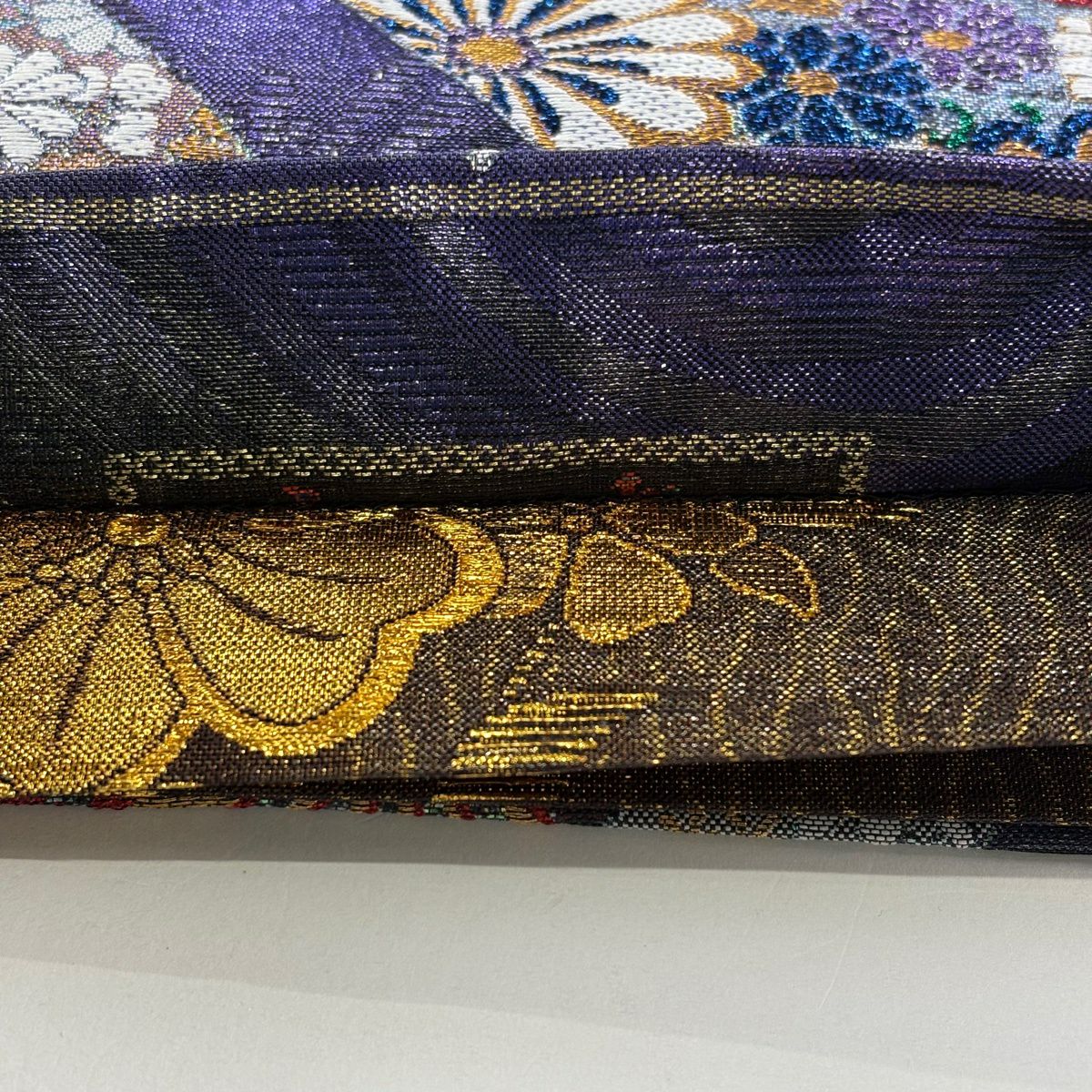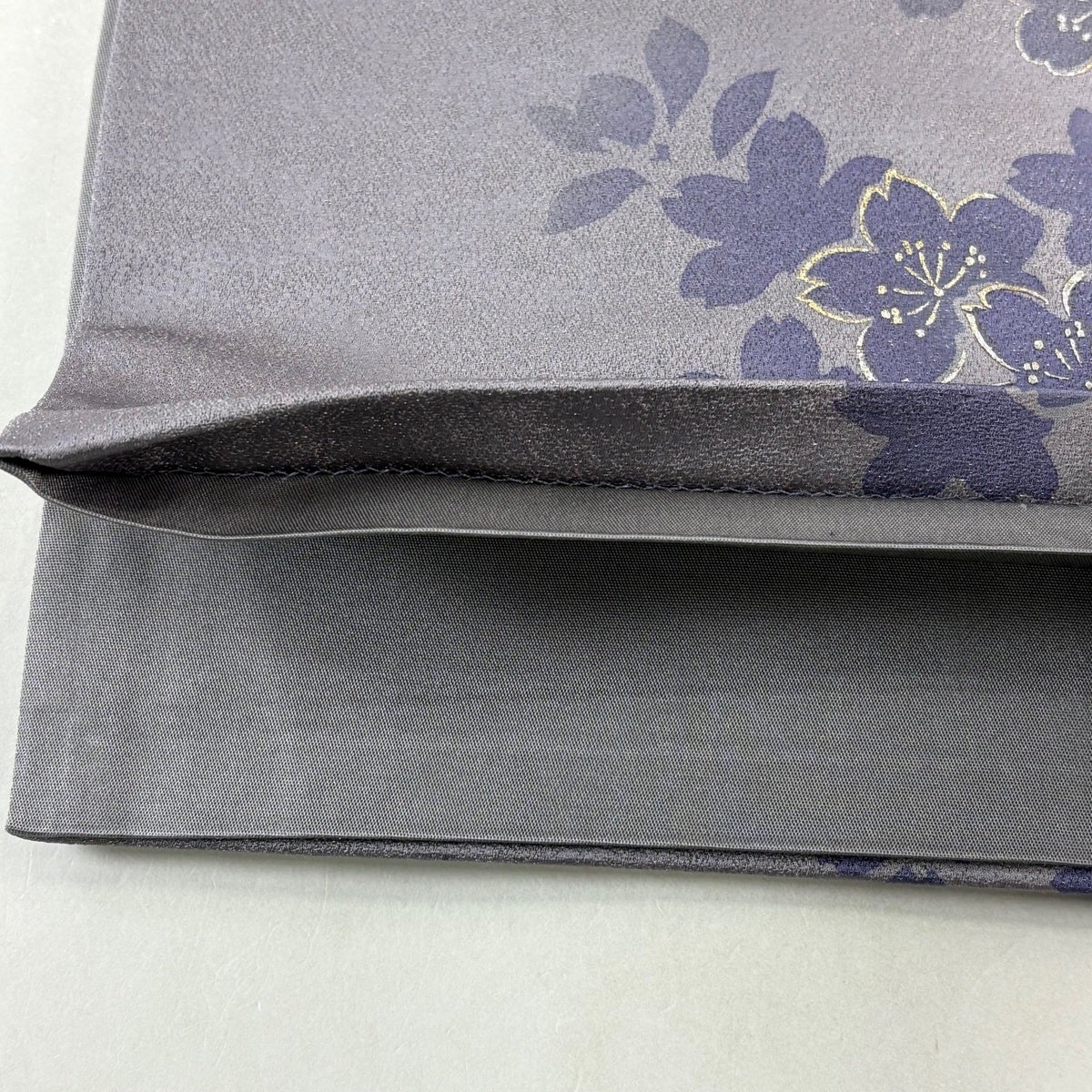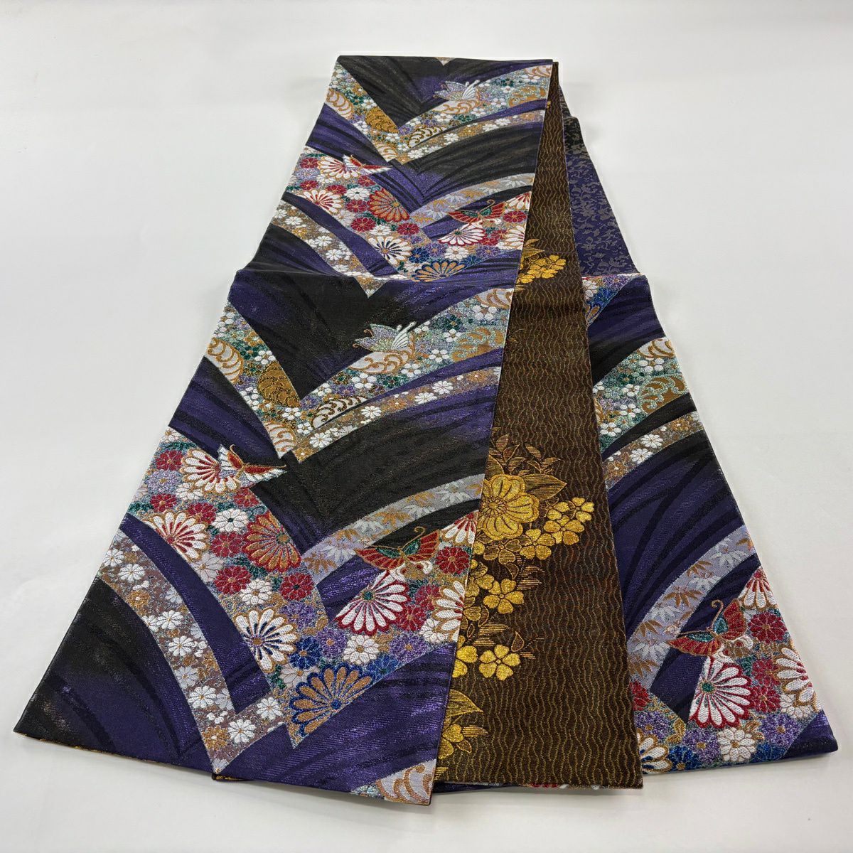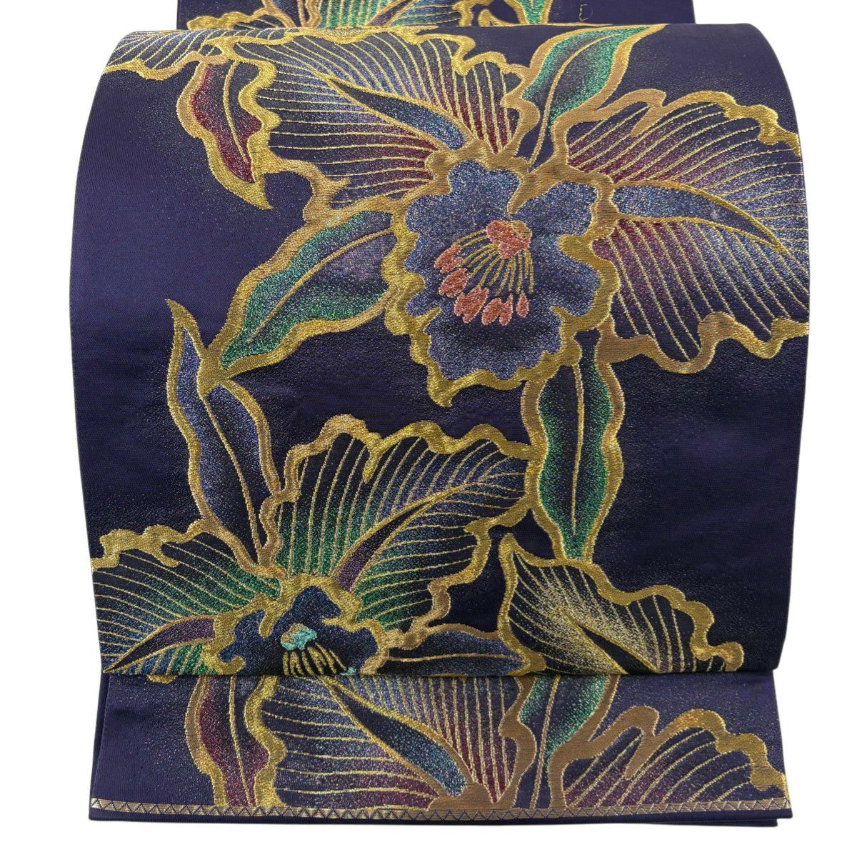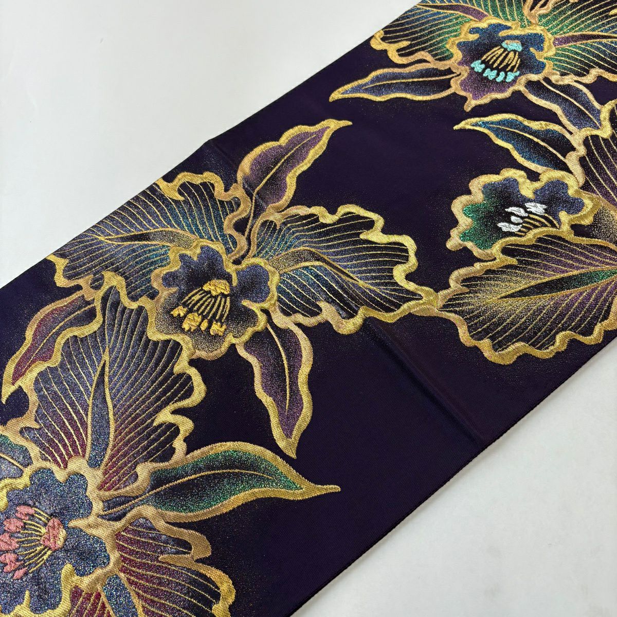 【美品】 袋帯 秀品 じゅらく 落款あり 花 金糸 濃紫 六通 正絹