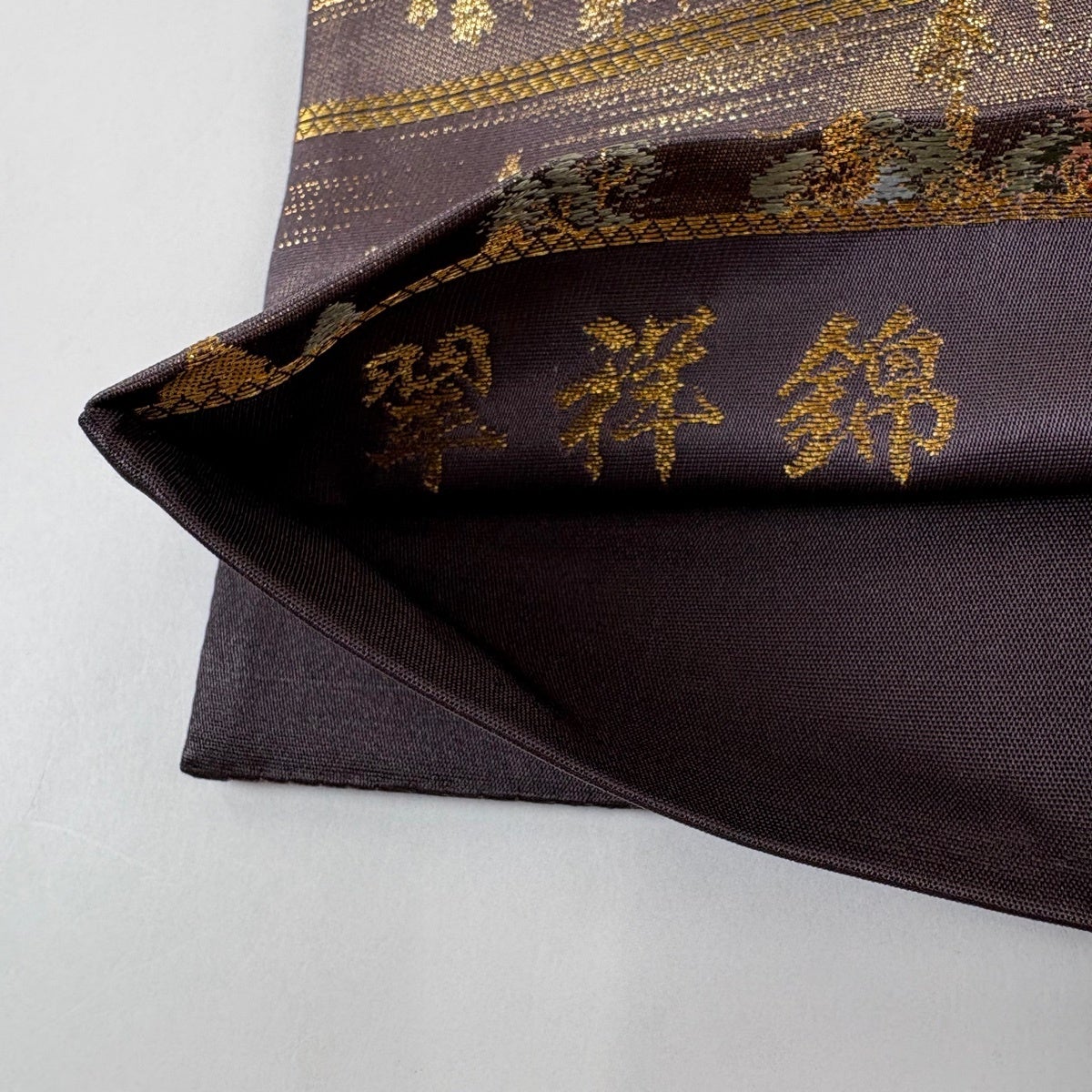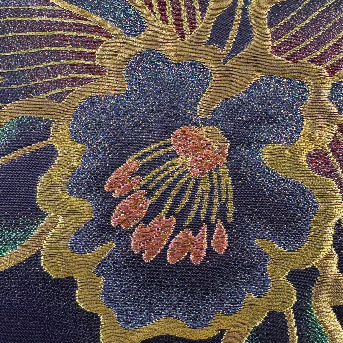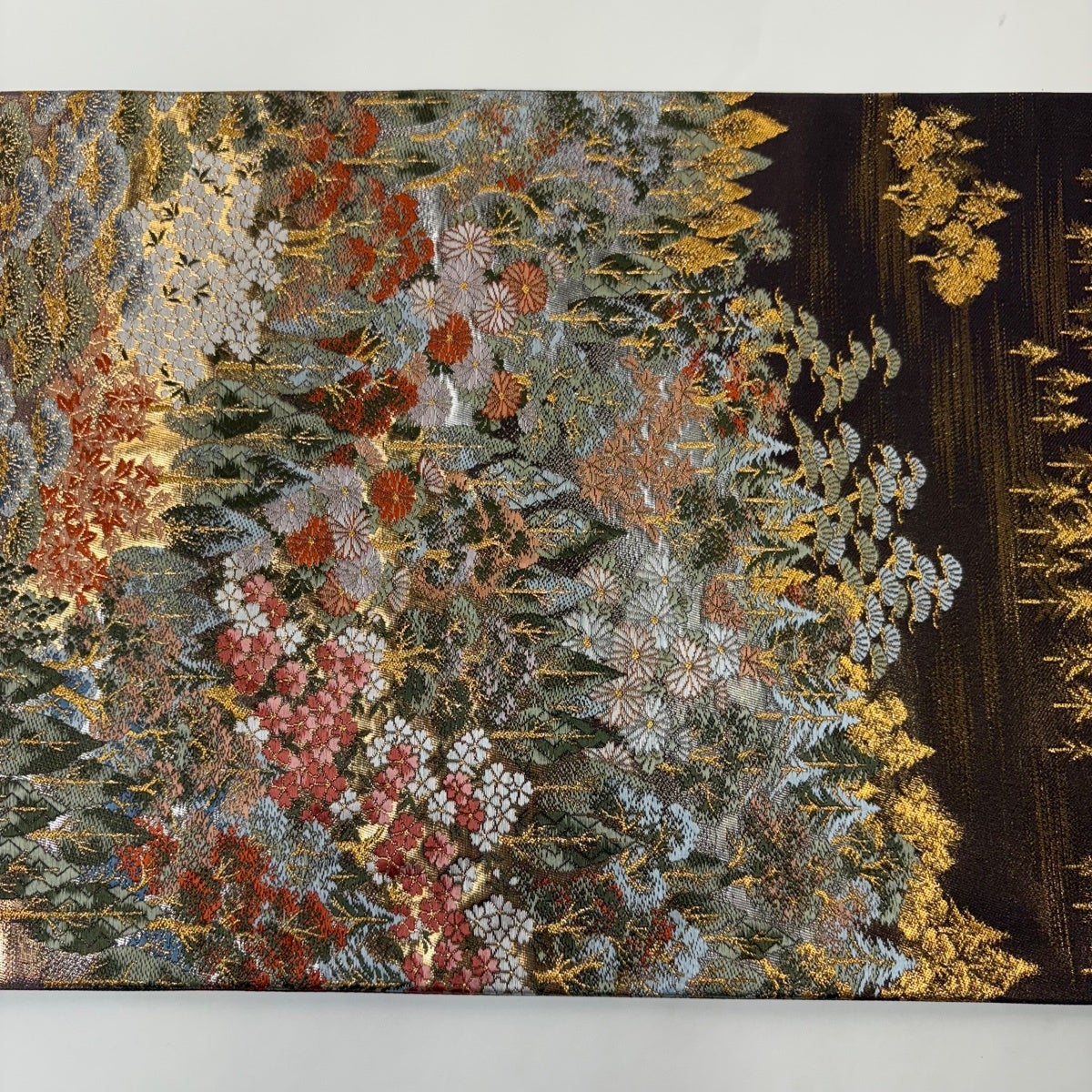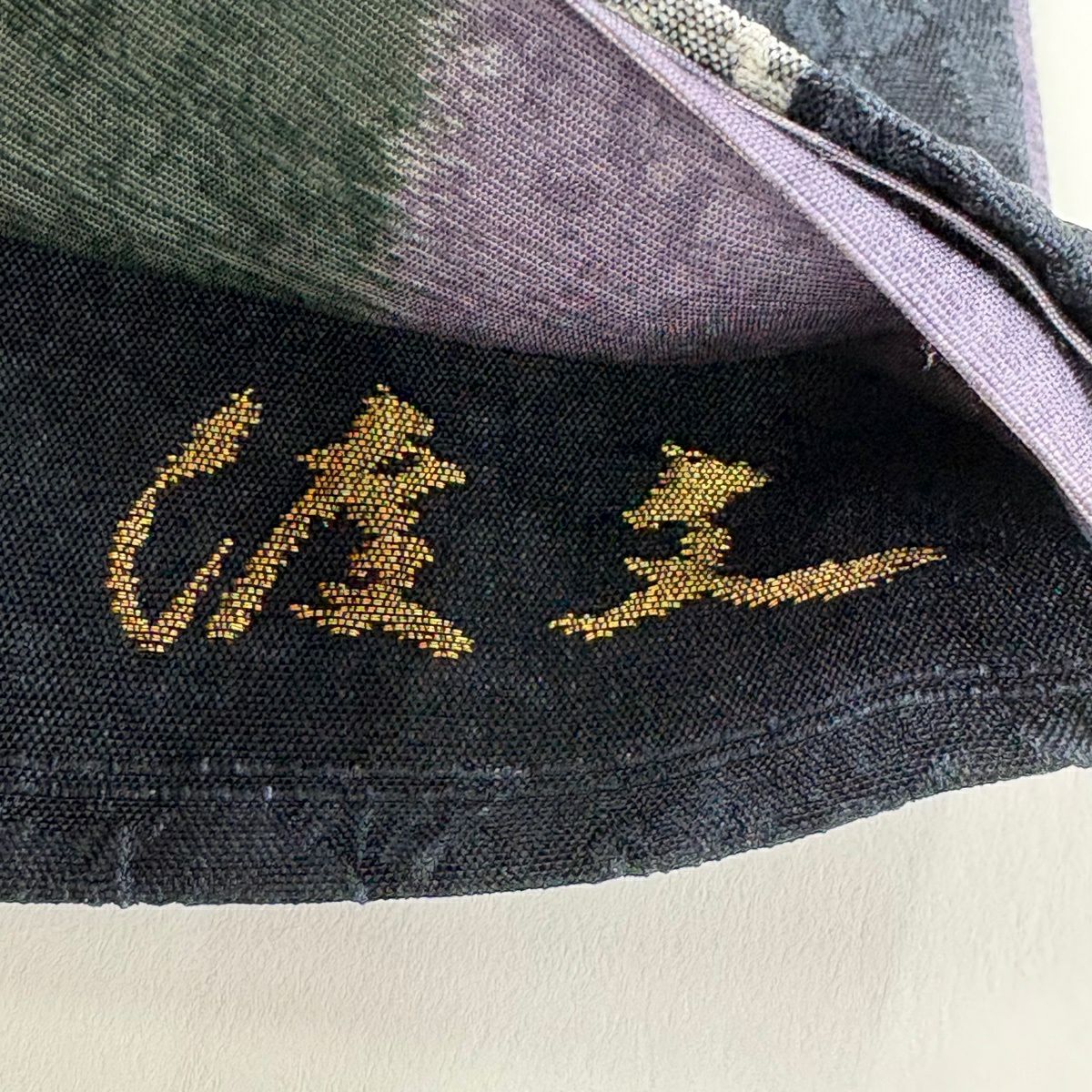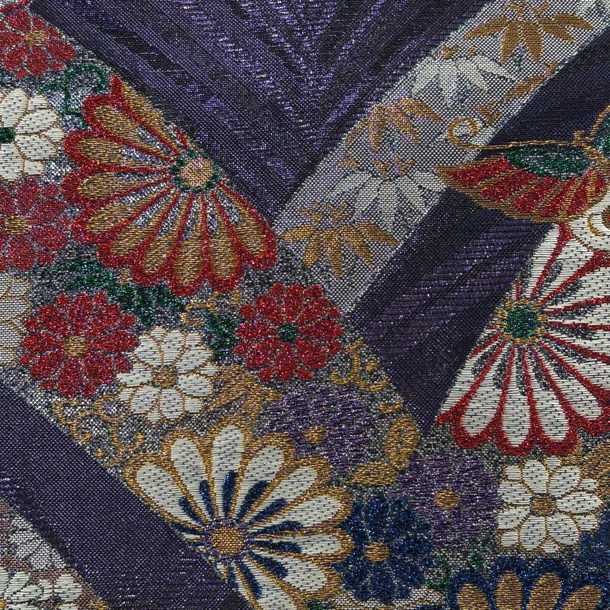 【美品】 袋帯 秀品 じゅらく 落款あり 花 金糸 濃紫 六通 正絹