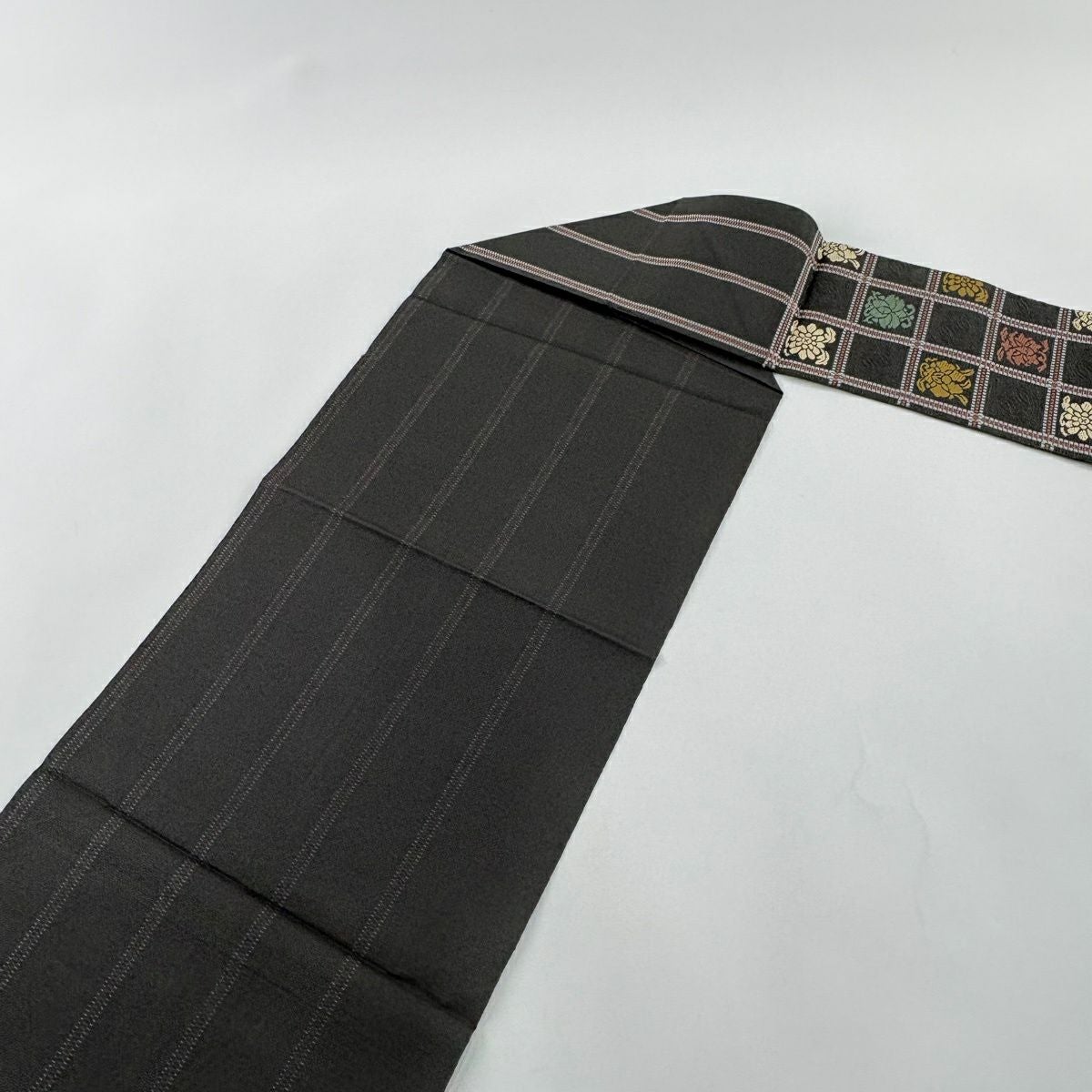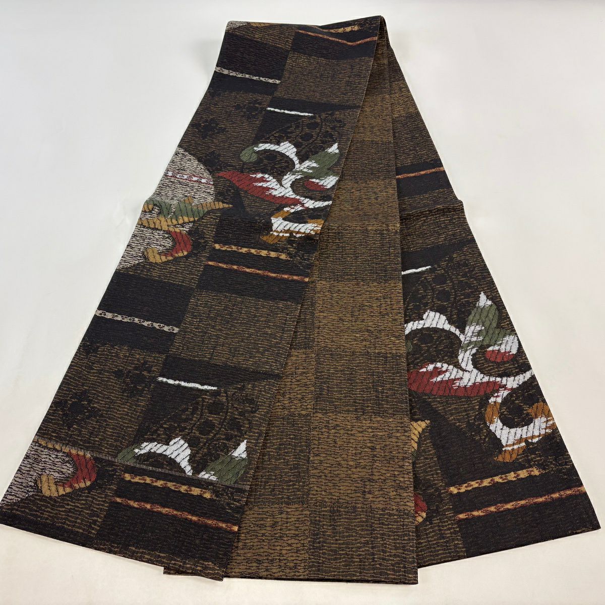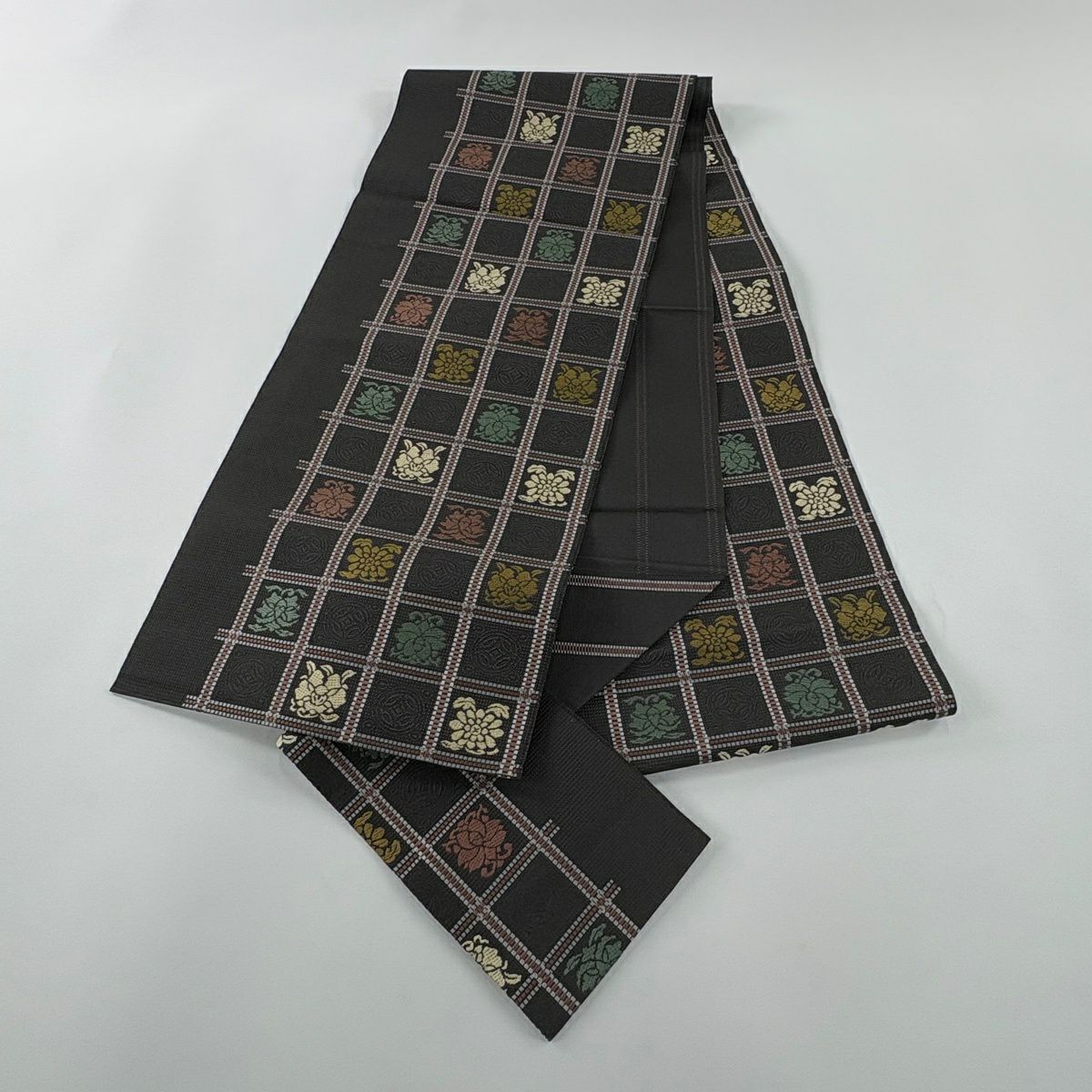 【美品】 名古屋帯 秀品 八寸名古屋帯 松葉仕立て 格子 花 焦茶色 正絹