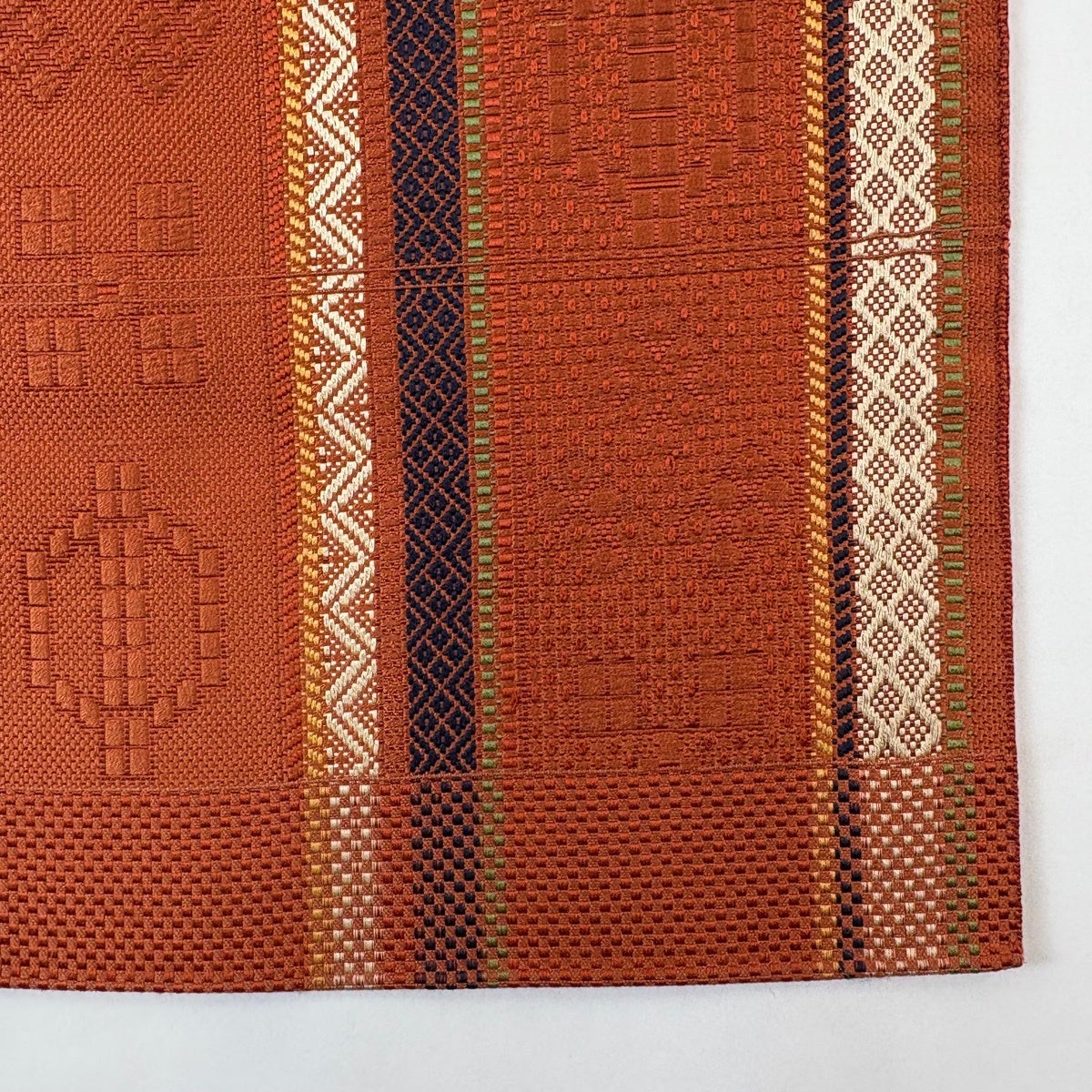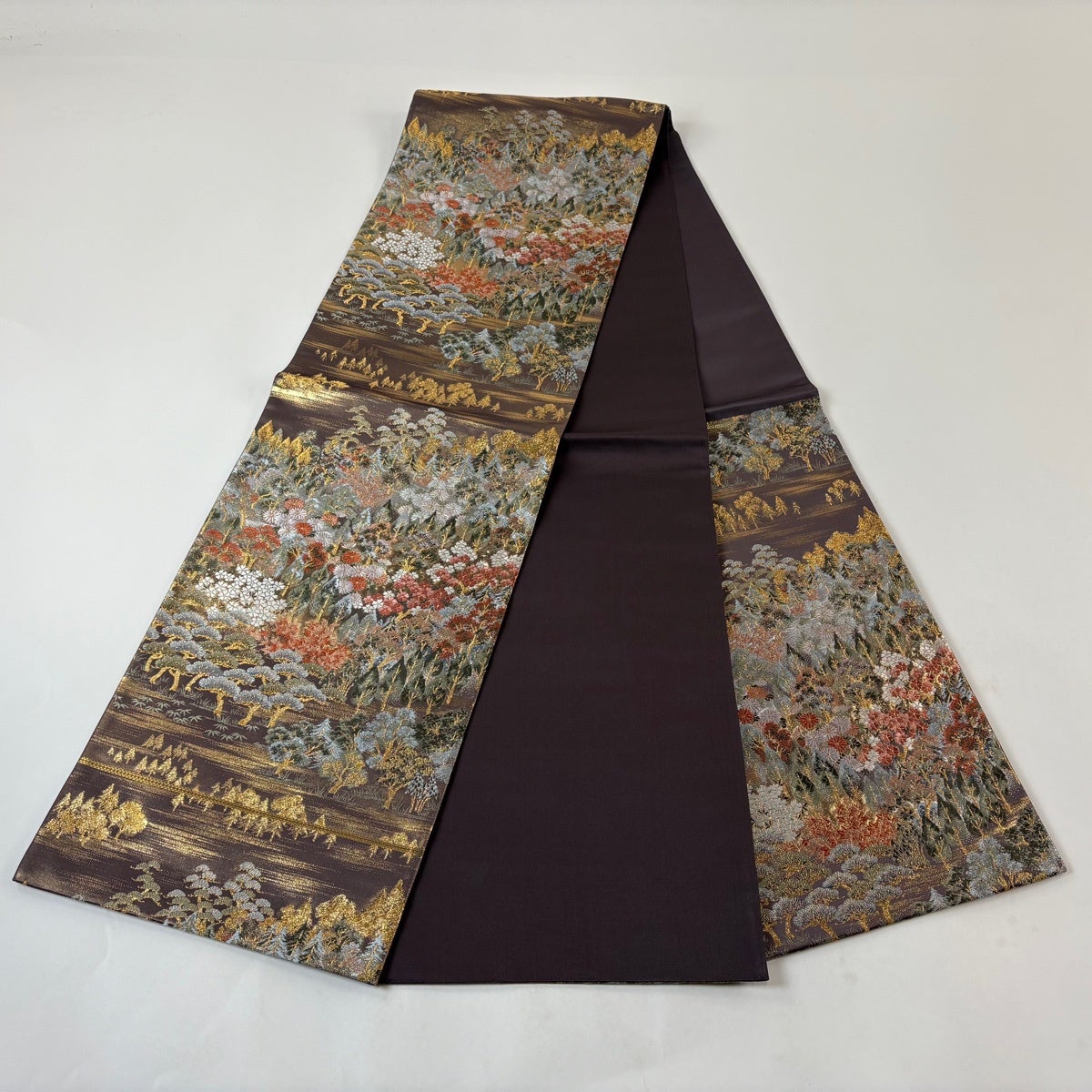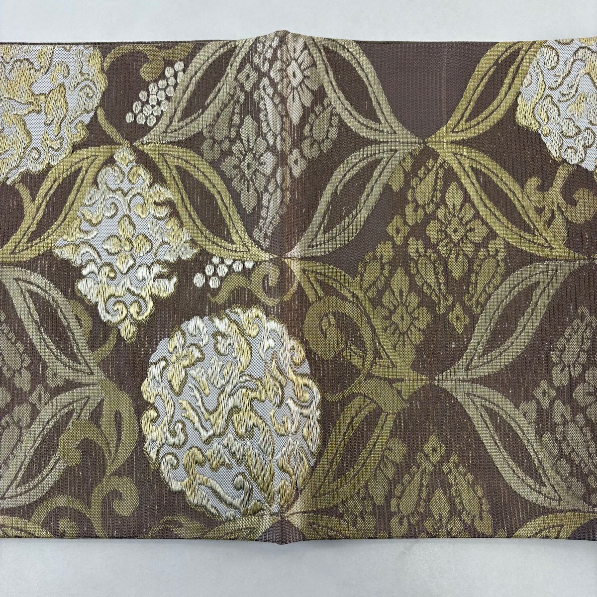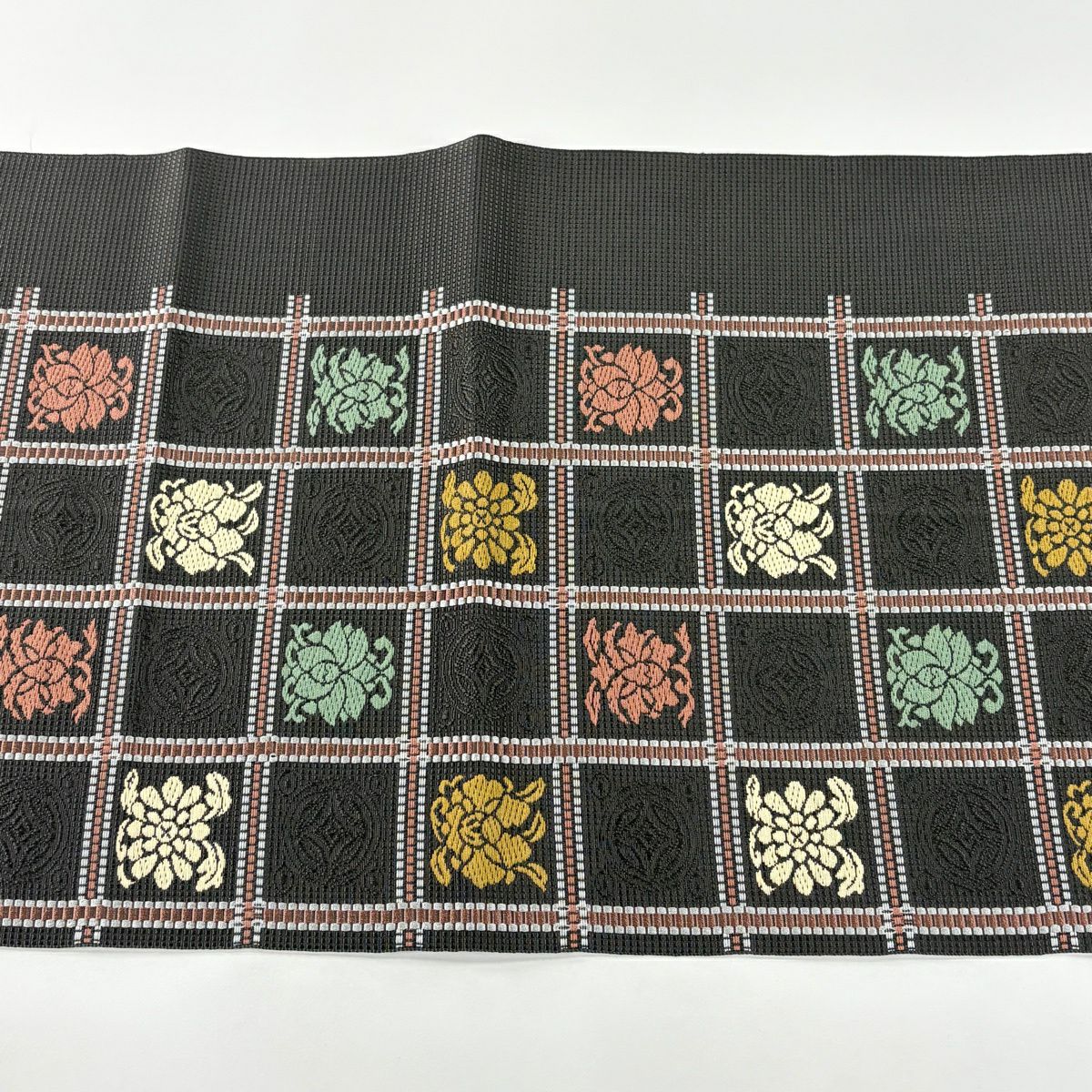 【美品】 名古屋帯 秀品 八寸名古屋帯 松葉仕立て 格子 花 焦茶色 正絹