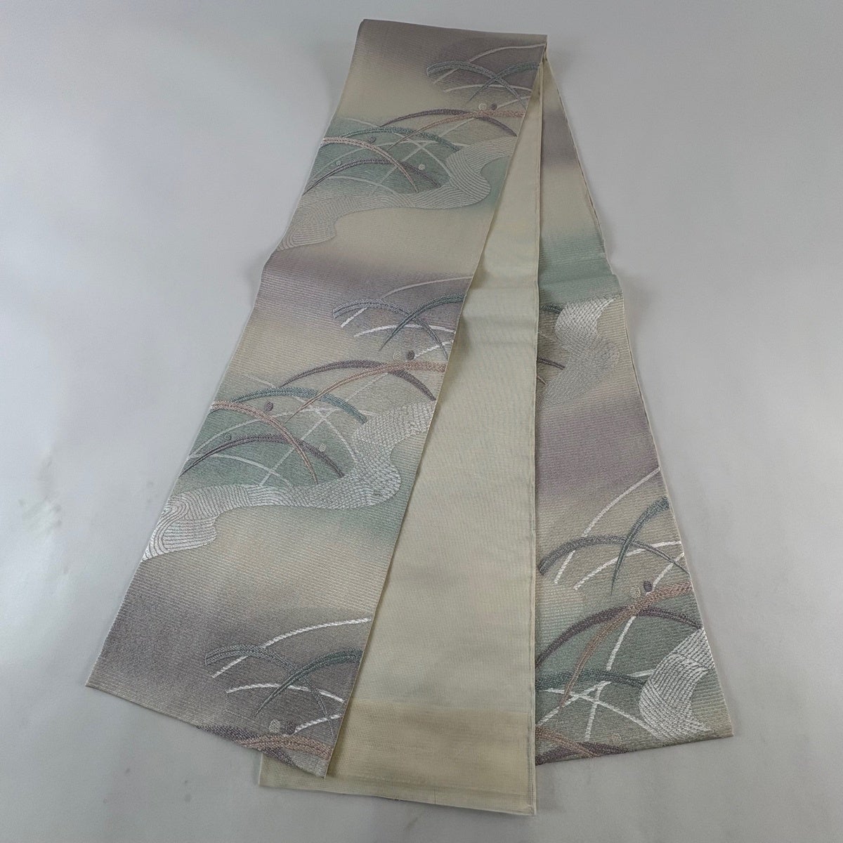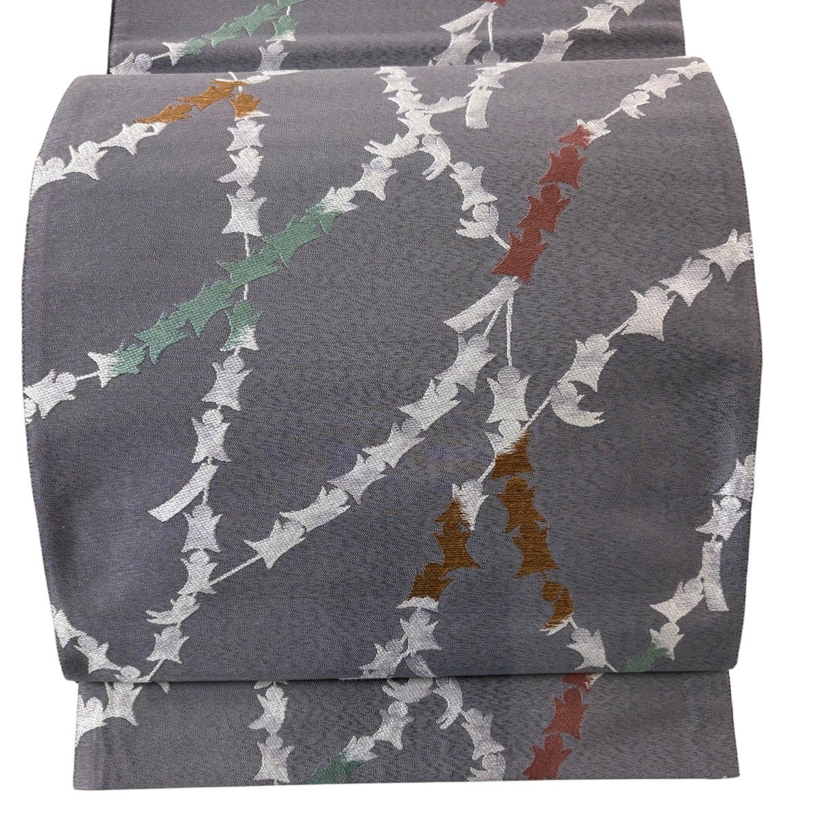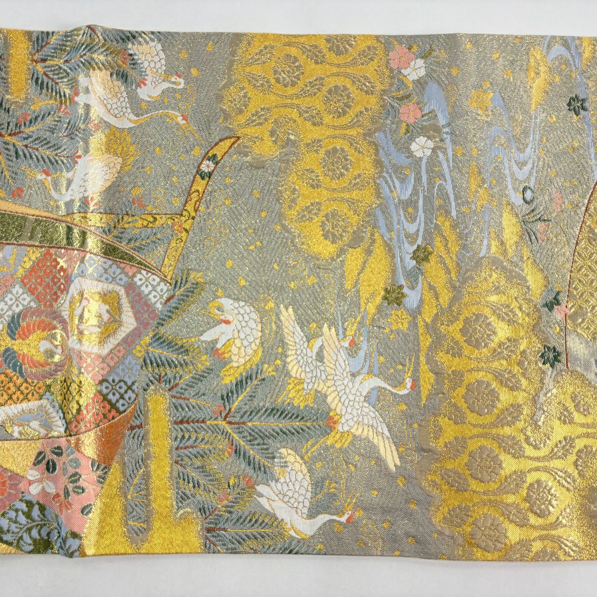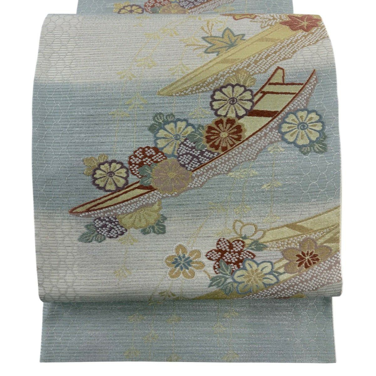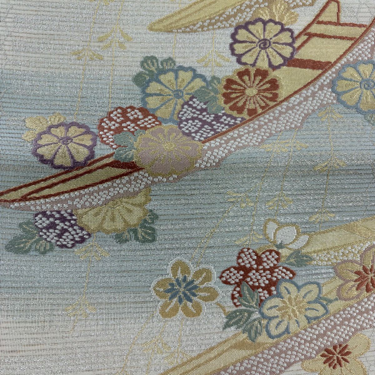 【美品】 袋帯 秀品 夏帯 絽 舟 草花 金糸 箔 灰緑 六通 正絹