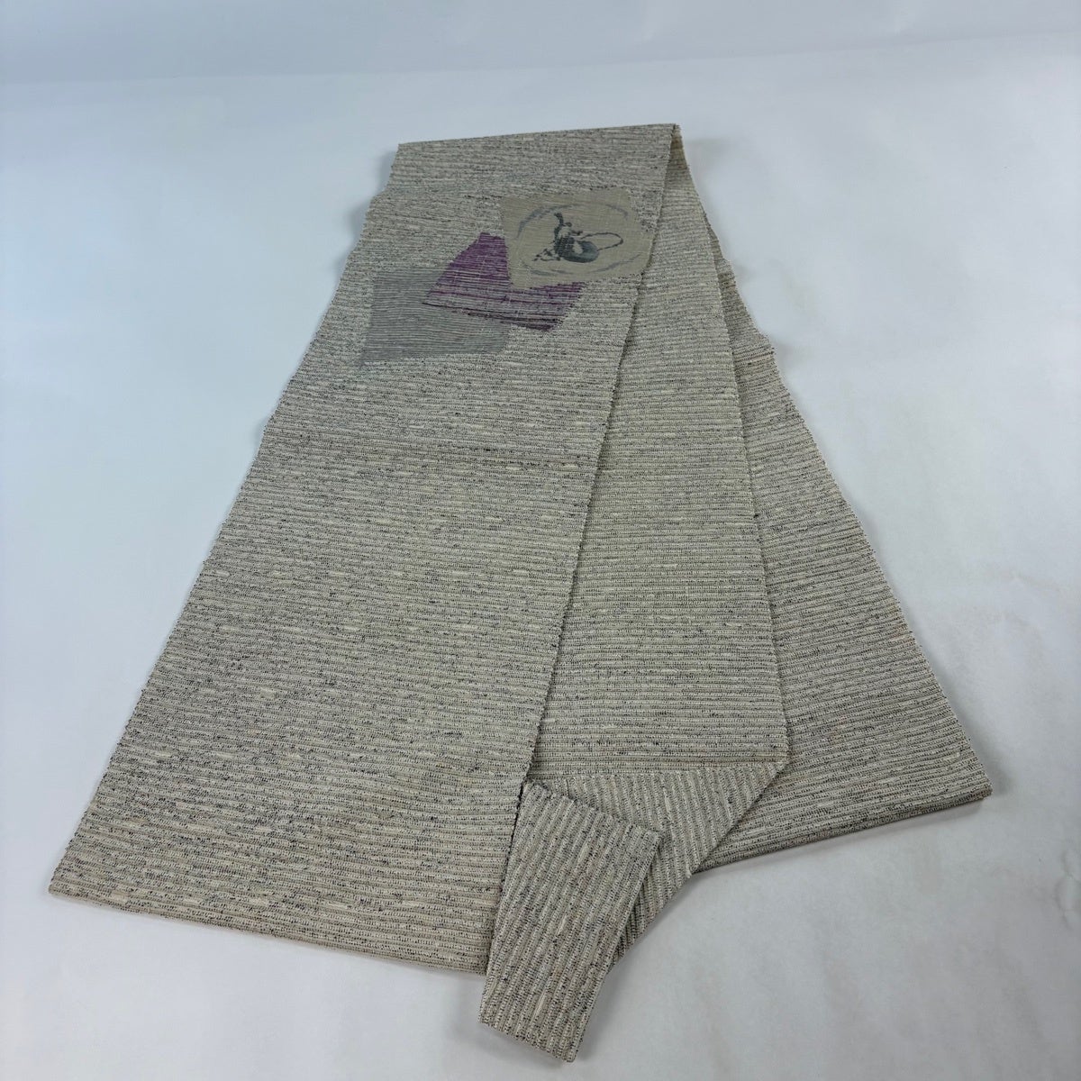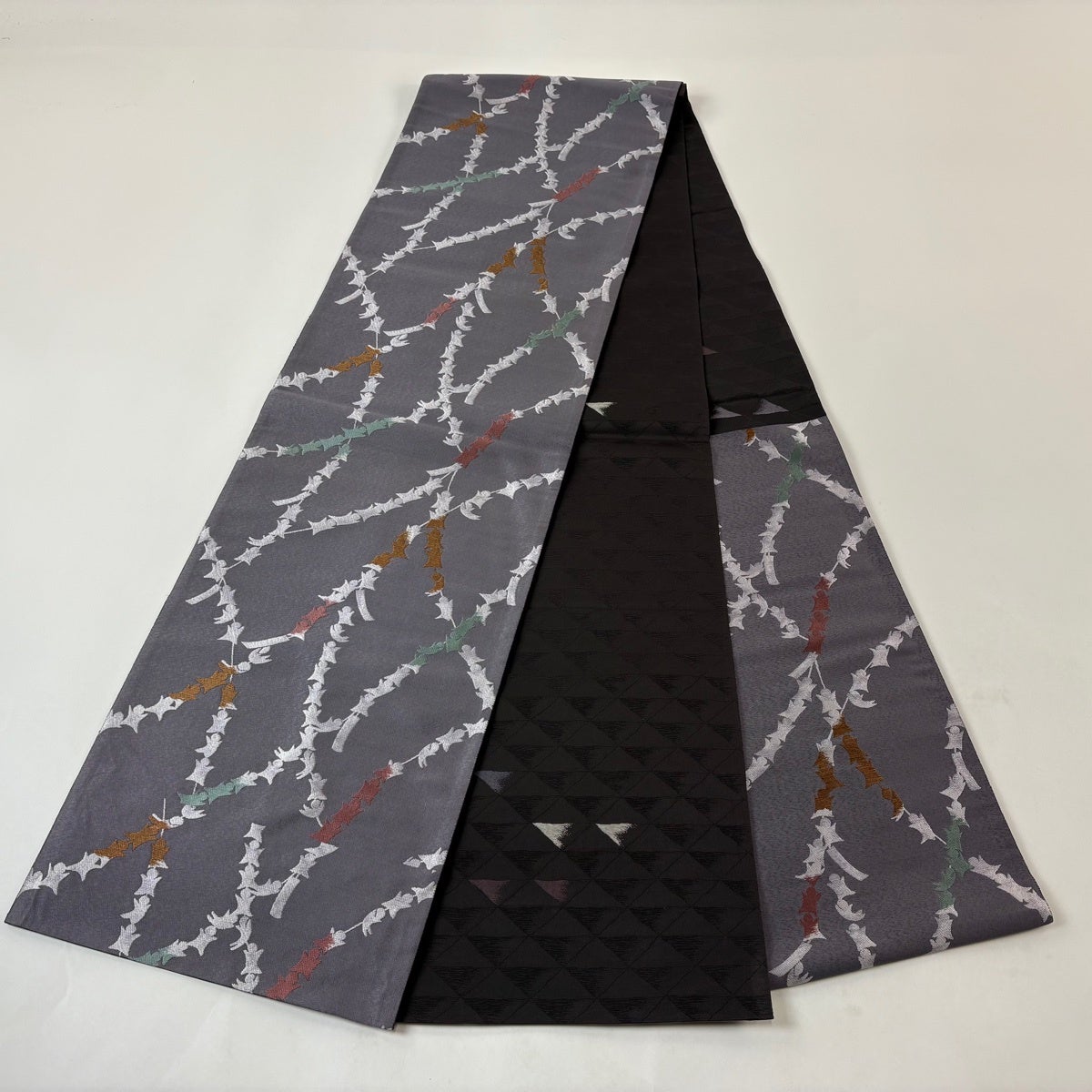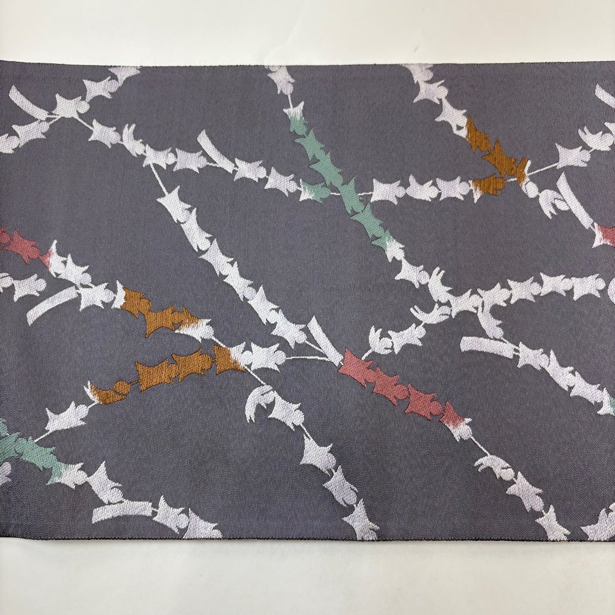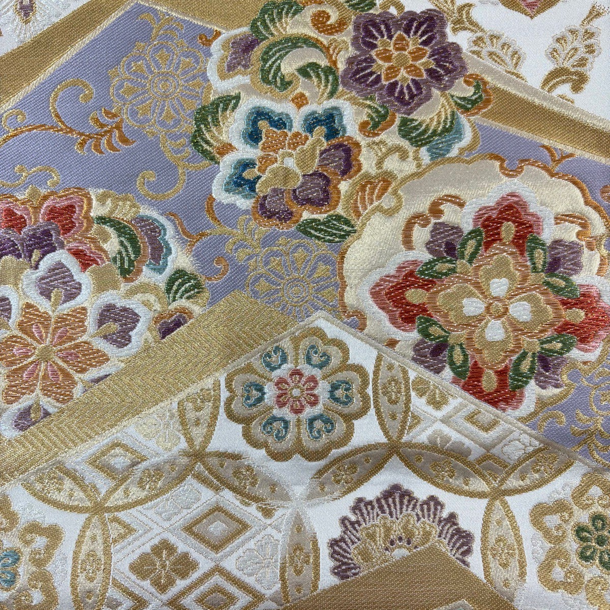 【美品】 袋帯 秀品 夏帯 幾何学模様 金通し 灰紫 お太鼓柄 正絹