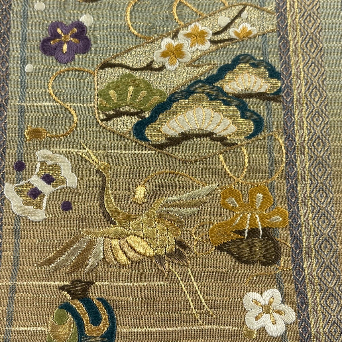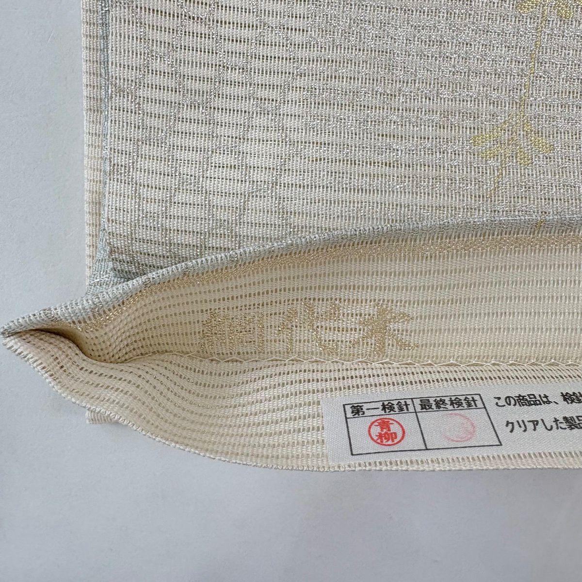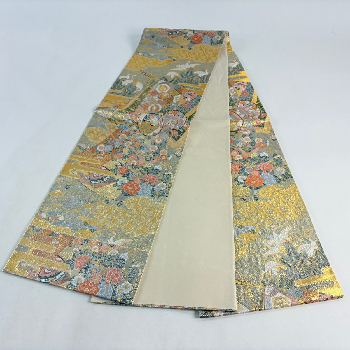 【美品】 袋帯 秀品 関西仕立て 夏帯 立涌 金糸 灰緑 全通 正絹