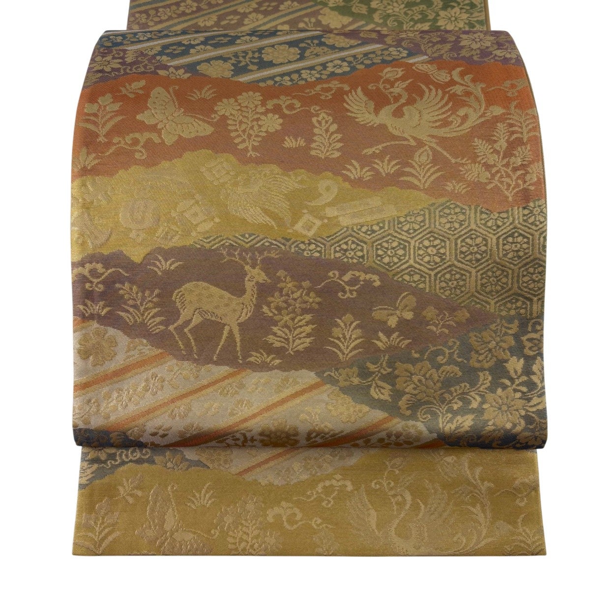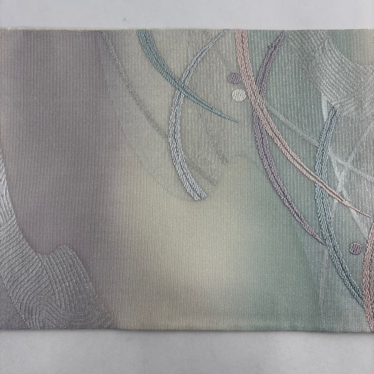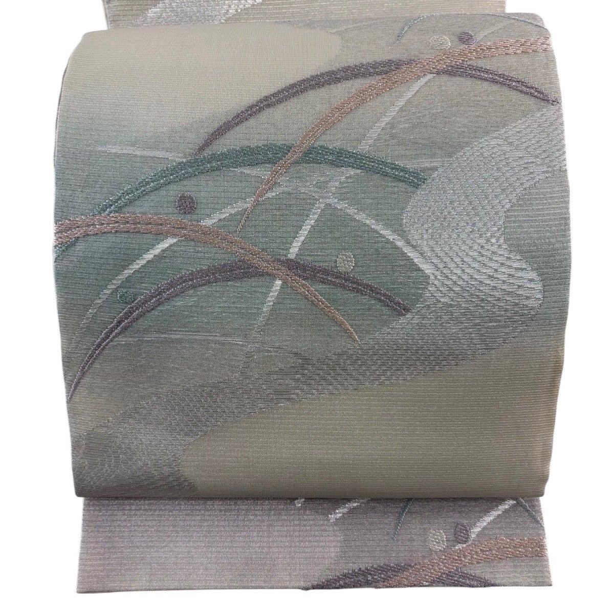 【美品】 袋帯 秀品 落款あり 斜縞 ぼかし 銀糸 鶯色 全通 正絹
