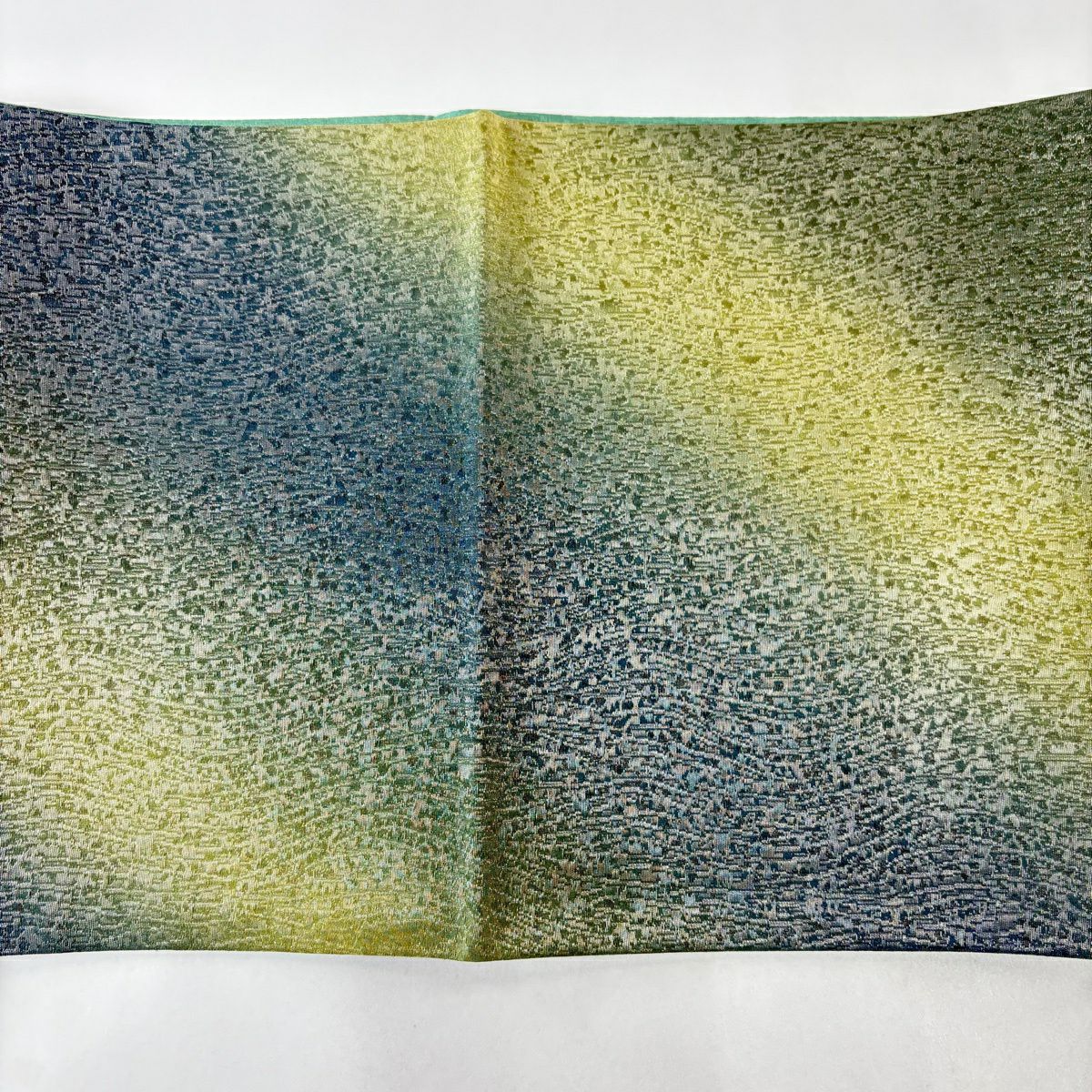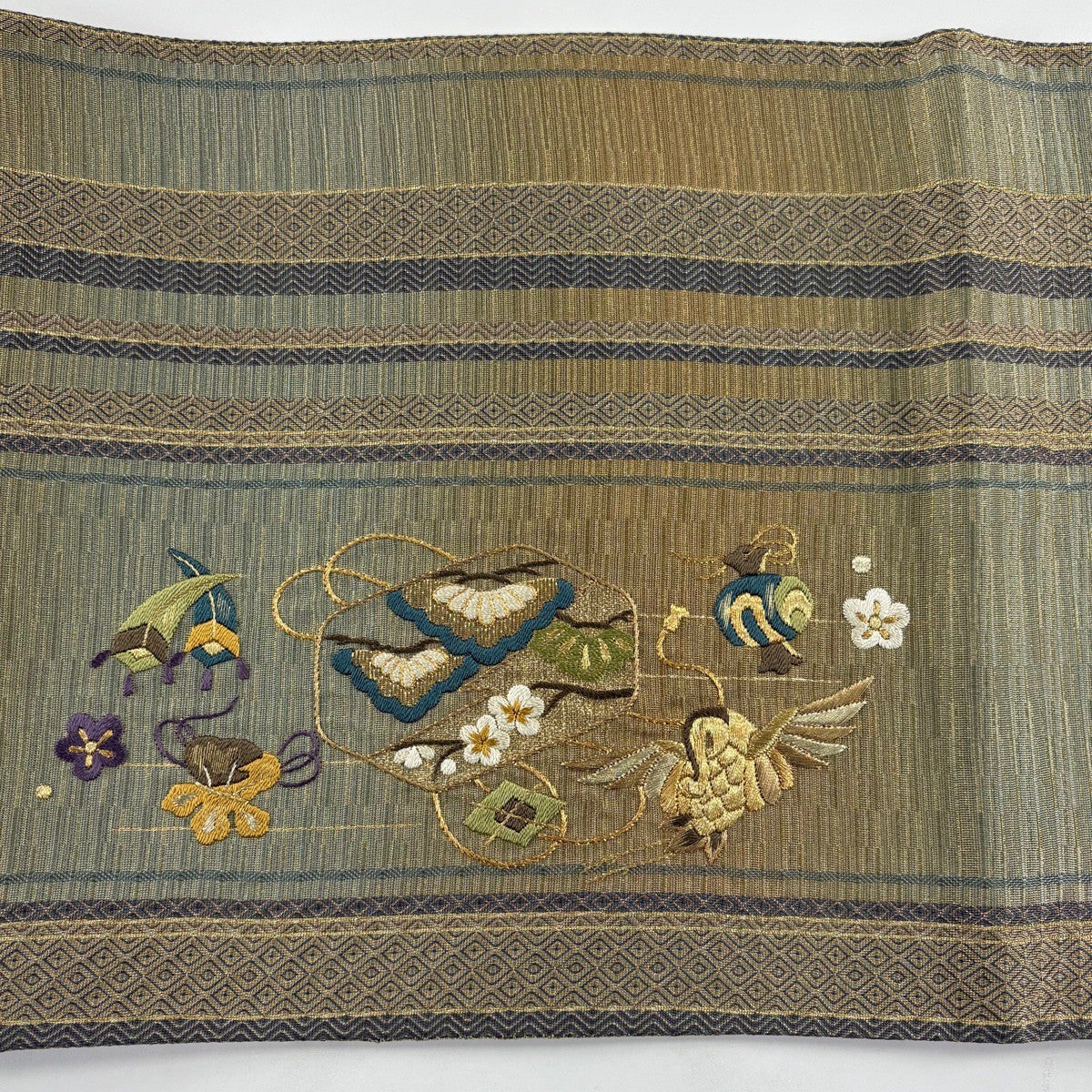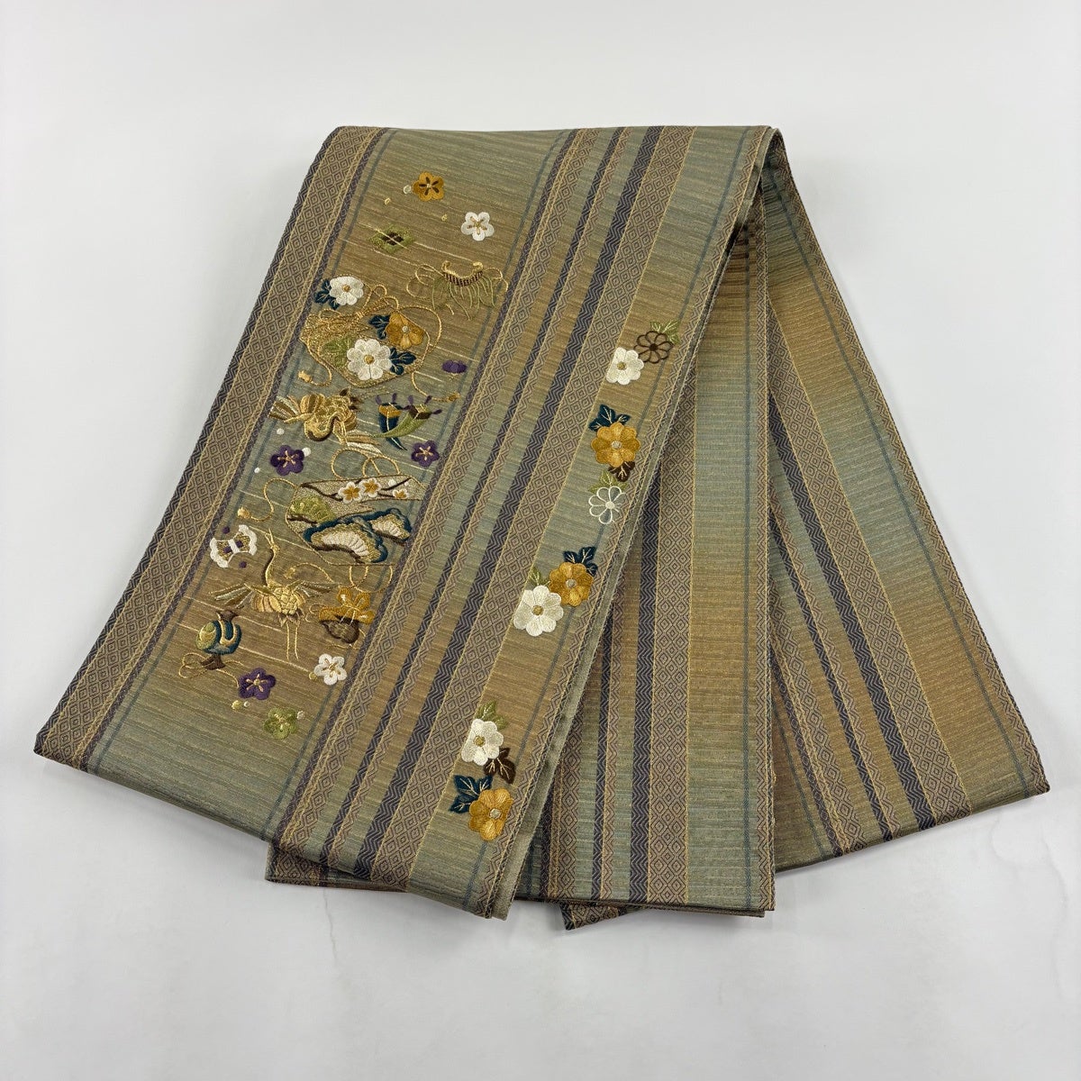 【美品】 袋帯 秀品 落款あり 斜縞 ぼかし 銀糸 鶯色 全通 正絹