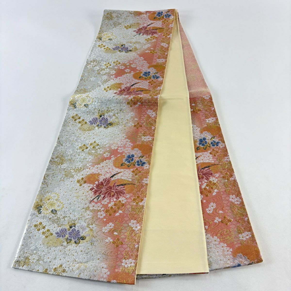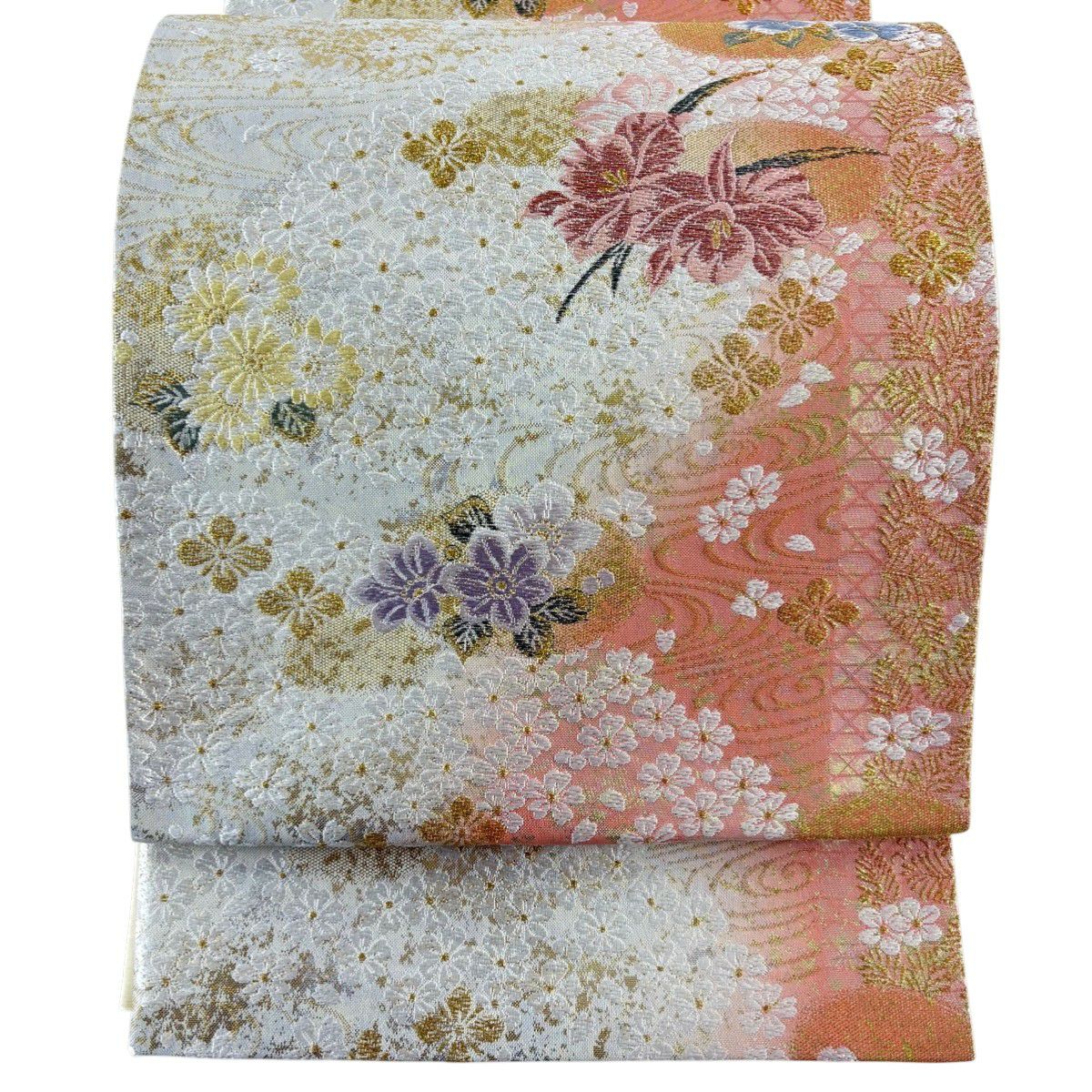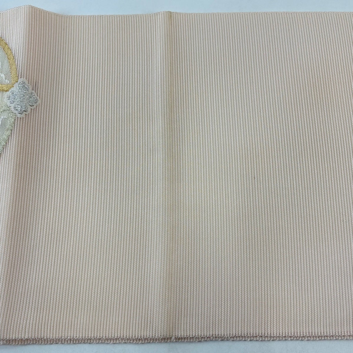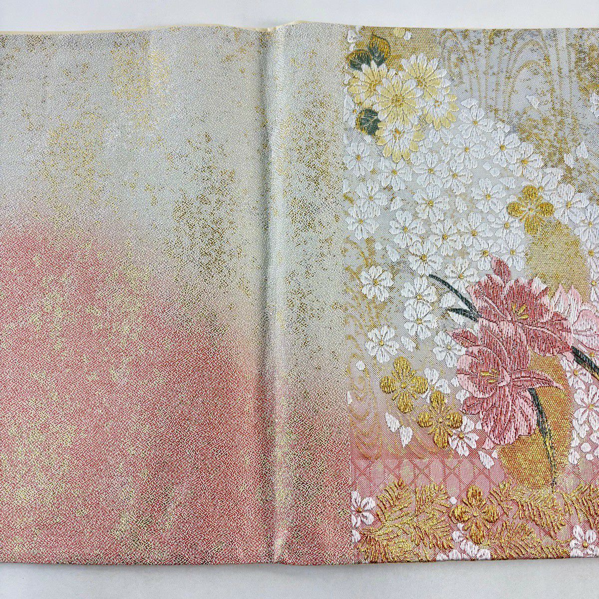 【美品】 袋帯 秀品 草花 流水 金銀糸 箔 薄ピンク 六通 正絹