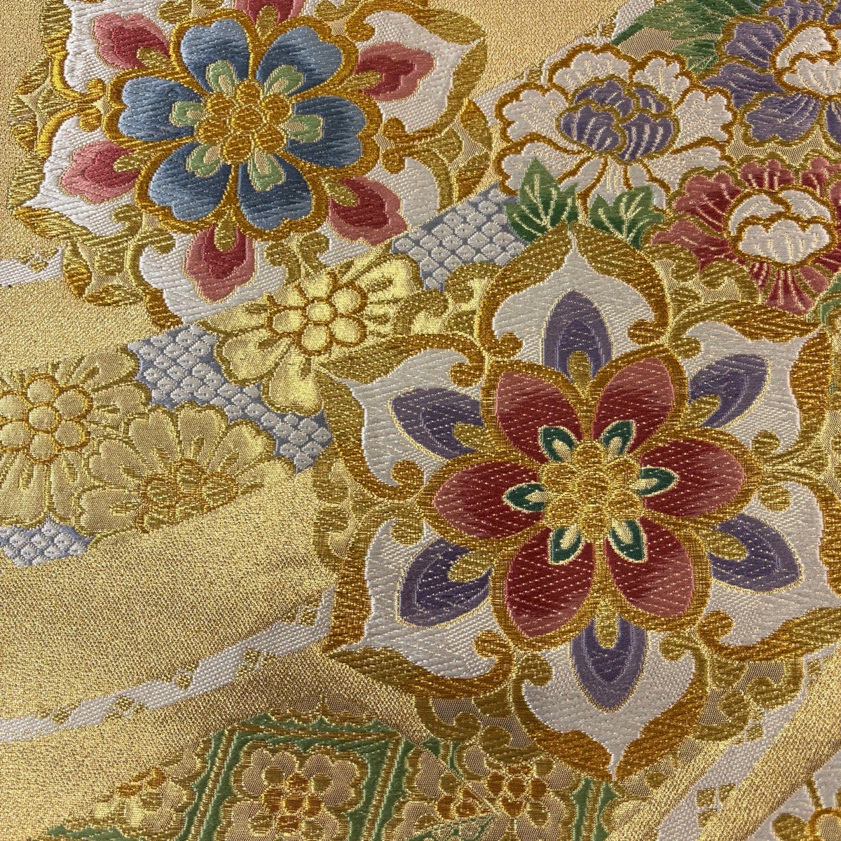 【美品】 袋帯 秀品 振袖向き 花 七宝 唐織 金糸 金色 六通 正絹