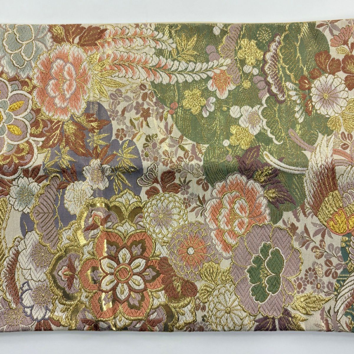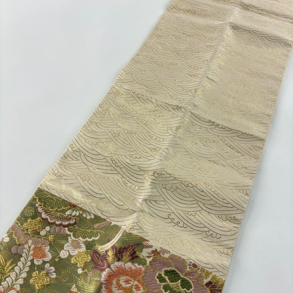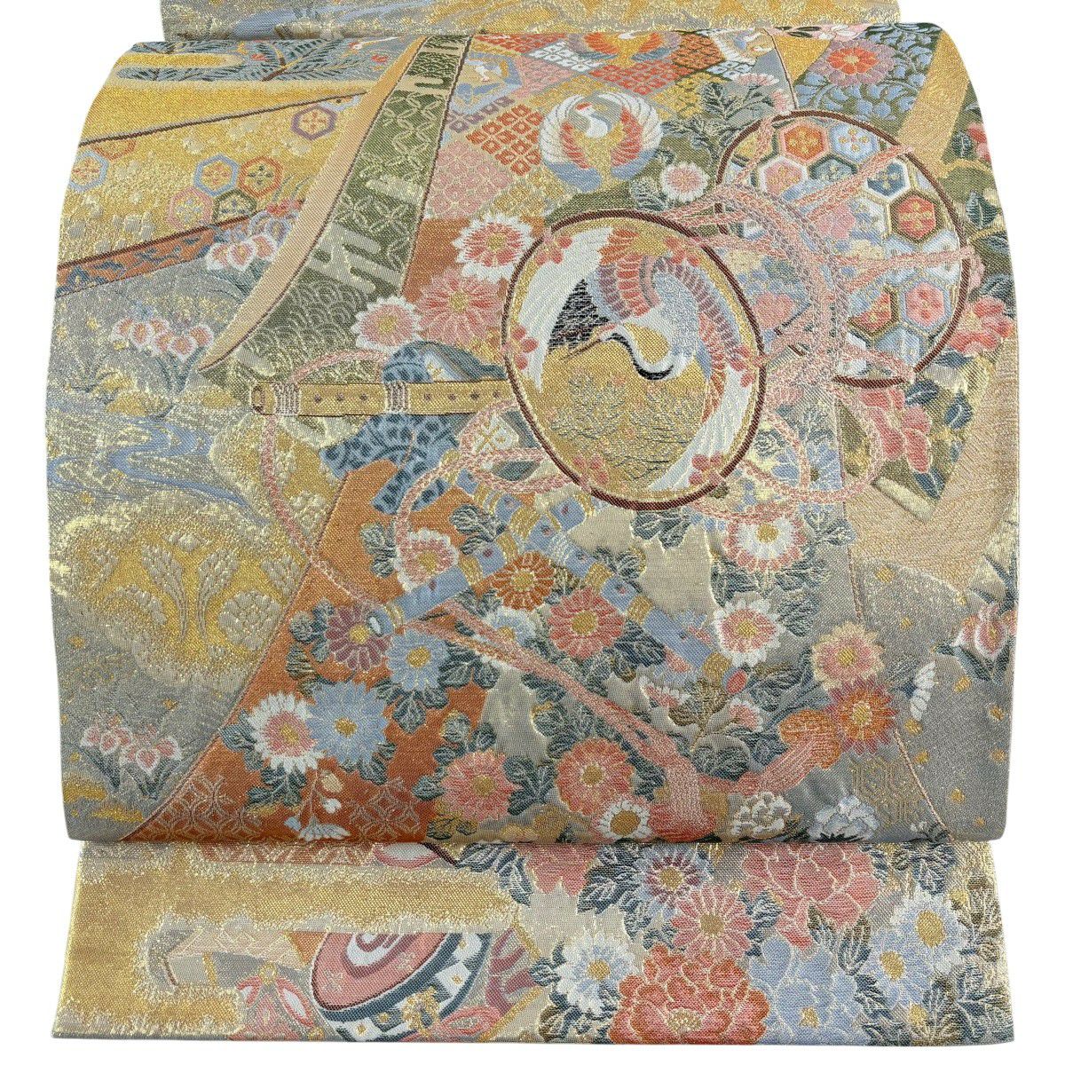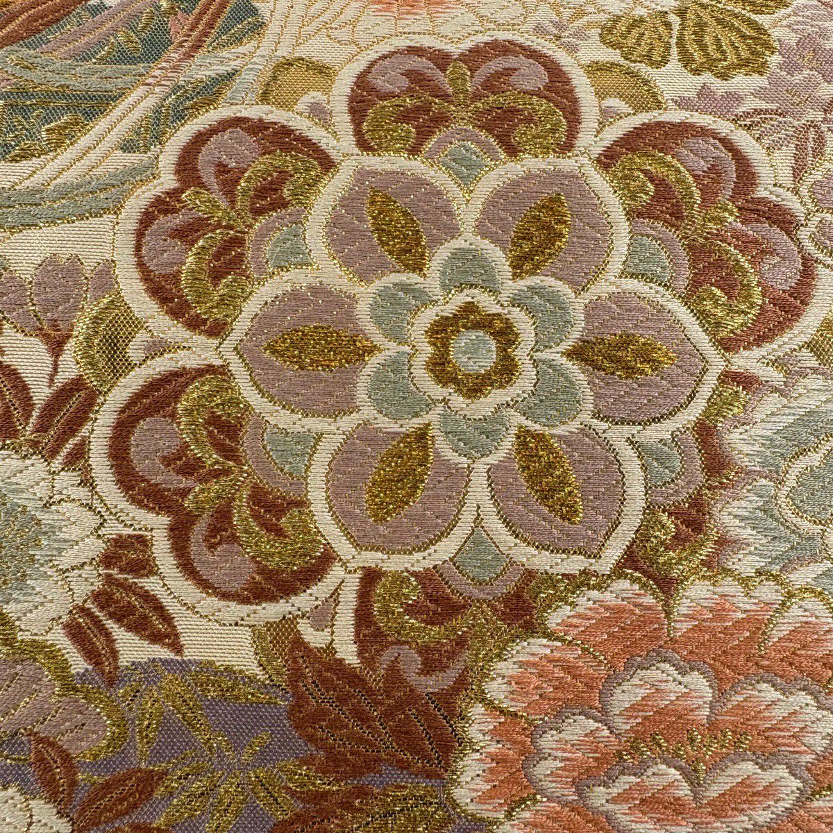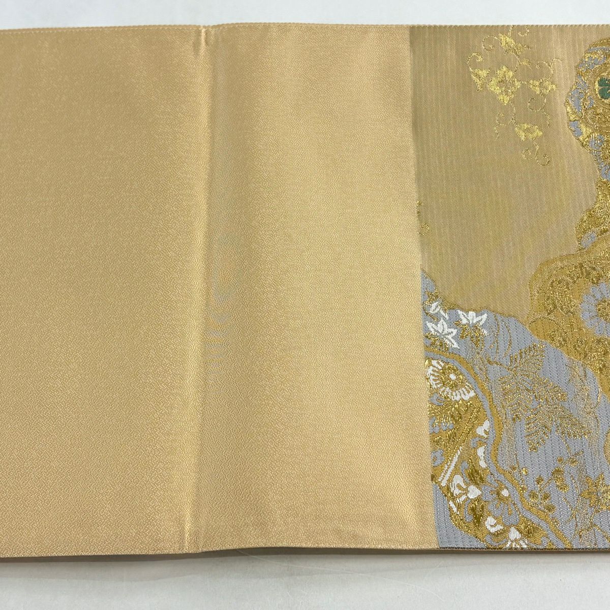 【美品】 袋帯 秀品 華文 花鳥 金糸 箔 ベージュ 六通 正絹