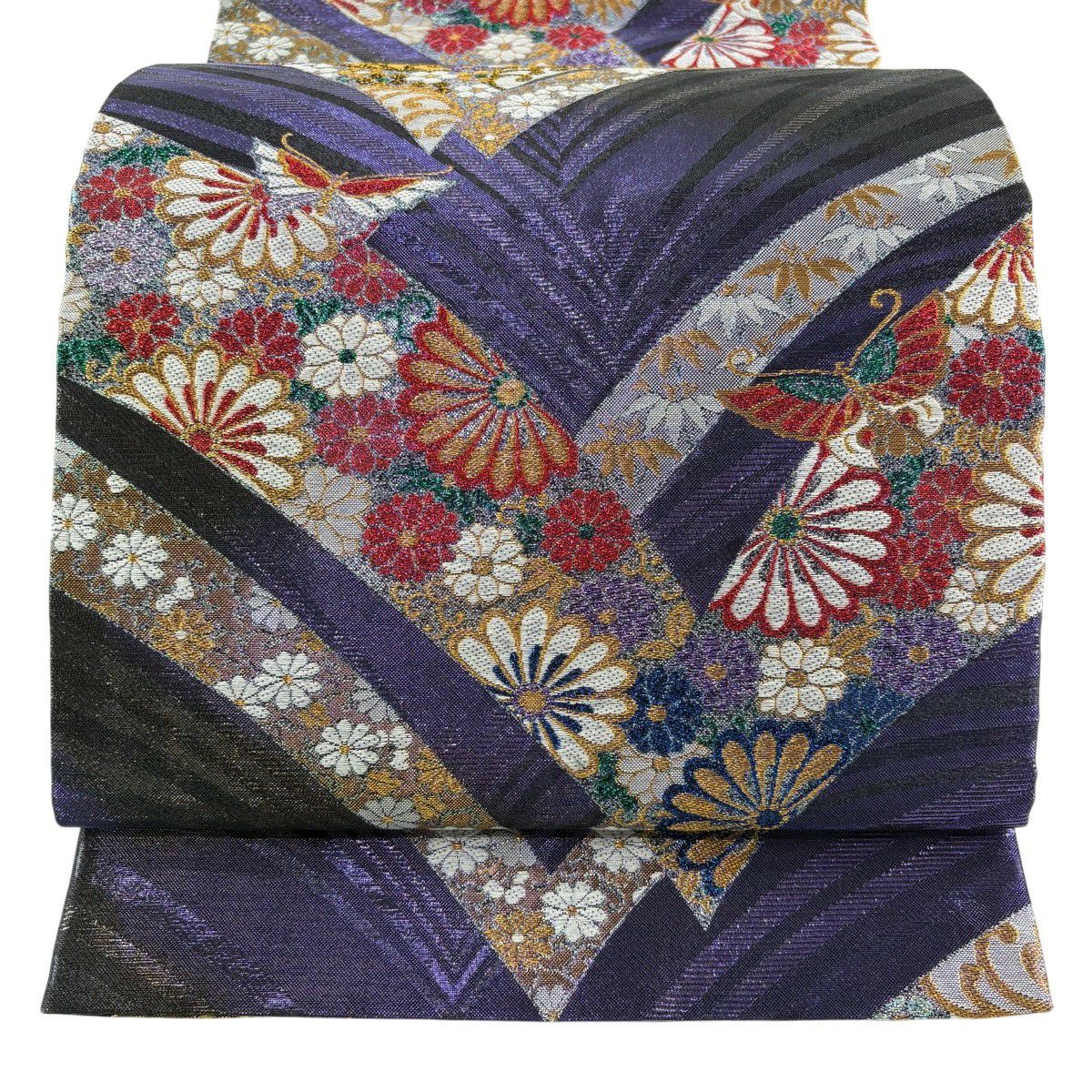 【美品】 袋帯 秀品 振袖向き 菊唐草 蝶 金糸 箔 紫 六通 正絹