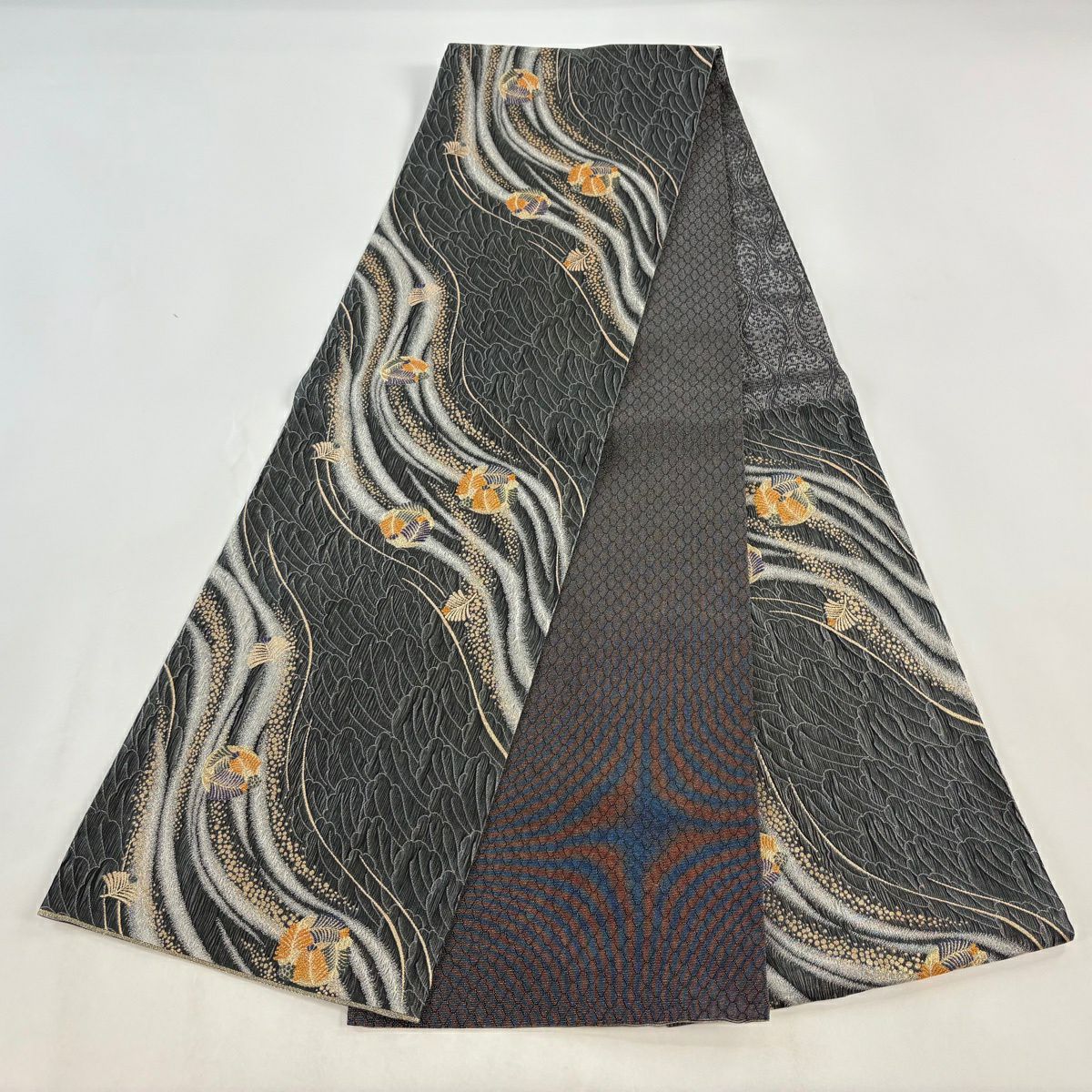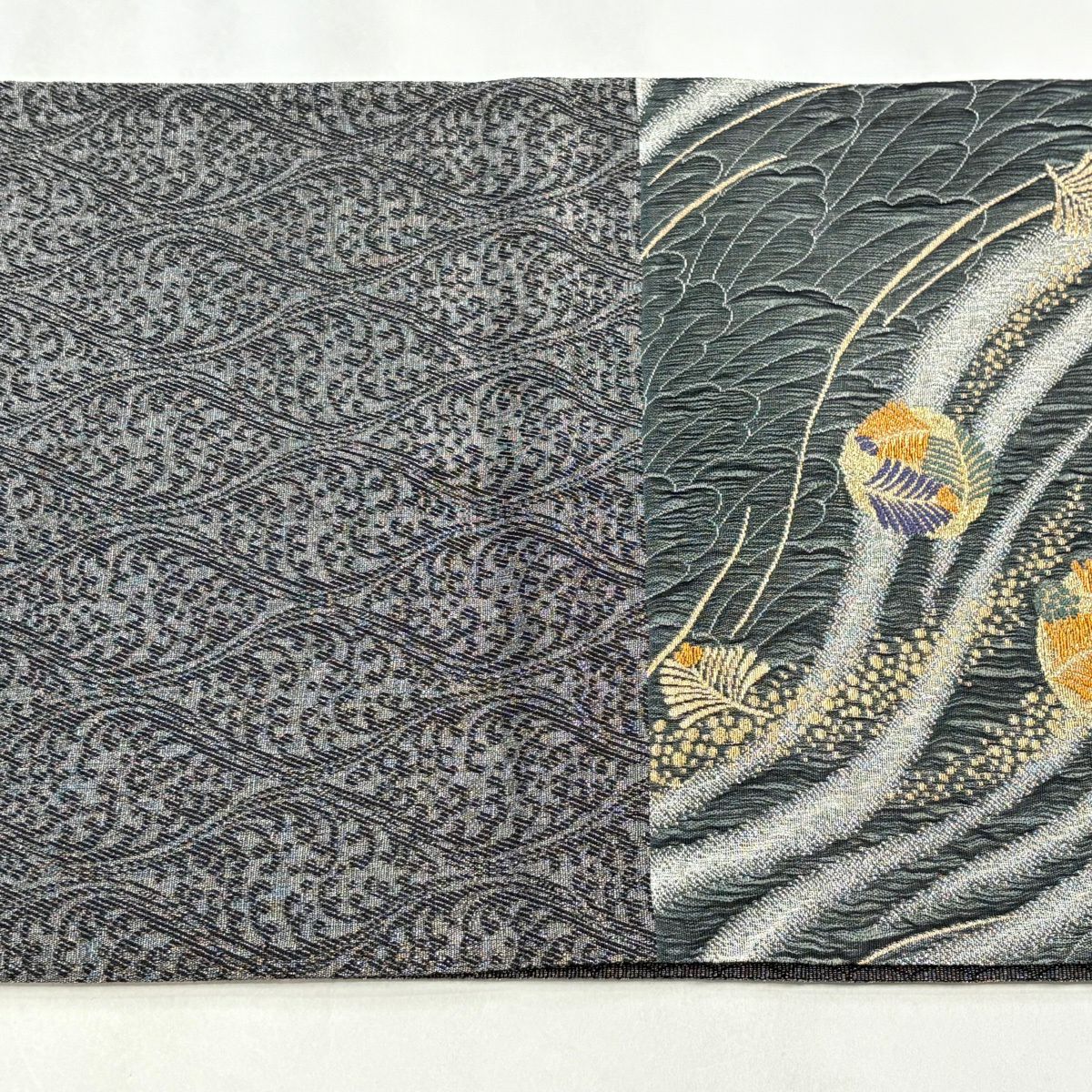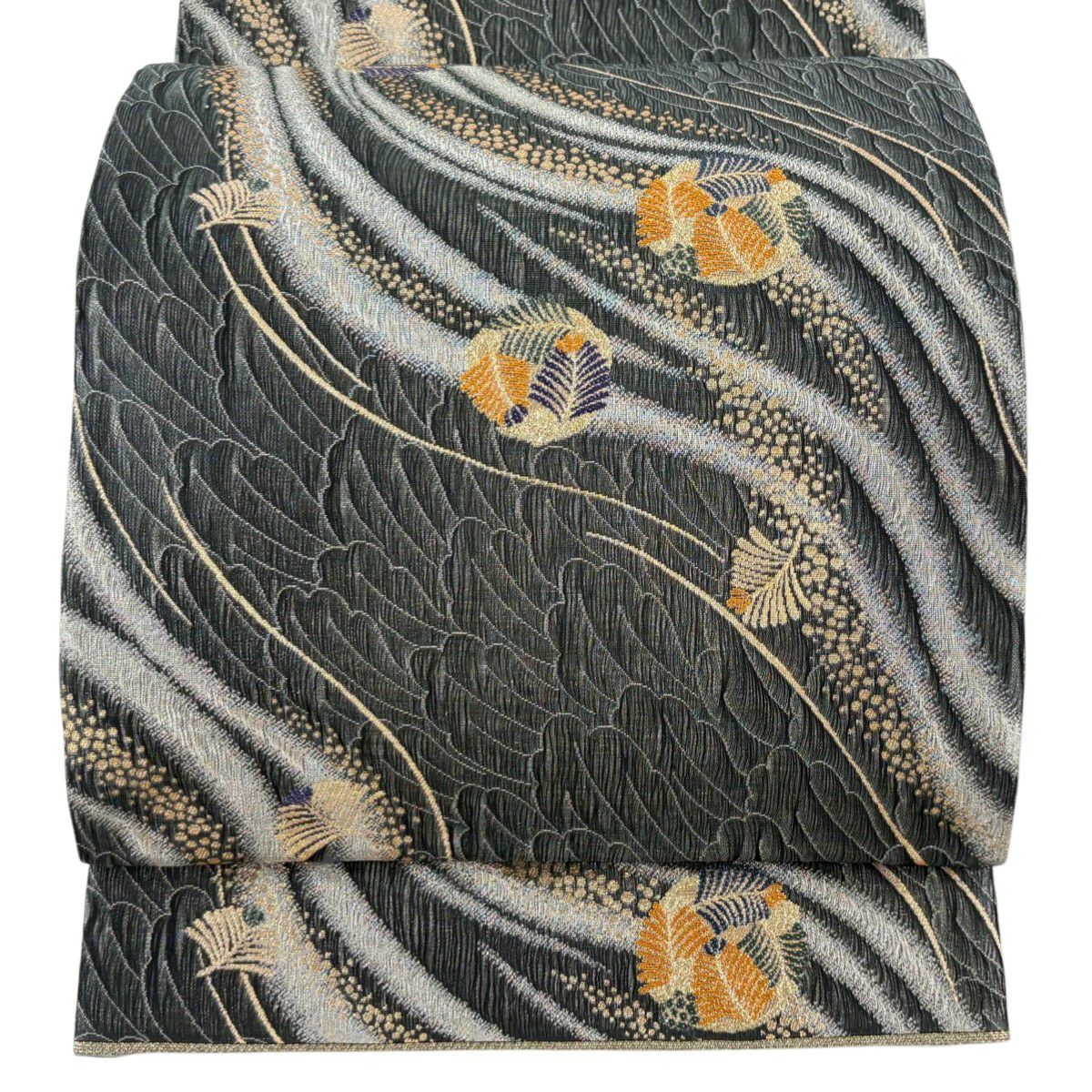 【美品】 袋帯 秀品 夏帯 若松 流水 金銀糸 箔 黒灰 六通 正絹