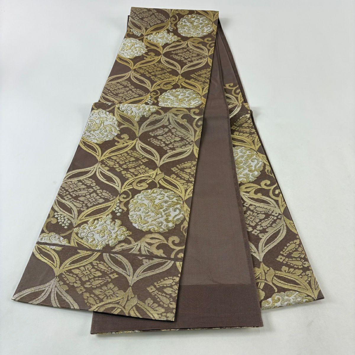 【美品】 袋帯 秀品 夏帯 絽 花鳥 花菱 金糸 箔 灰茶 六通 正絹
