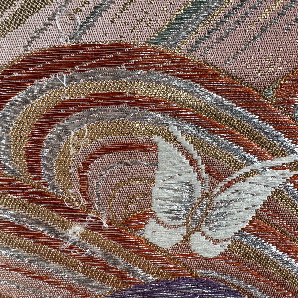 【美品】 袋帯 秀品 蝶 波 銀糸 箔 サーモンピンク 六通 正絹