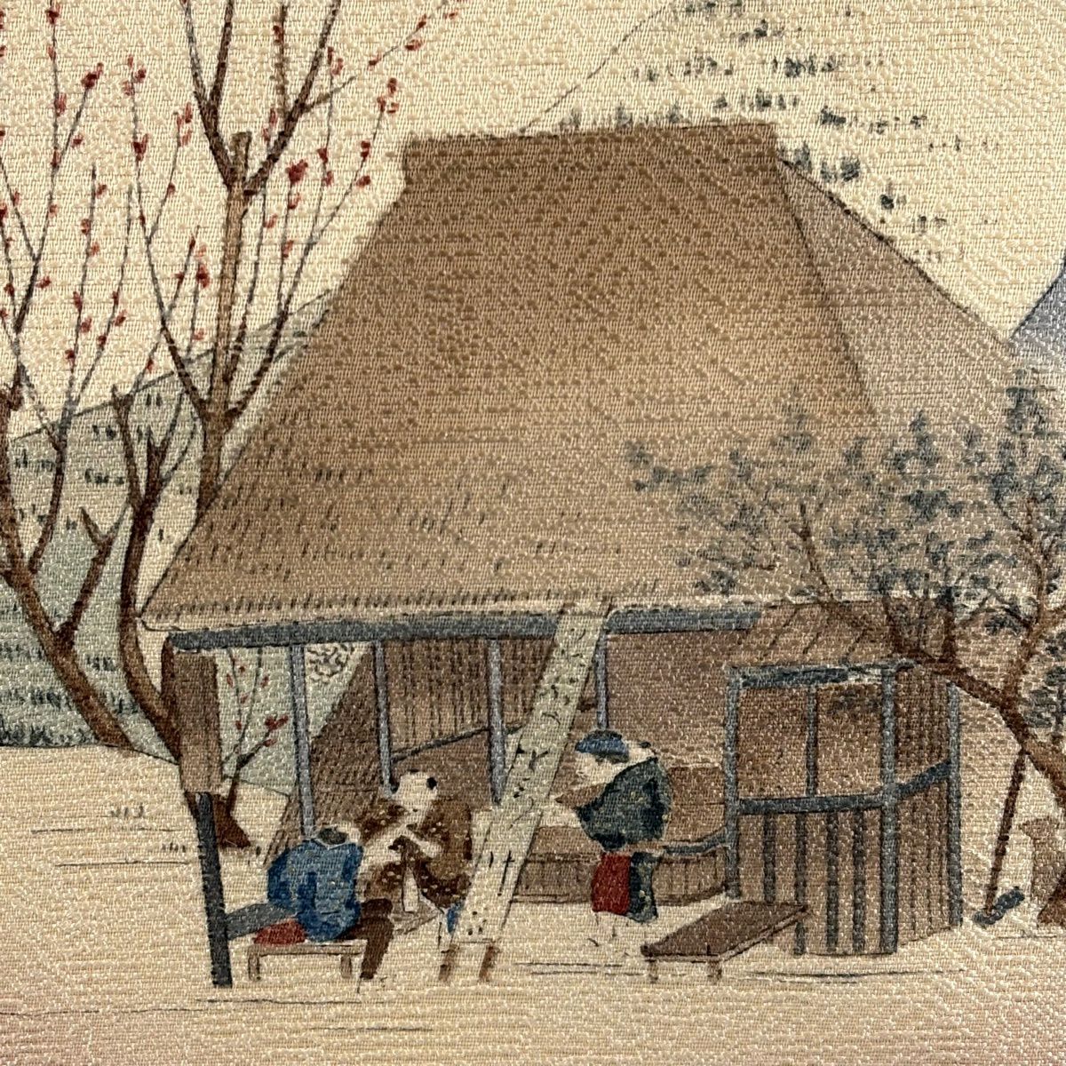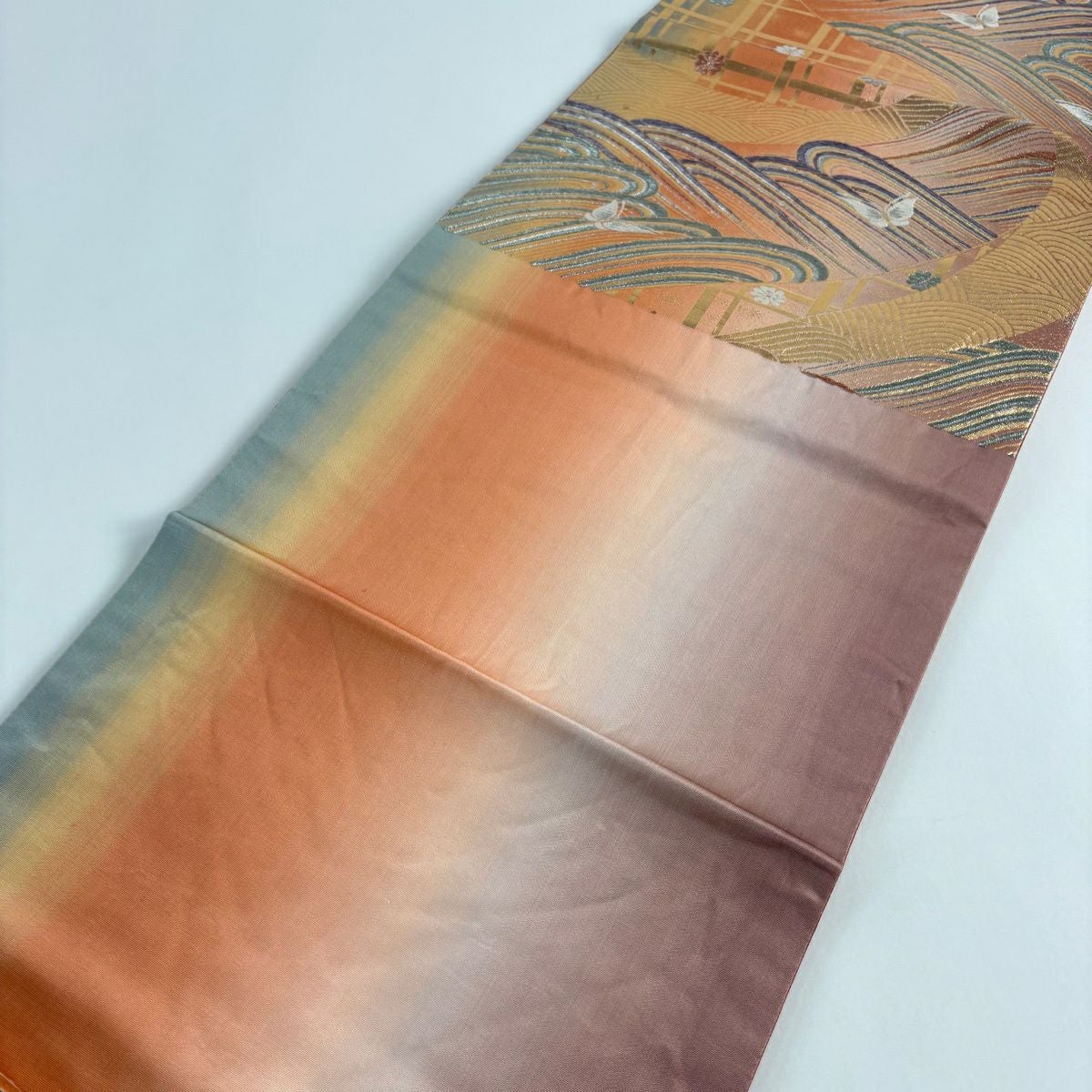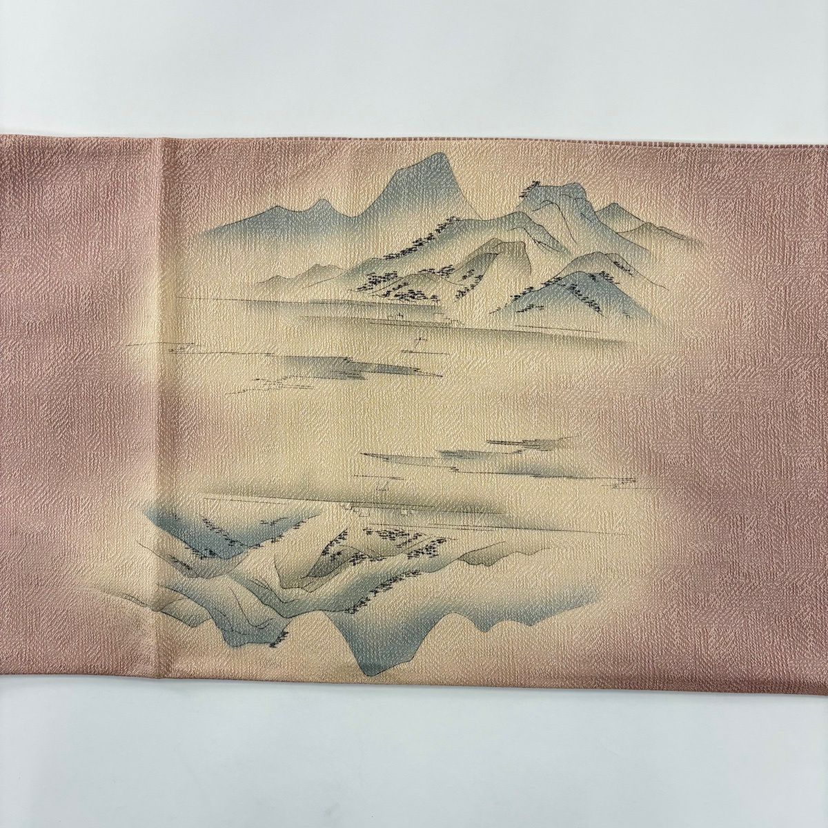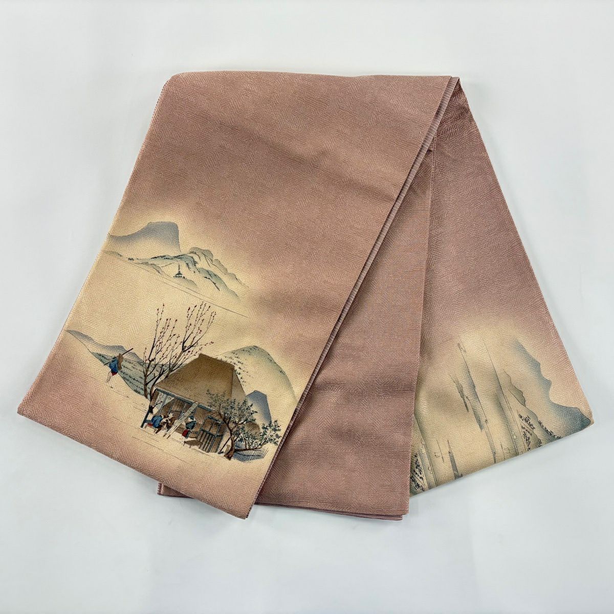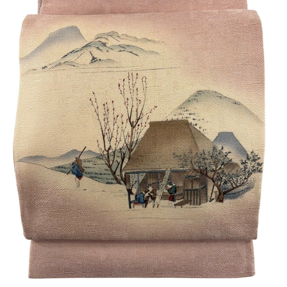 袋帯 秀品 風景 人物 ぼかし ピンクベージュ お太鼓柄 正絹