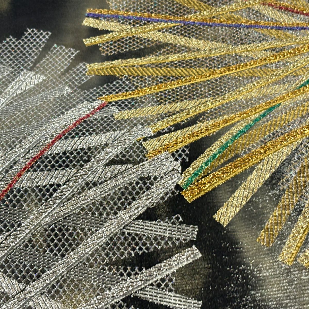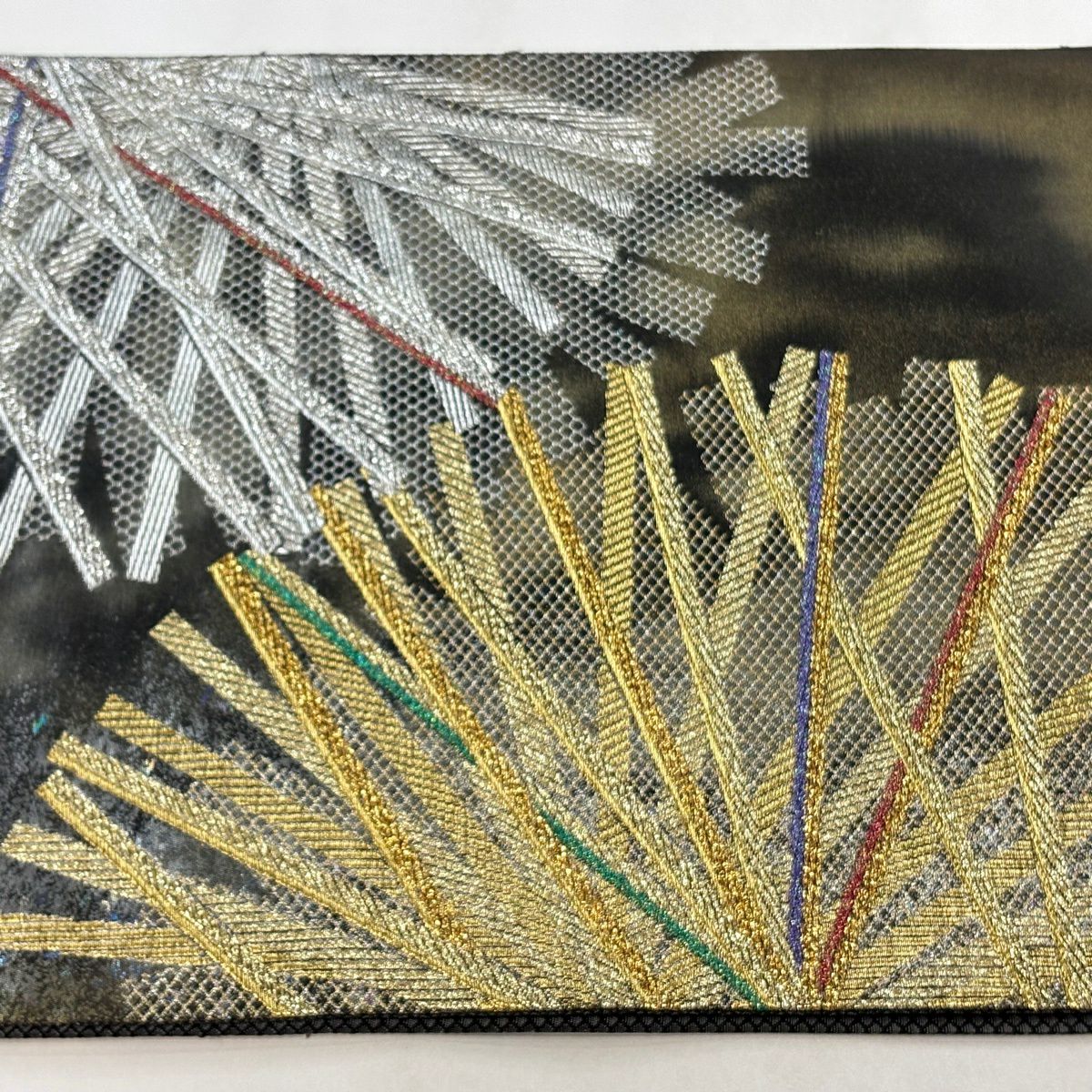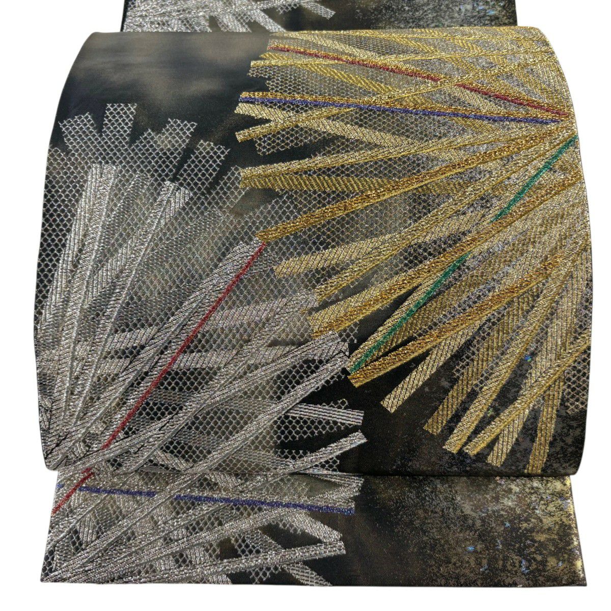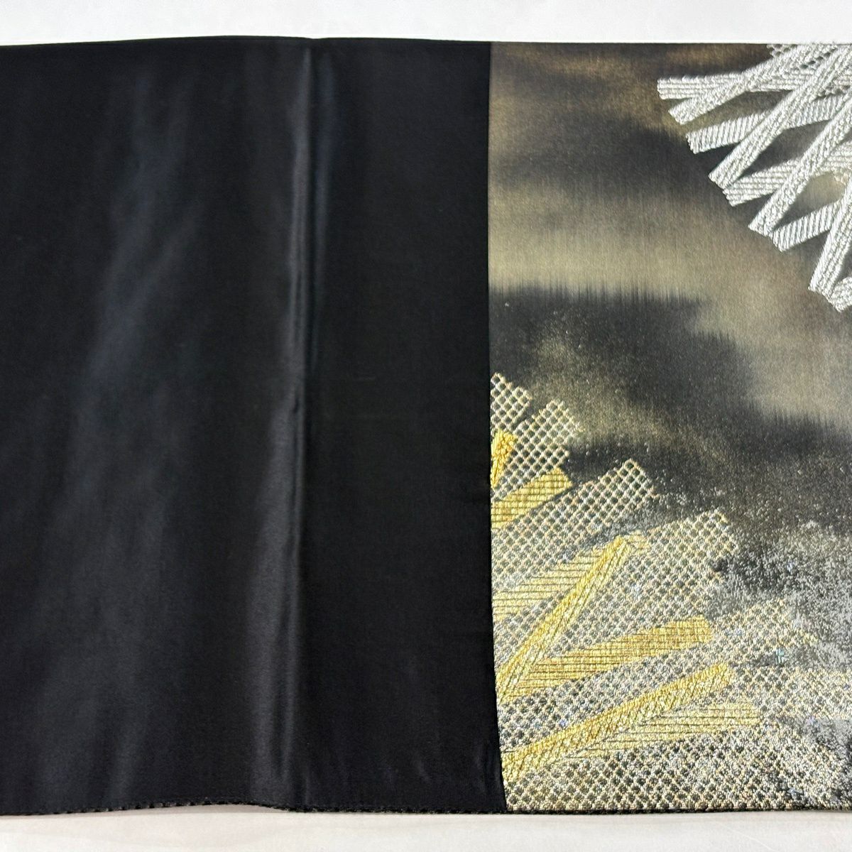 【美品】 袋帯 秀品 振袖向き 幾何学 金銀糸 箔 墨色 六通 正絹