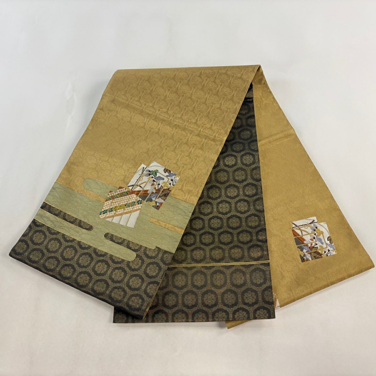 【美品】 袋帯 秀品 全通袋帯絵巻 鼓 誰が袖 金糸 箔 金色 全通 正絹