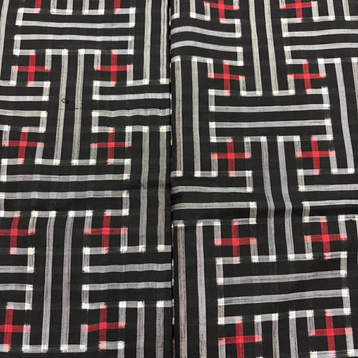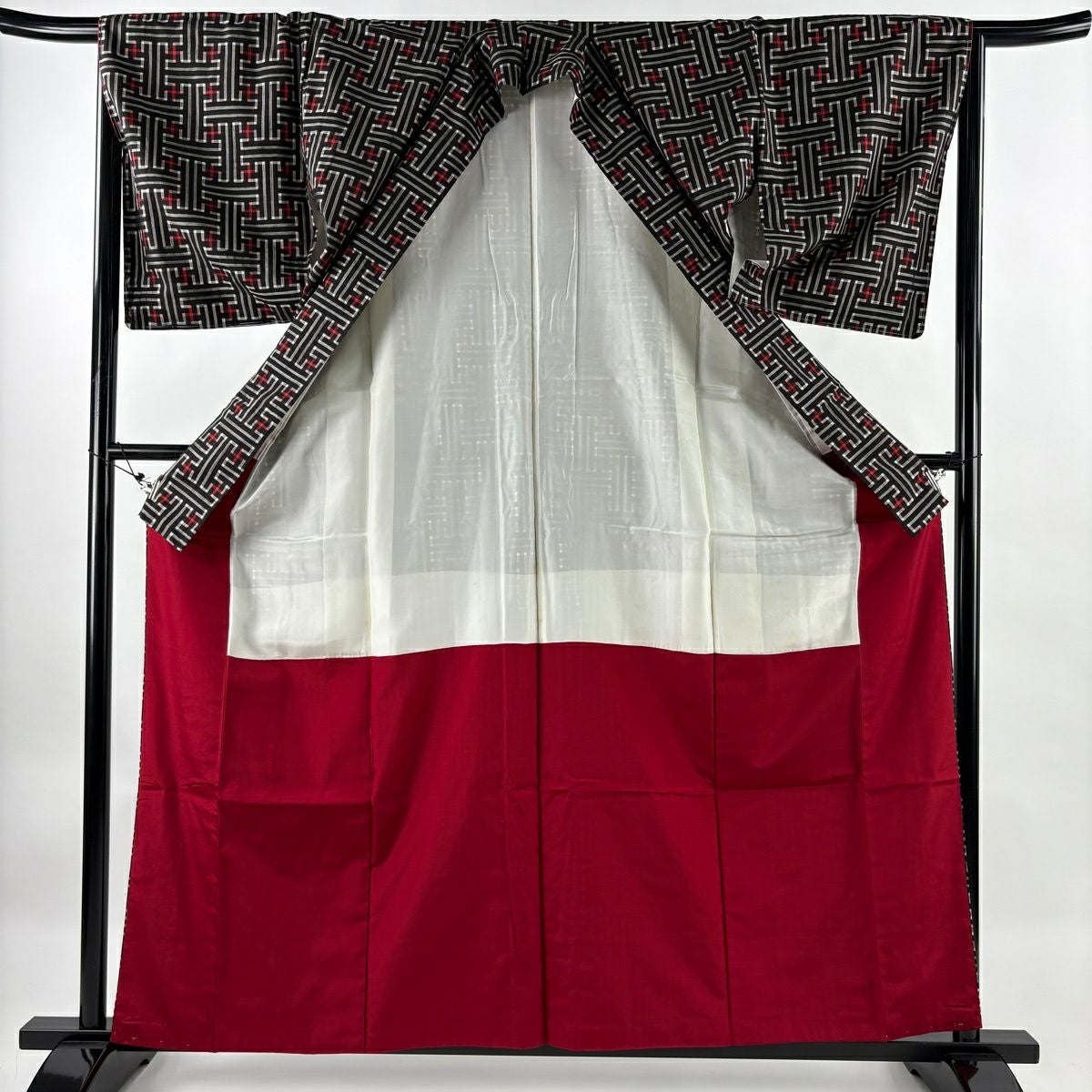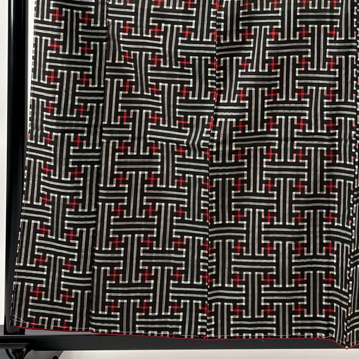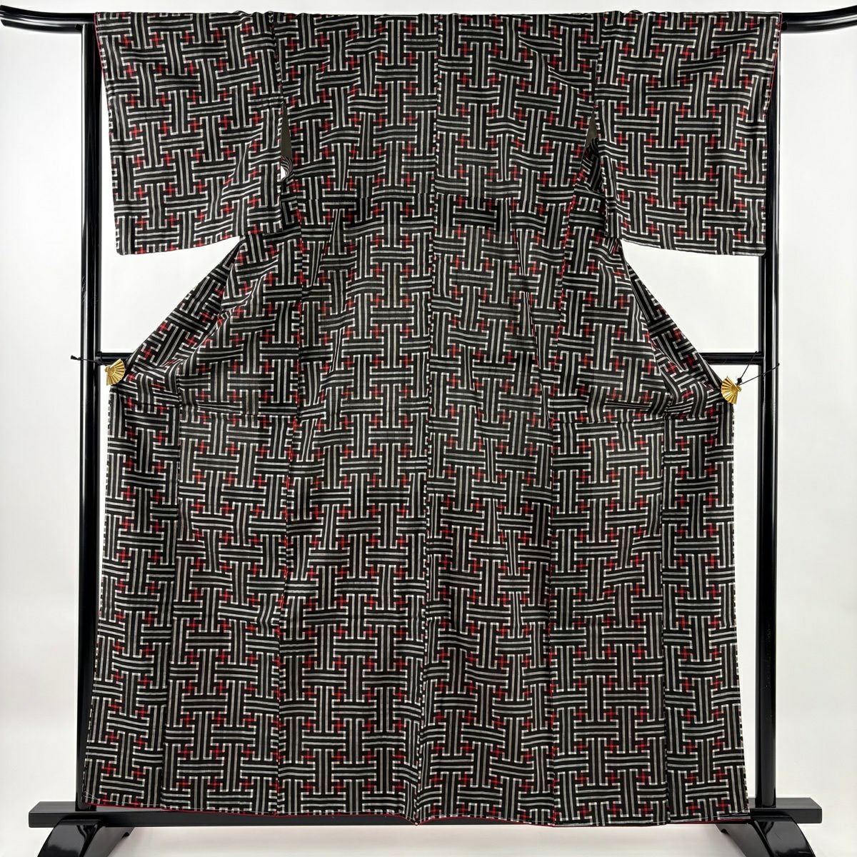 紬 身丈162cm 裄丈66cm M 袷 幾何学模様 墨色 正絹 秀品